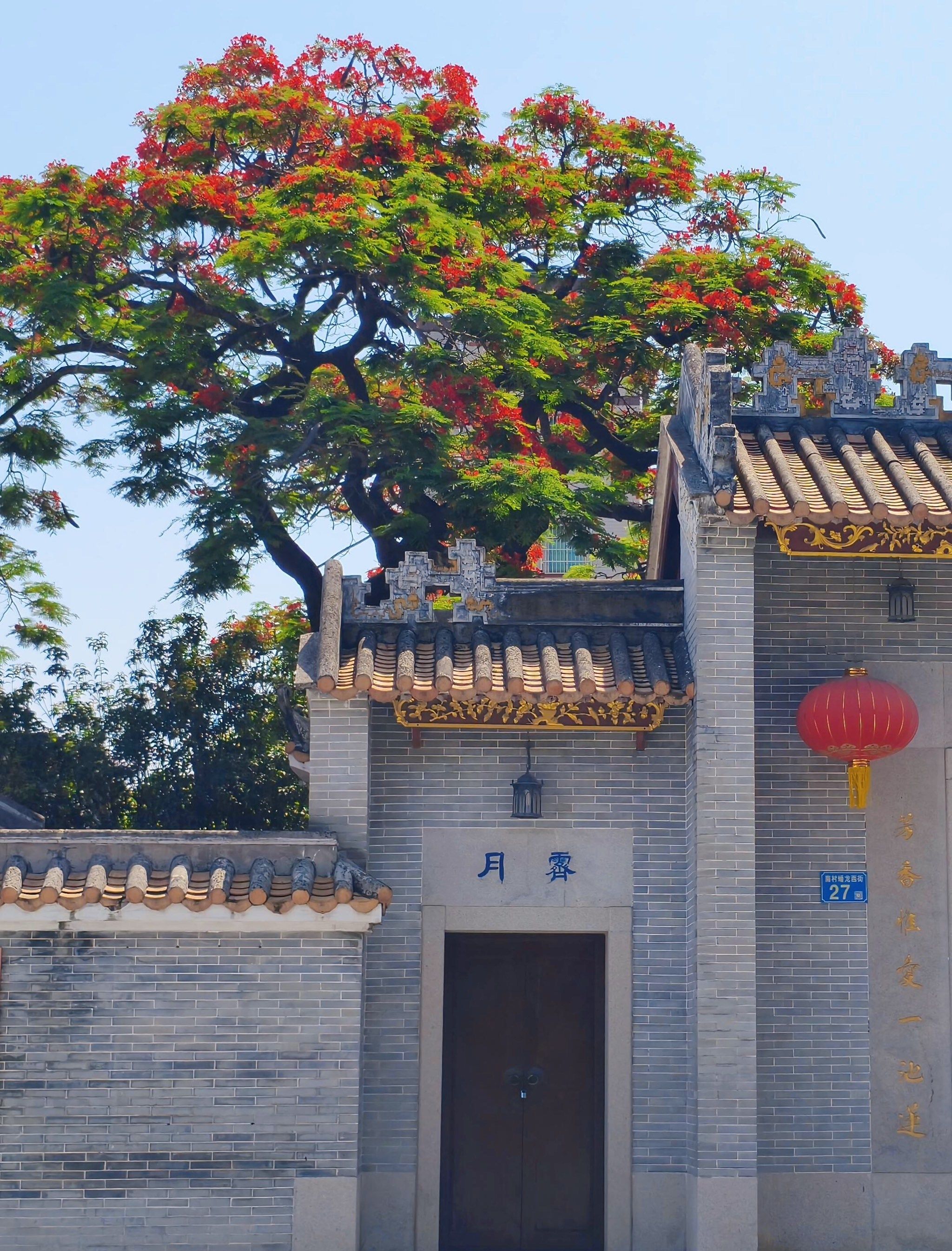 宗祠大门前:以几尊雕像为前景,将凤凰花和祠堂作为背景,拍出层次感。