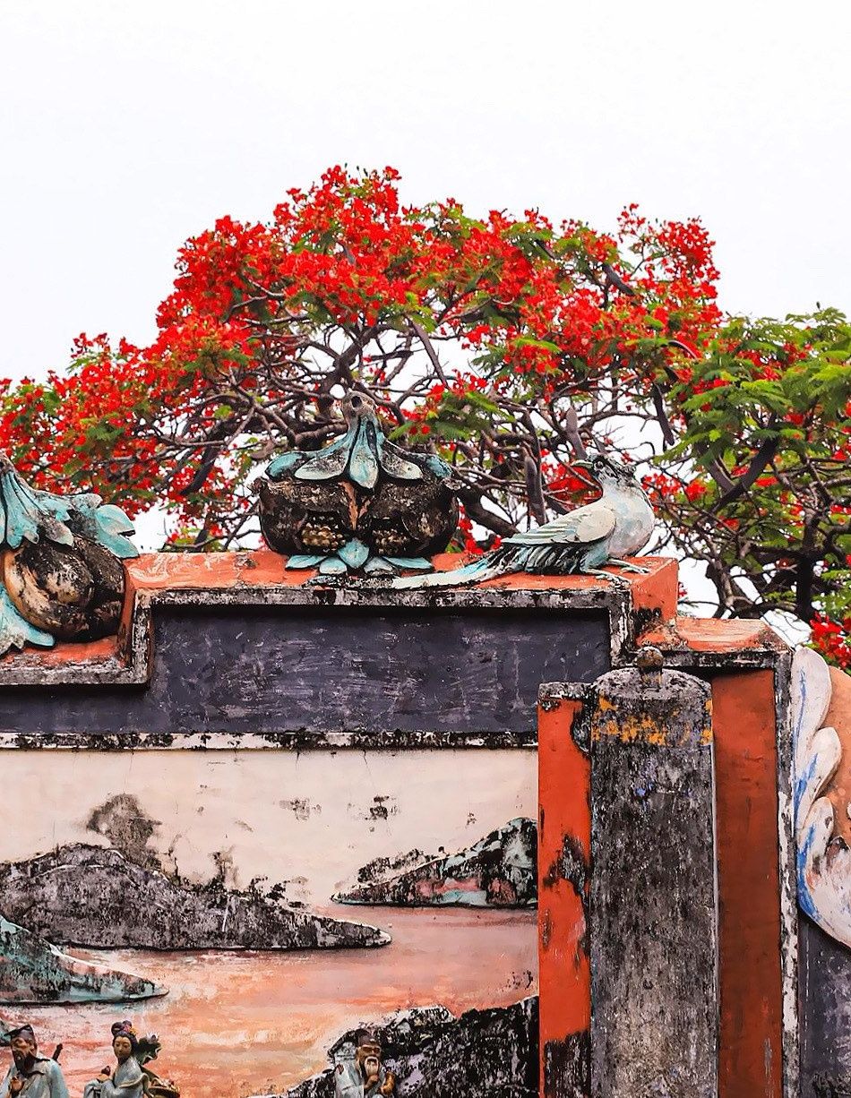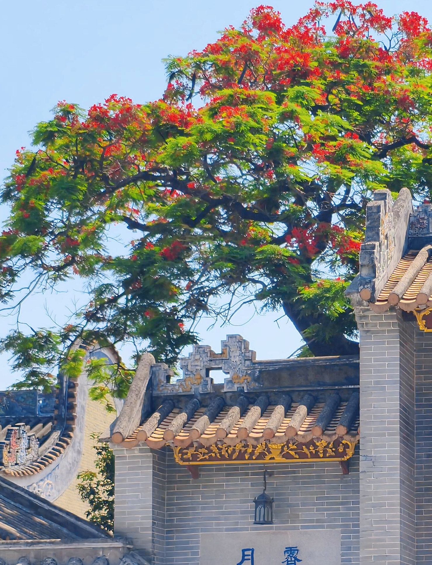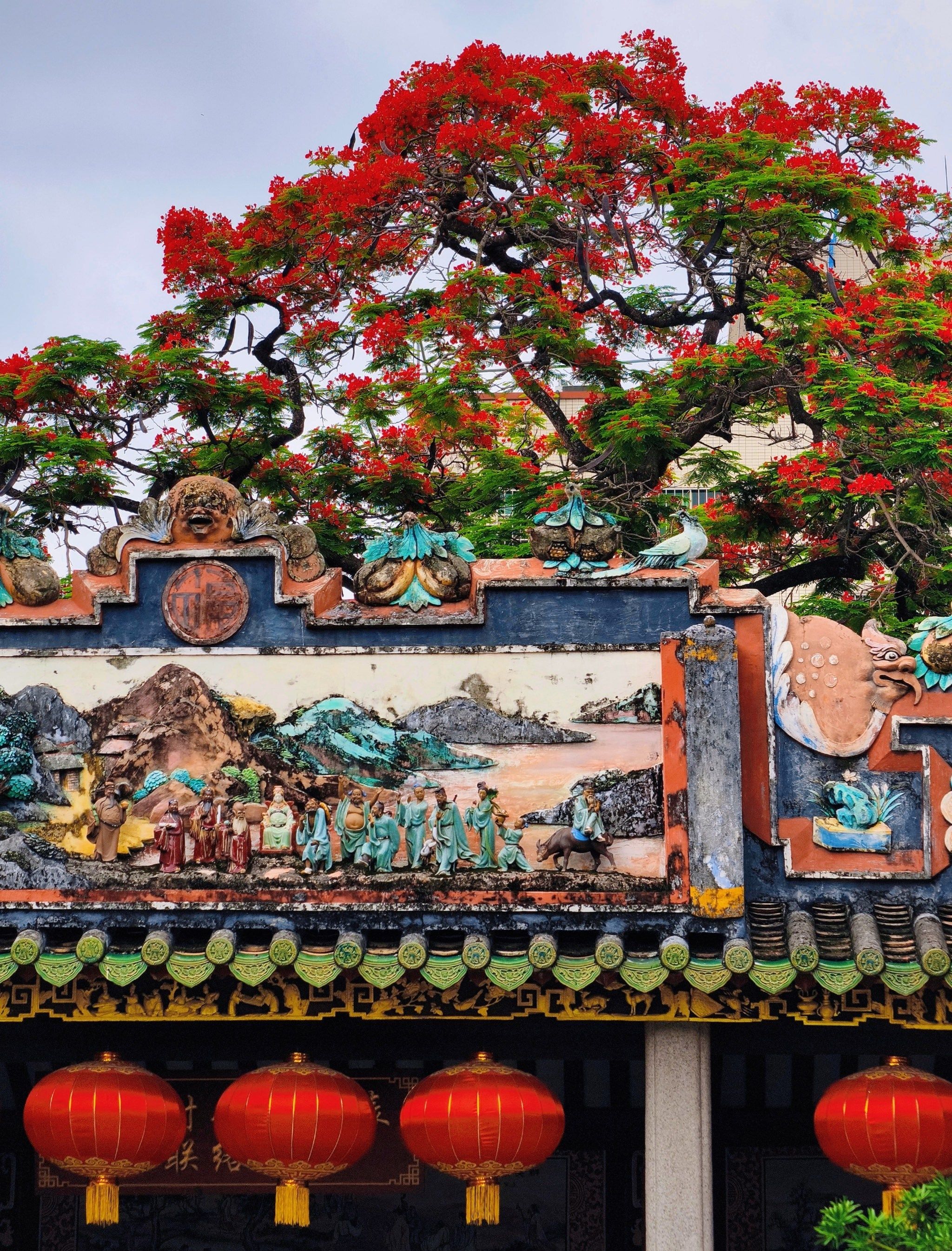 周氏大宗祠:始建于明末清初,建筑精美,木雕、砖雕、石雕工艺精湛。祠堂内及旁边颐园的凤凰木花开正艳,与古建筑相得益彰。