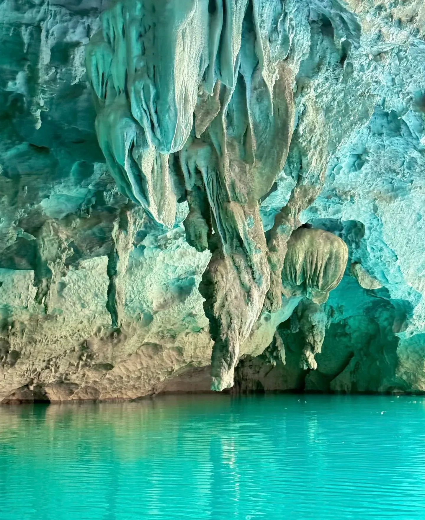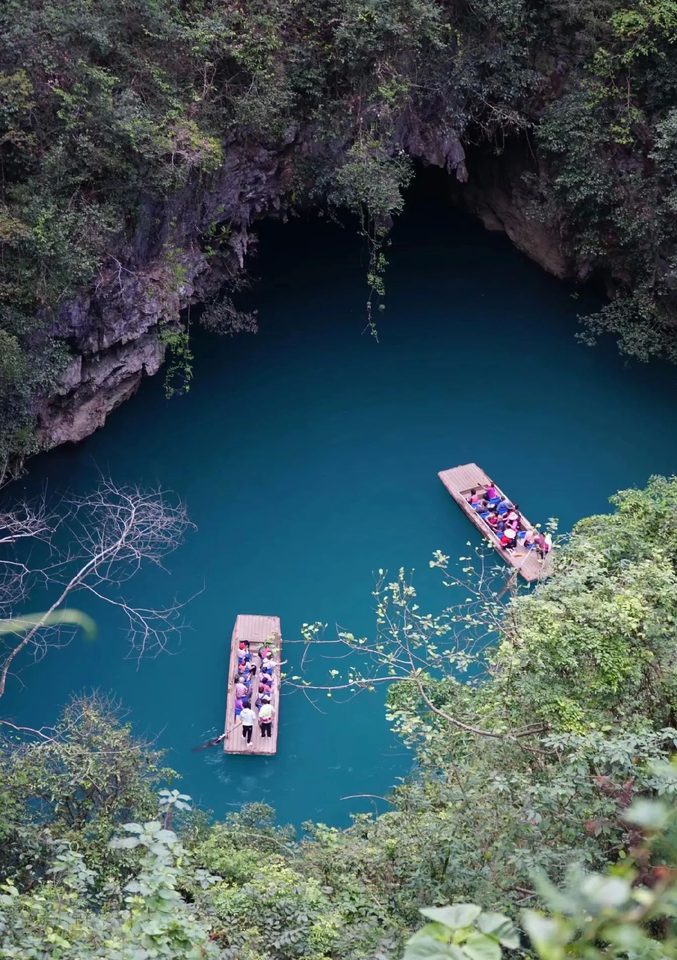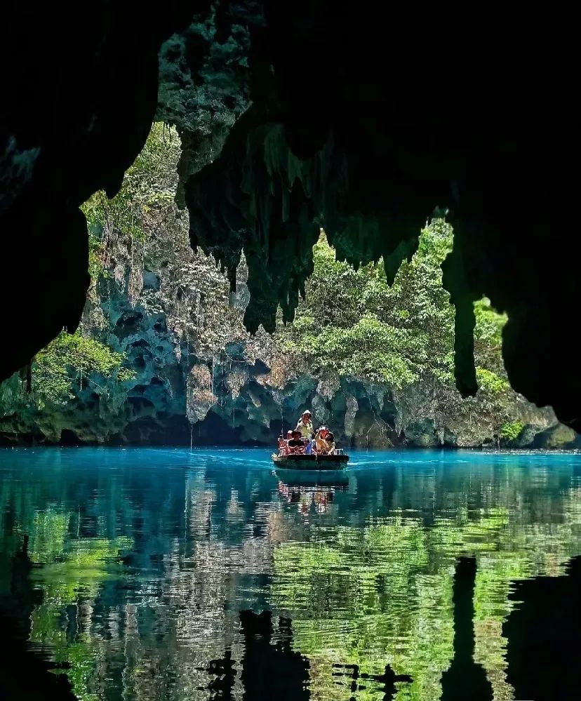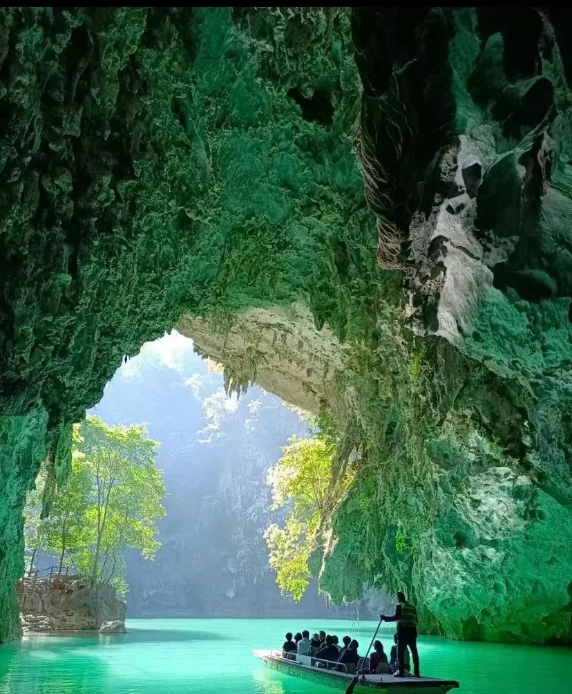 乘船穿越7个“天窗”相连的水上洞穴,蓝绿色河水如翡翠秘境。