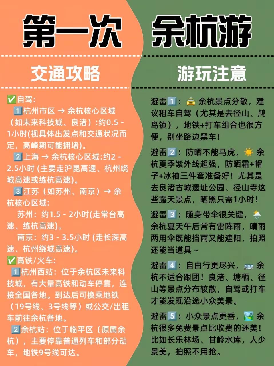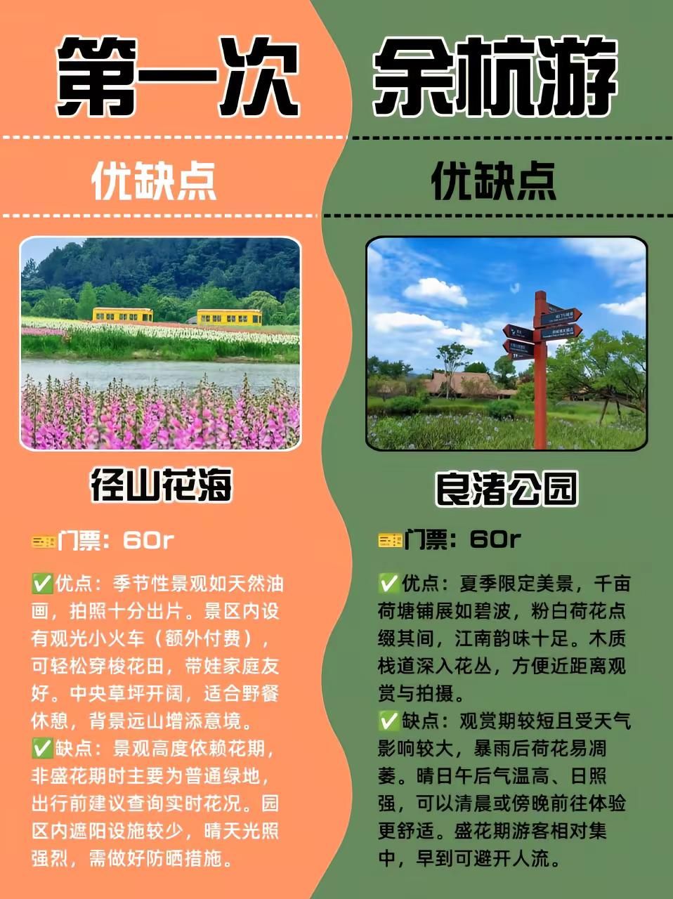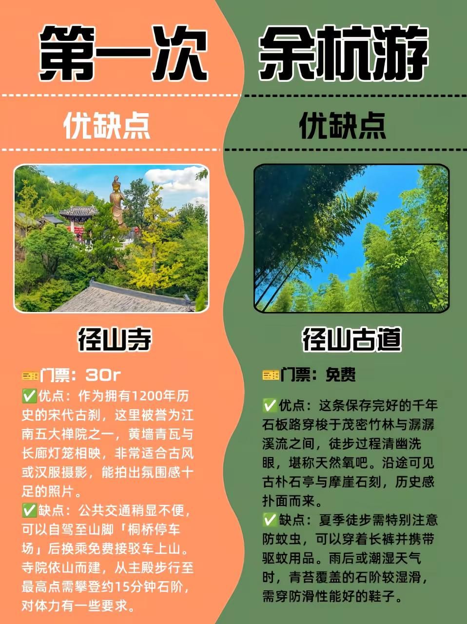 来余杭旅游请接收这份攻略~-1. 径山寺门票:30r优点:是江南五大禅院之一,寺内建筑古朴庄严,有着深厚的佛教文化底蕴。缺点:位置相对偏远,公共交通不太方便,自驾山路弯道较多,新手驾驶需谨慎。2. 径山古道门票:免费优点:是一条历史悠久的古道,沿途竹林茂密、溪水潺潺,空气清新,适合徒步爱好者。缺点:部分路段较为陡峭,徒步有一定难度,需要穿舒适的运动鞋。3. 径山花海门票:60r优点:不同季节有不同的花卉绽放,花海规模大,色彩绚丽,是拍照打卡的好地方。缺点:花期受季节限制,非花期时景色相对一般。节假日游客较多,拍照容易有路人入镜。4. 良渚古城遗址公园门票:60r(含观光车)优点:是实证中华五千年文明史的圣地,能看到壮观的古城遗址、水利工程遗迹等,同时还能感受荷花的魅力。缺点:园区面积非常大,步行游览很累,观光车虽包含在门票内,但站点之间距离远,等车时间较长。5. 麻车头村门票:免费优点:是一个村落,有着古典的江南水乡风貌,村边有河流、稻田,田园风光浓郁,适合放松心情、体验乡村生活。缺点:旅游开发程度较低,配套设施不完善,餐饮、住宿选择少。6. 长乐林场门票:免费优点:有着大片的树林,秋冬季节树叶变色后,景色格外美丽,红枫、银杏点缀在林间,宛如童话世界。缺点:林场内部分区域路况较差,自驾车辆需注意。节假日可能会有较多人露营,需要提前抢占好位置。-#余杭攻略#假期去哪儿玩#老径山#余杭美食