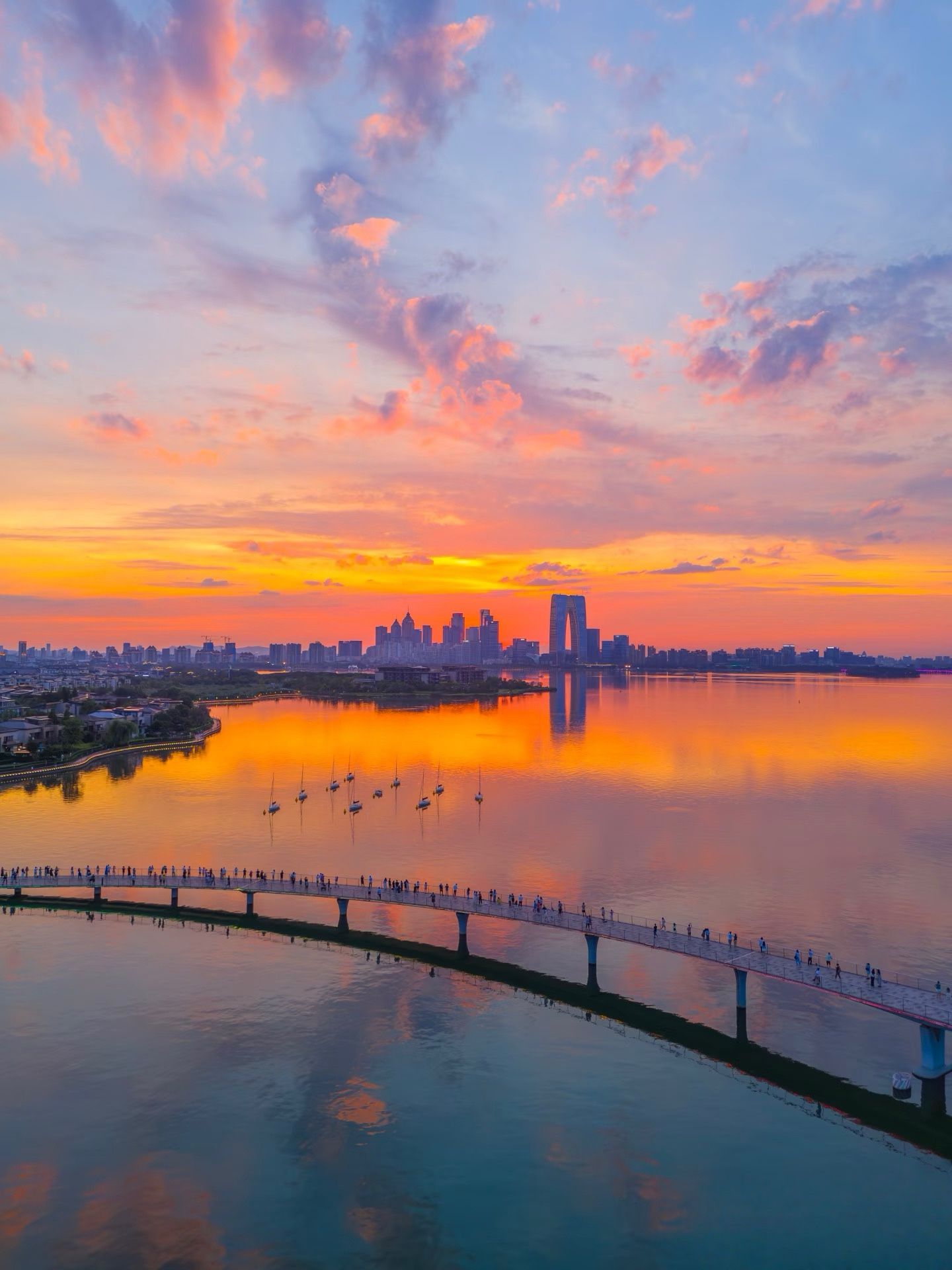 来到春到湖畔广场,静候一场绝美的日落,然后到大裤衩(苏州标志性建筑东方之门)下拍照打卡。运气好的话,还能蹲到晚上 7:30 的音乐喷泉,感受一场视听盛宴。