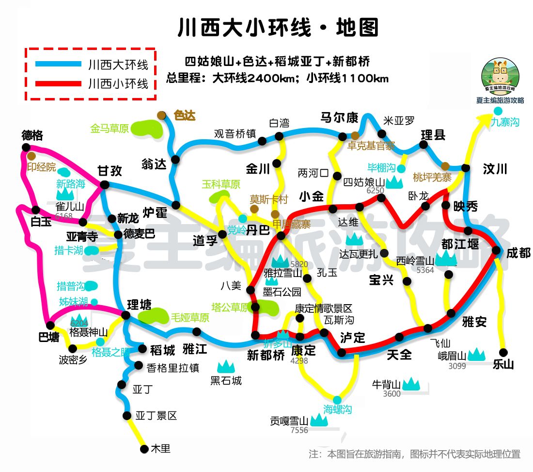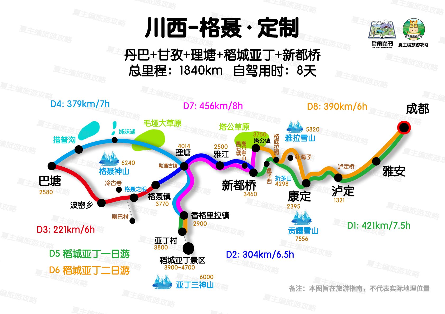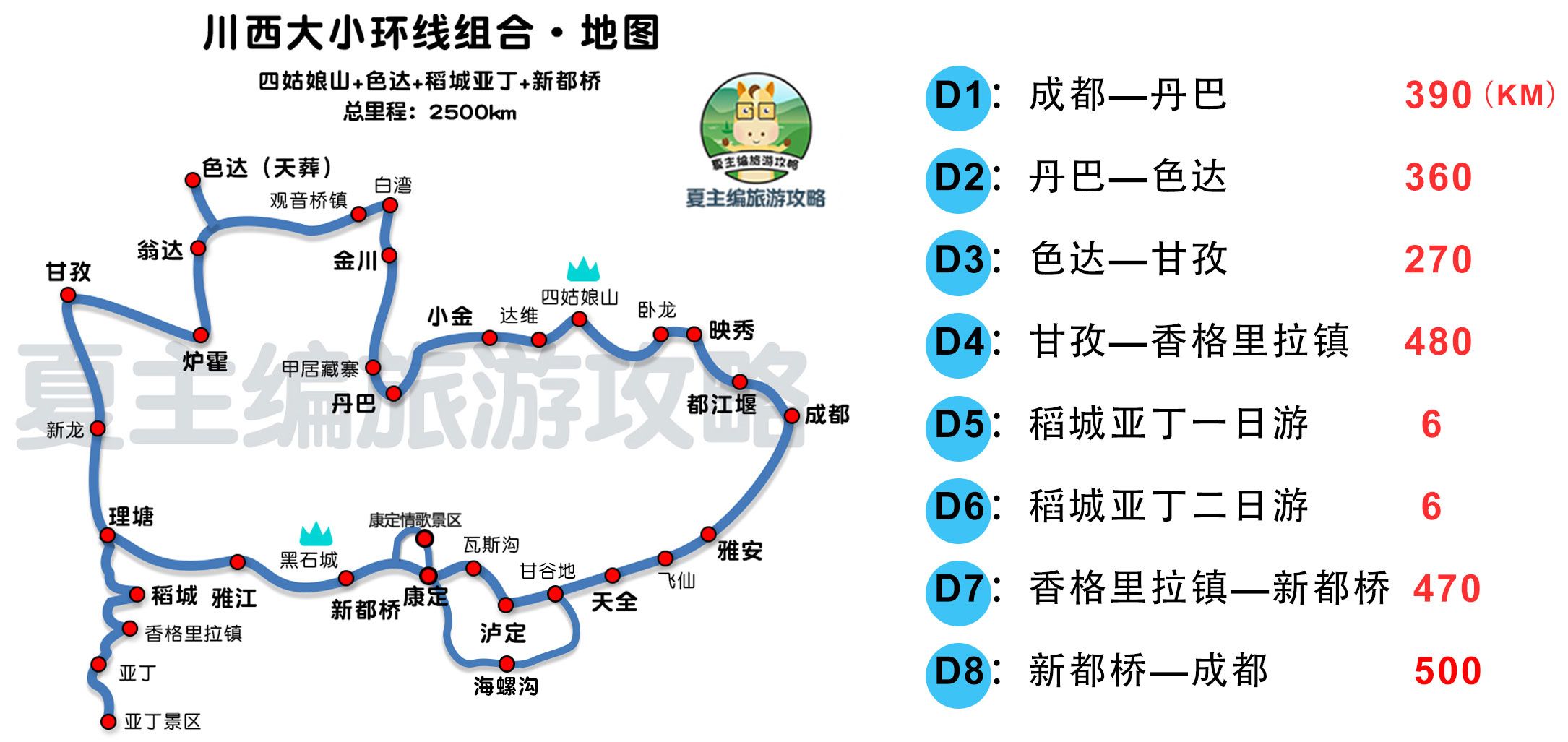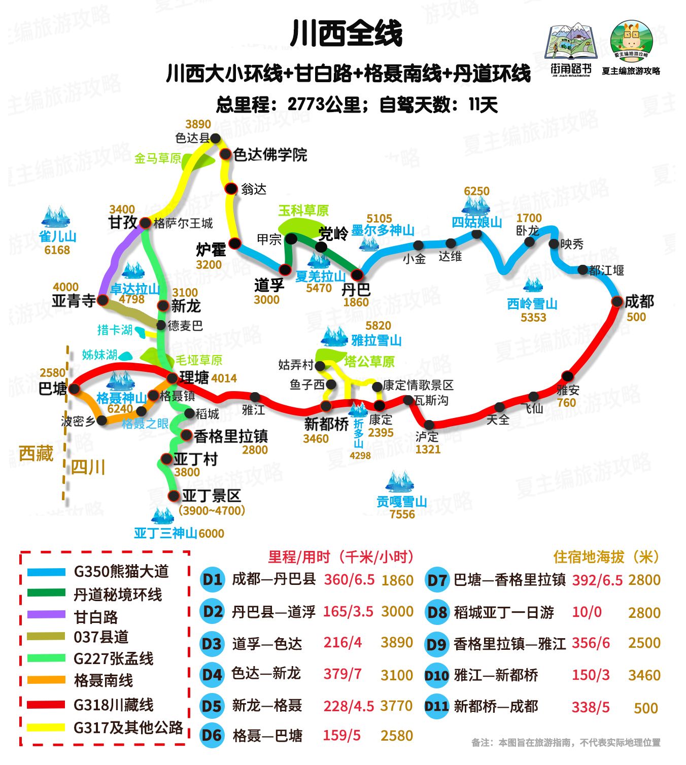 基础11天线路规划为:成都丹巴道孚色达新龙格聂巴塘香格里拉镇亚丁村雅江新都桥成都。