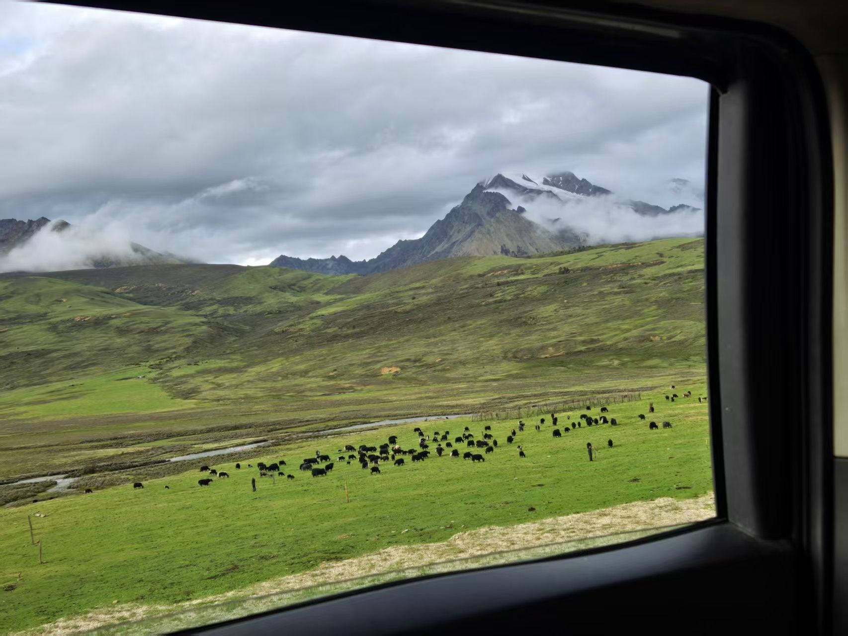 道路蜿蜒穿过云海蒸腾,巍峨的雪峰仿佛近在咫尺,其次是层峦叠嶂的青峰黛墨,连绵起伏的山腰下,密密麻麻开满了高原格桑花,微风吹来,花枝影影曳曳。青绿幽碧的草地上,牦牛群懒散地在草甸上食苹进食,溪水则宽谷曲流,延宕不息,倒映着群山、蓝天、白云与皑皑雪峰。