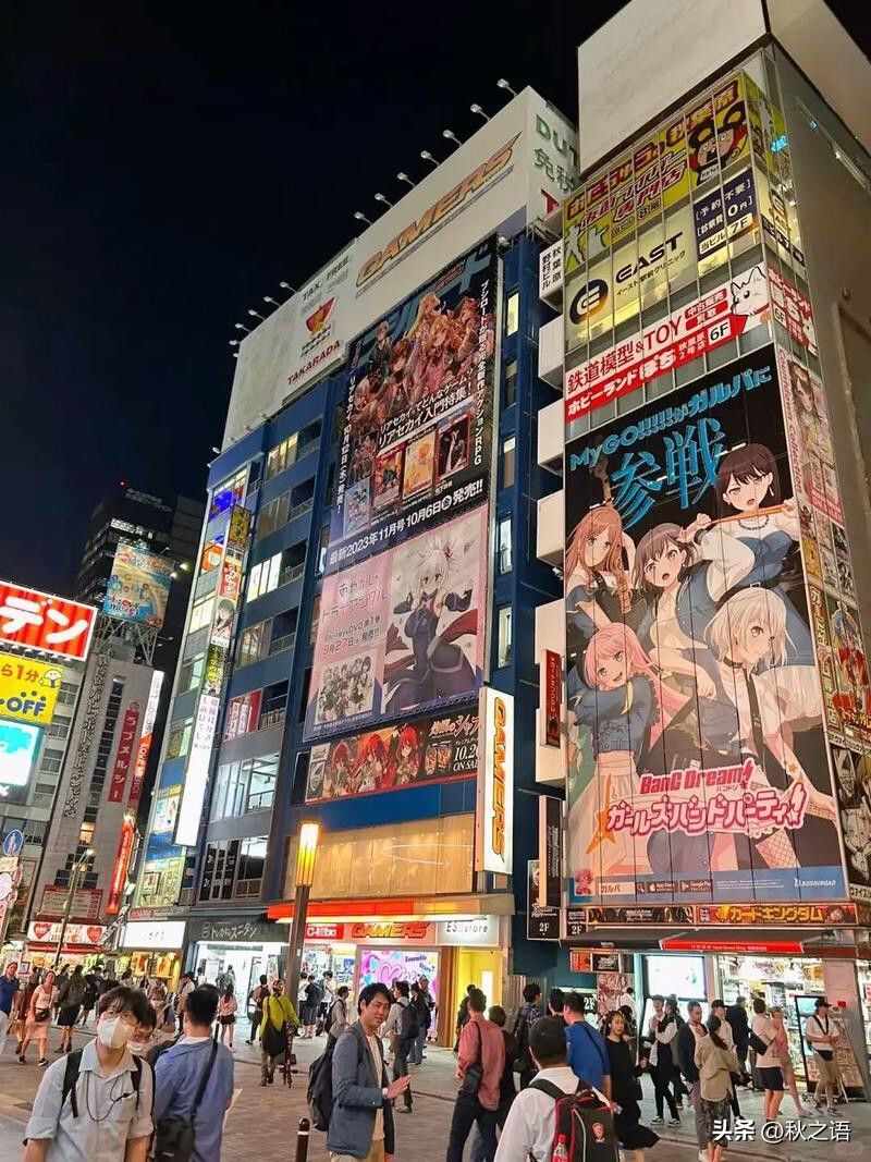 道顿堀是大阪最繁华的商业区之一,也是美食和购物的天堂。夜晚华灯初上,街道两旁的霓虹灯招牌和巨型广告牌亮起,尤其是“蟹道乐”的大螃蟹招牌格外引人注目,营造出热闹非凡的氛围。