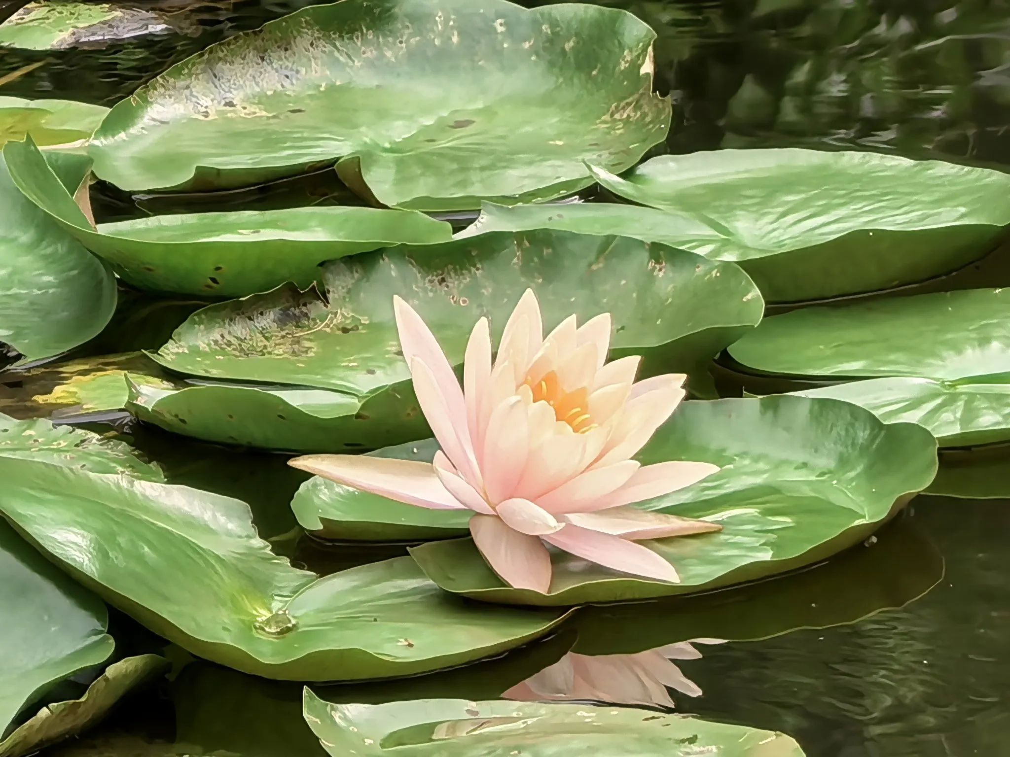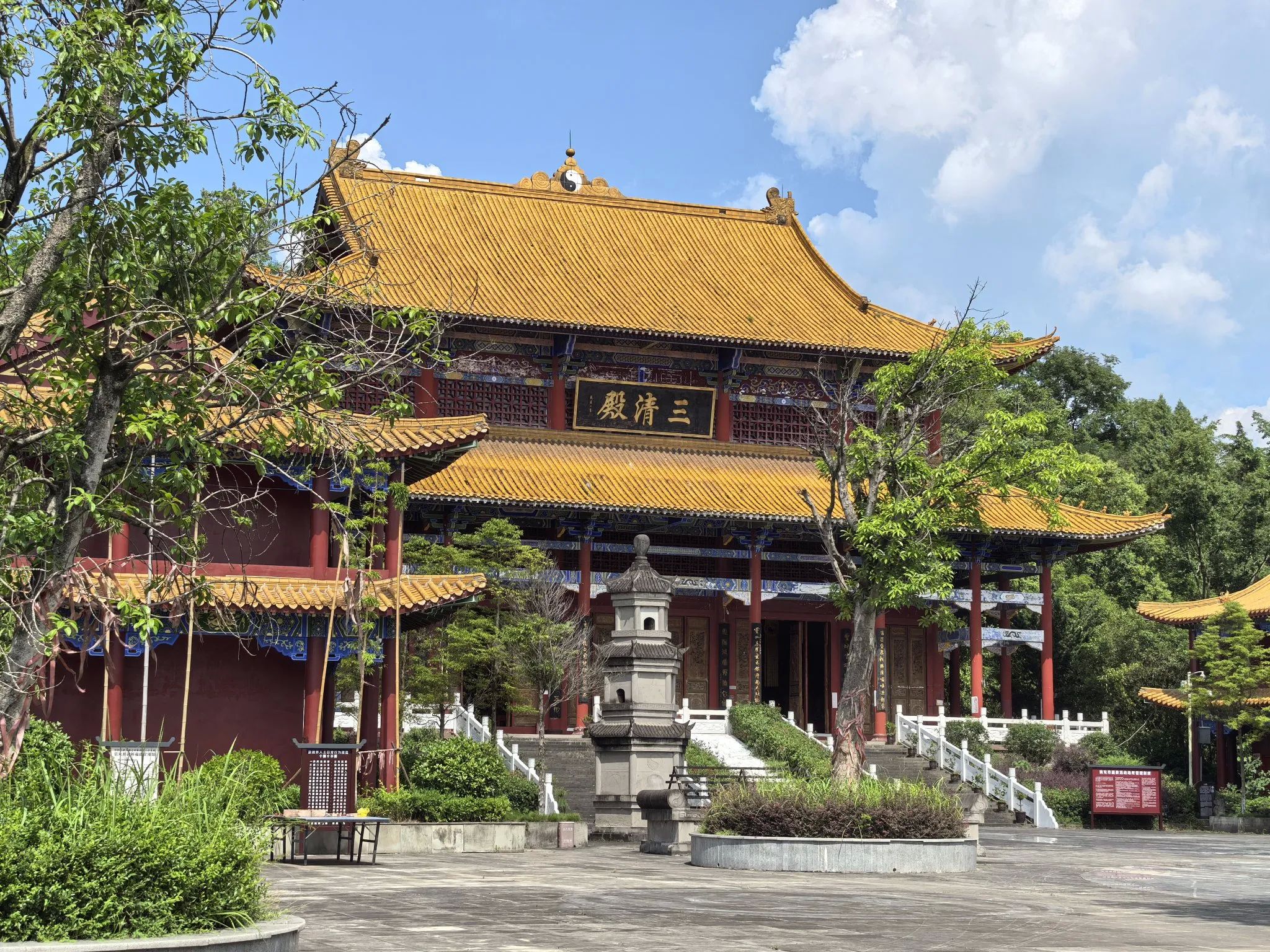 从老君洞天大门进入,迎面便是一方莲池。田田荷叶铺展如碧毯,其间睡莲正灿灿绽放:白色的像盏盏银灯,粉红的似个个蟠桃,娇艳欲滴。直行至殿前广场,金碧辉煌的三清殿巍峨庄严,高高的屹立在广场上方。