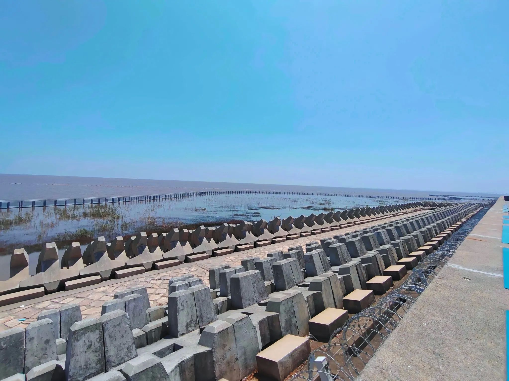 我也不例外,自动加入到他们的行列中。游览拍照完毕,站在水泥砌的,挡住了滔滔海水,蜿蜒如长蛇的大堤拦墙前,我面东凭栏举目远眺,海水浑黄,与天际相接,分不清界限。远处有点点白帆,想必是近海捕捞凯旋而归的渔人船只,如黄豆般大小,在海浪中一起一伏,乘风破浪,向着目的地驶去。海风也挟着咸腥气,从东南方向扑面而来,消去了我几分酷暑难耐的暑气。