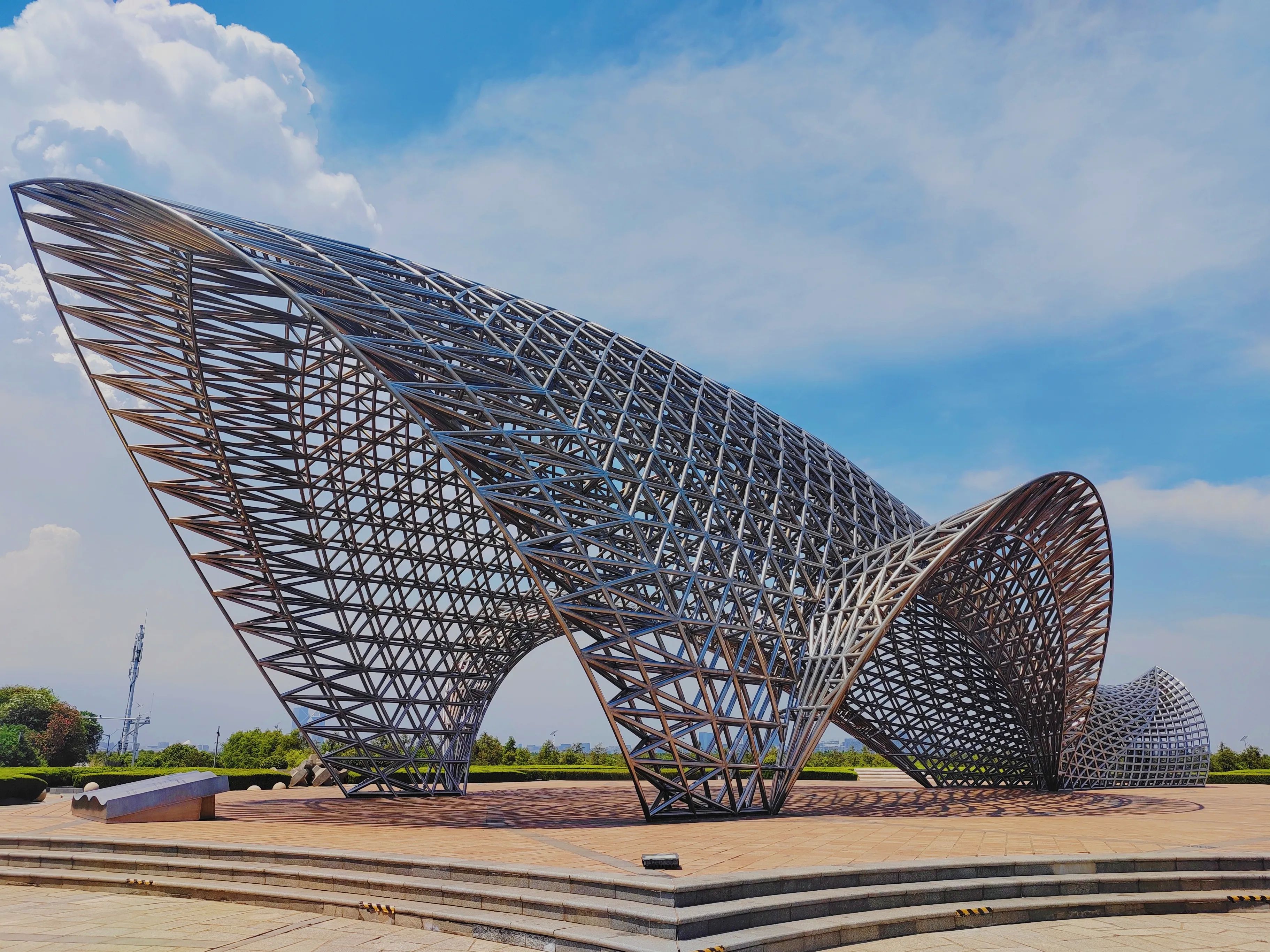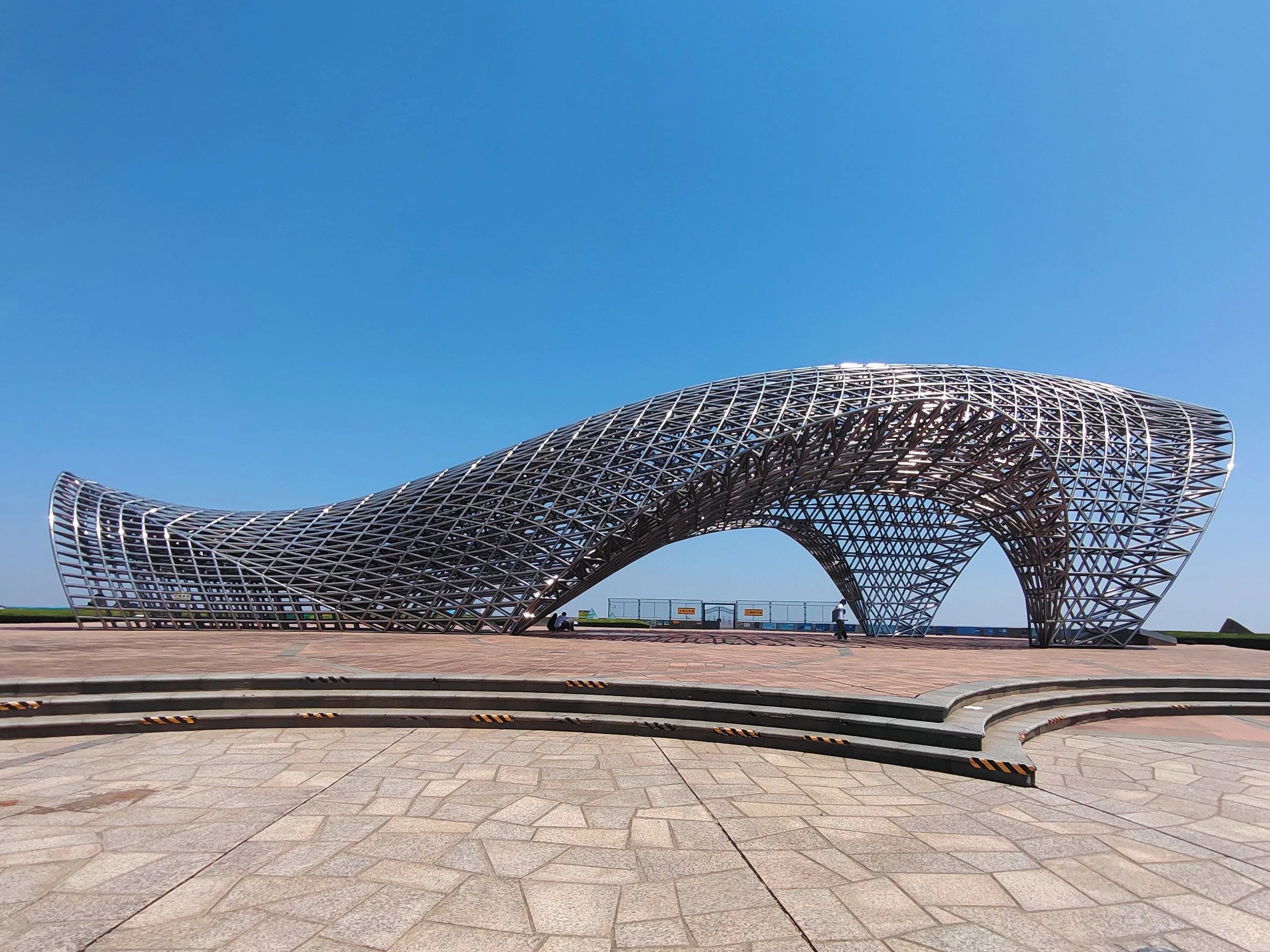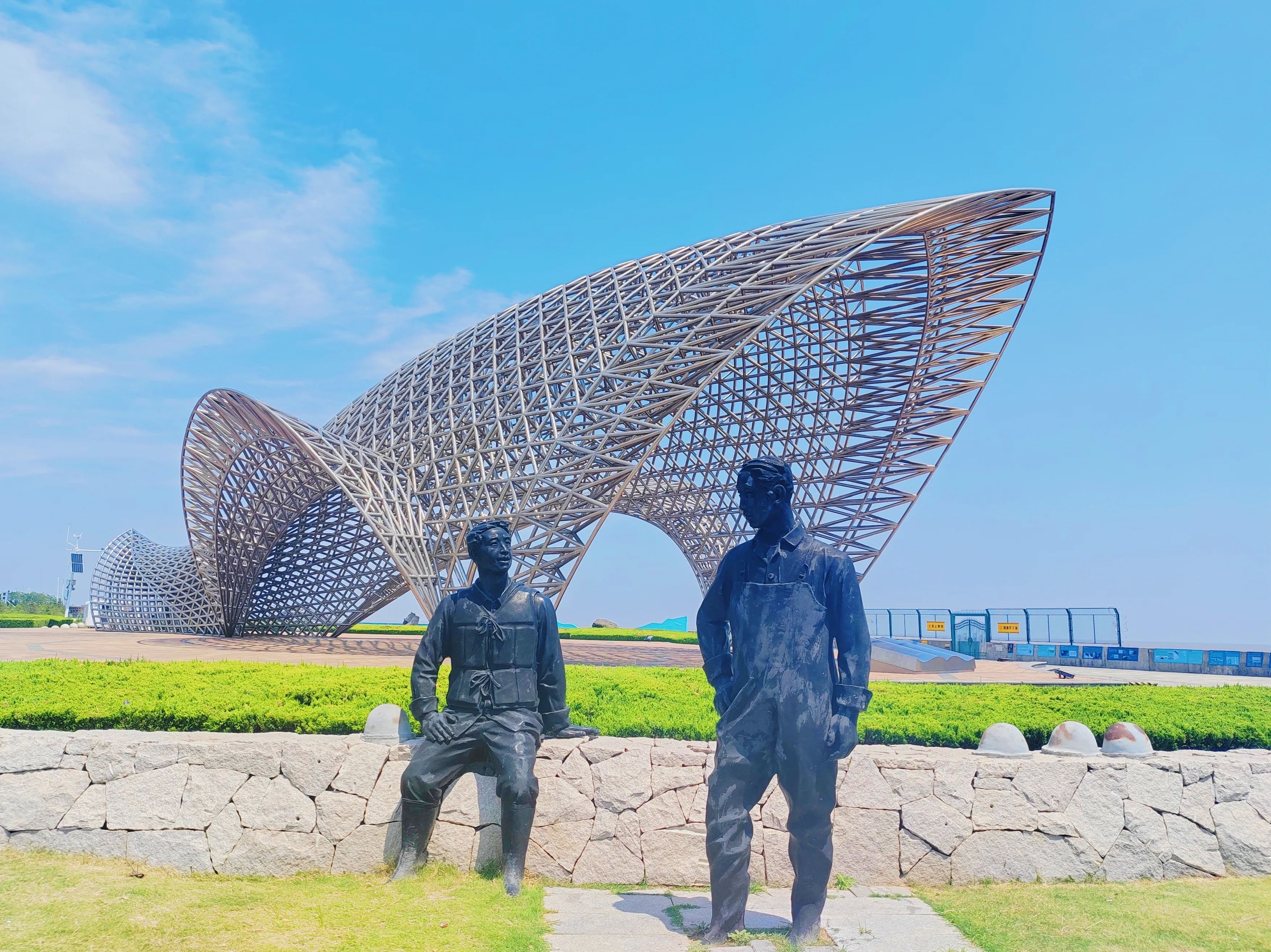 从车上下来,来到海边,已是中午时分。我沿海堤朝南行去不远,没几分钟,便见那银光闪闪的司南鱼雕塑,静静地卧在广场中央。这鱼造型甚是奇特,头尾翘起,似跃非跃,据说是为纪念开挖滴水湖时一条搁浅后获救的幼鲸,民工把它放归大海后,它在南汇嘴公园附近的海面上,连续三次伸出头,感谢救助它的恩人们而建。