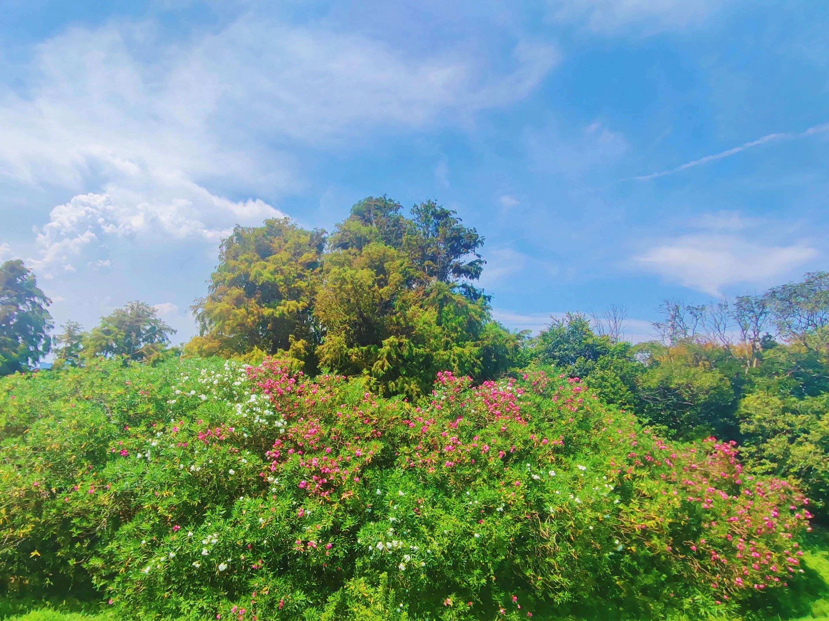 堤内却有另一番景致。树木不高,也不多,却排列得整齐,生机盎然,绿叶在海风中,沙沙作响。树下花草丛生,我叫不出它们的名字,只见红的、白的,星星点点散在树荫之边。最妙的,风一过,它们便如海浪般起伏,与远处的大海波涛遥相呼应。