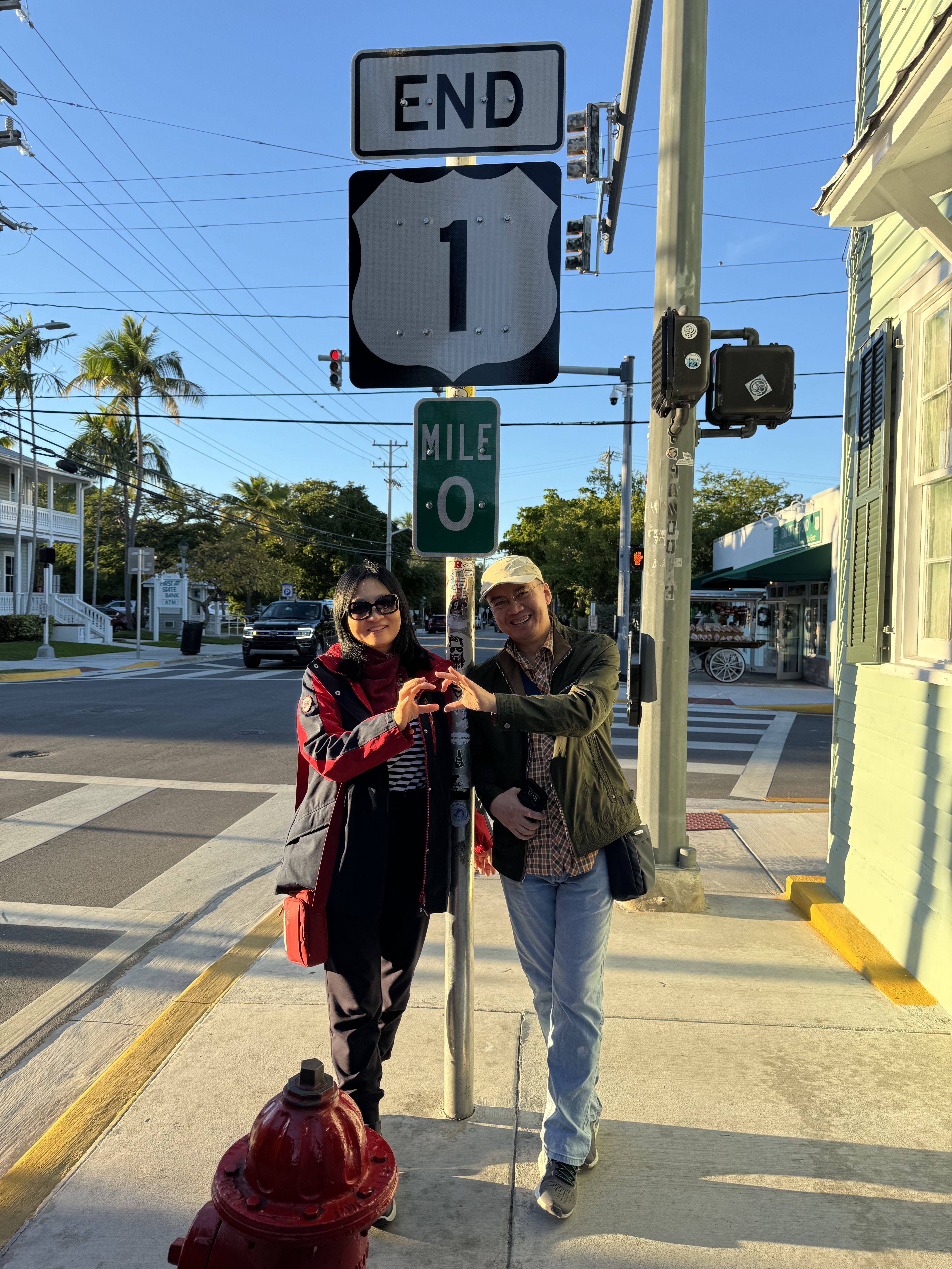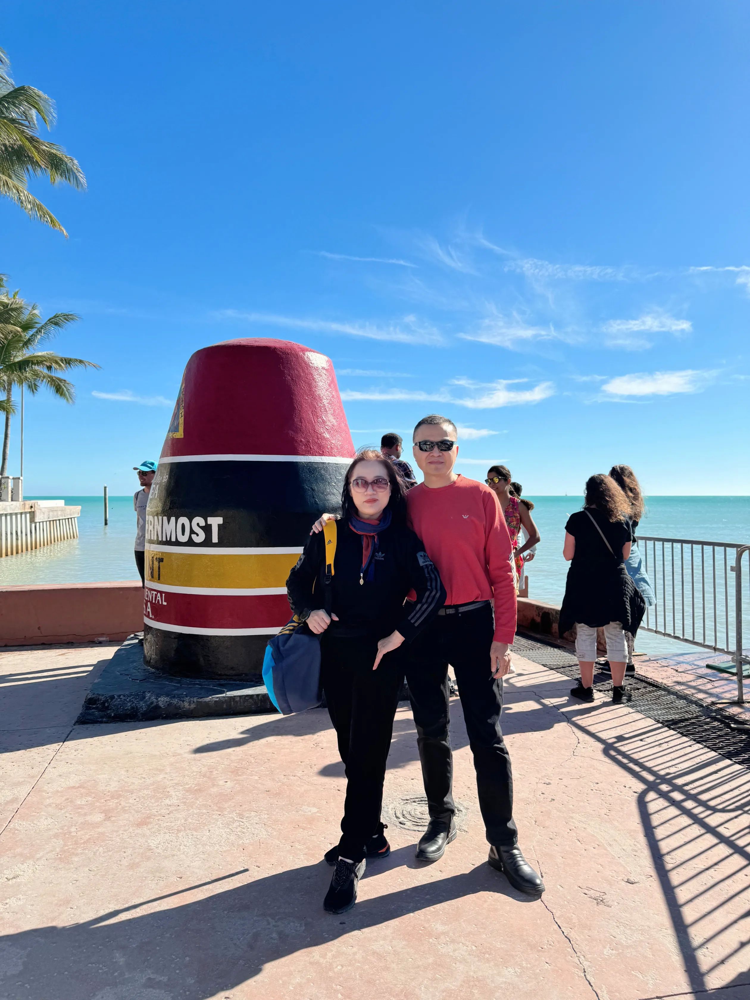 从迈阿密市中心驾车4个多小时到达海明威故居所在地——Key-West,一路风景如画,路况不错心情好,很快就到了。这里是佛罗里达最南端,也是美国本土最南端。从地图上看就像是一个被“独立”的小岛,处于迈阿密和古巴之间的墨西哥湾。我们行驶的道路是唯一一条通往小岛的公路,是北美最美公路,也是有名的“美国1号公路”,它串起迈阿密和Key-West 的一系列小岛。岛上Southernmost Point是所有来到这的人必须打卡的地方,人气最旺,我们去到那里的时候已经有好多人在自觉排队合影。地标上面有“90” 的意思是从这里到古巴仅有90英里。当我们到海明威故居(海明威博物馆)时也有很多人在排队购票参观,成人票价$18,2-6岁小孩$7,12人以上团队票$14,都是裸票价,未含州税。《老人与海》这篇脍炙人口的作品就是在这里完成的。这位闻名天下的文学巨匠是个名副其实的猫宠,他养的最早的六趾猫名叫白雪Snow White,现在故居里生活的猫们都是白雪的后代。海明威故居旁边就是的灯塔,也是Key-West 有名的标志性建筑;据说建于1825年,曾是海上船只的指示灯,现在的灯塔仅限于供游客参观和拍照。沿着Whitehead St步行十几分钟来到“这里是终点,也是起点”的地标附近。美国的1号公路,原来是从美国最南端的Key-west出发,一直到最北端的缅因州肯特堡的一条公路;中途连接了各大主要城市:迈阿密,波士顿,纽约等。这条公路也是美国最长的南北向公路。谁能想到这条公路的起始牌就在一个不起眼的十字路口。在1 号公路起始点的对面,也就是1 号公路的终点;很多朋友可能不知道,所以不经意间就错过了这两个牌子。小岛虽小故事不少,美国前总统杜鲁门(Harry Truman)在这里也留有一幢House ,托马斯·爱迪生(Thomas Edison)曾在第一次世界大战期间居住在这里;还有美国总统艾森豪威尔(Dwight Eisenhower)、肯尼迪(John F. Kennedy)等等都与这里有着深厚渊源。岛上的最后一站是著名的落日观赏点,也被称为落日广场。正当太阳快沉没的时候,晚霞又射出了更加绚丽的色彩。鹰击长空与天空快速变幻莫测的景致构成一幅绚丽夺目的画卷,红蓝紫金糅合出彩,随手就出大片。随着太阳一点点的下沉,伴随着天空中仍未散去的余晖,我们已全局返程。