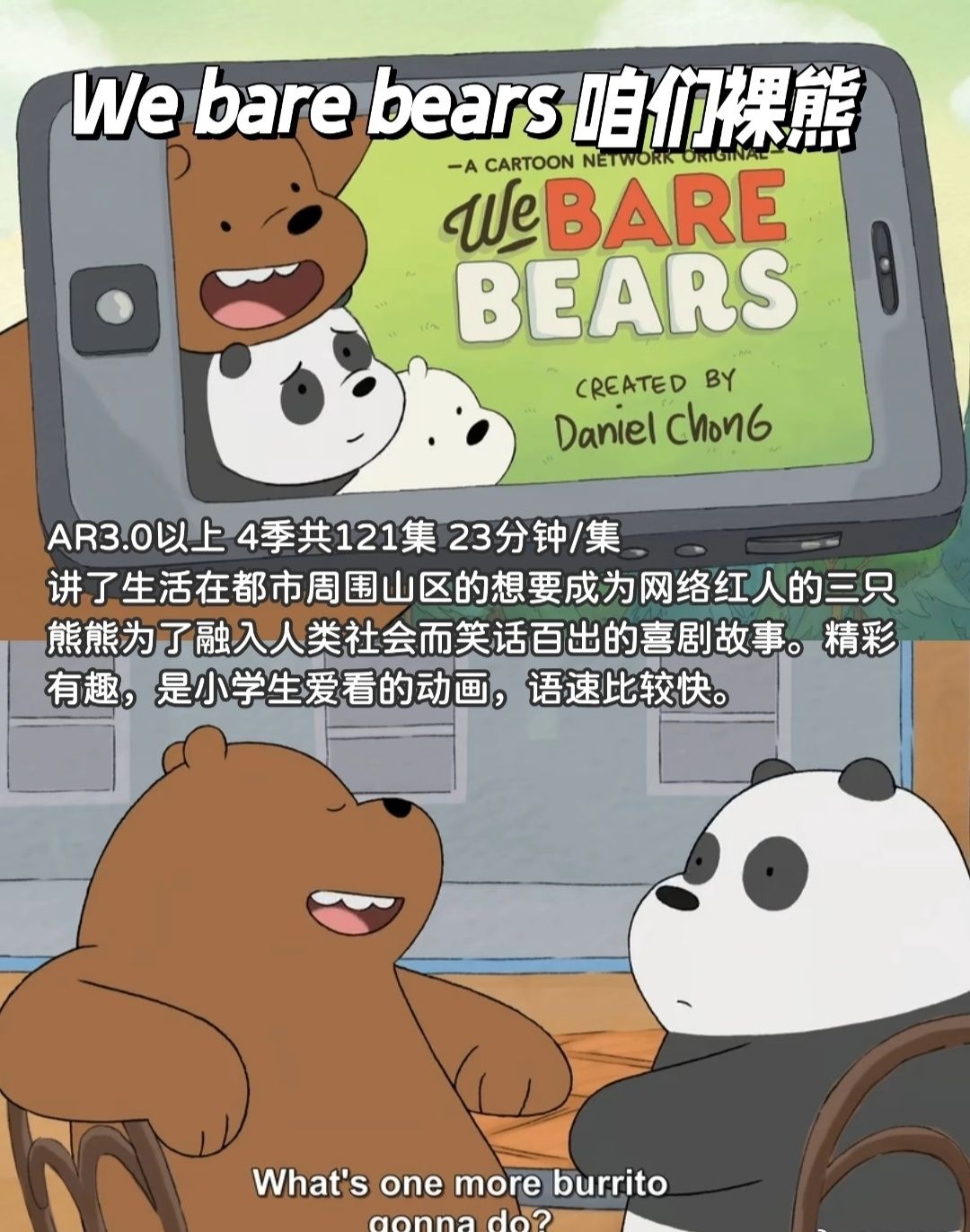 生活在都市周围山区的想要成为网络红人的三只熊熊为了融入人类社会而笑话百出的喜剧故事。精彩有趣,是小学生爱看的动画,语速比较快。