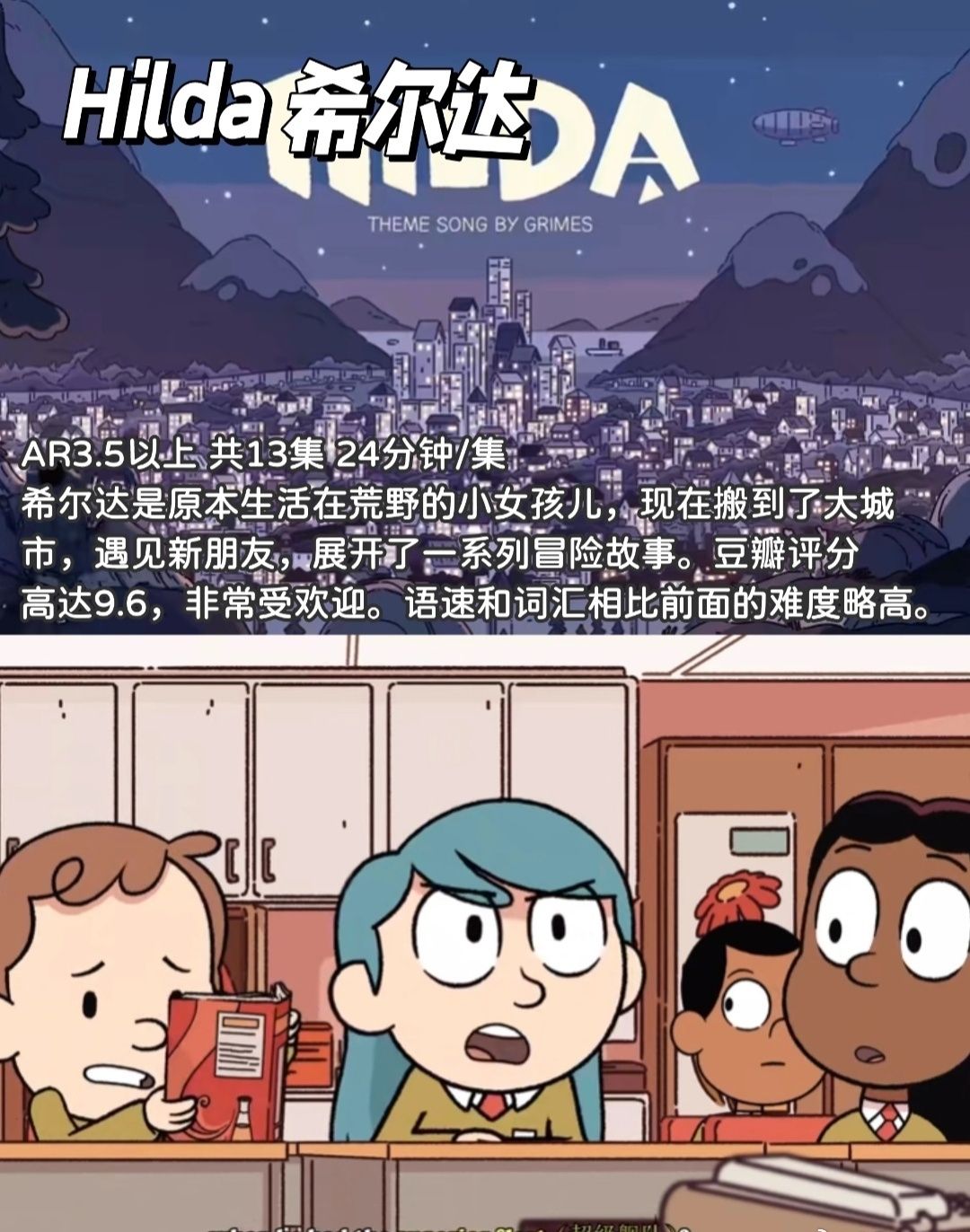 希尔达是原本生活在荒野的小女孩儿,搬到大城市遇见新的朋友,展开了一系列冒险故事。豆瓣评分高达9.6,老少咸宜,非常受欢迎。语速和词汇相比前面的动画难度略高一些。