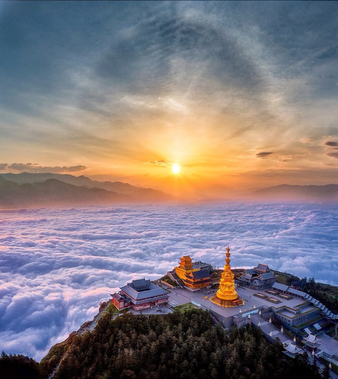 上午:前往峨眉山,乘坐景区观光车和缆车到达金顶,参观十方普贤菩萨像,欣赏云海、佛光。
