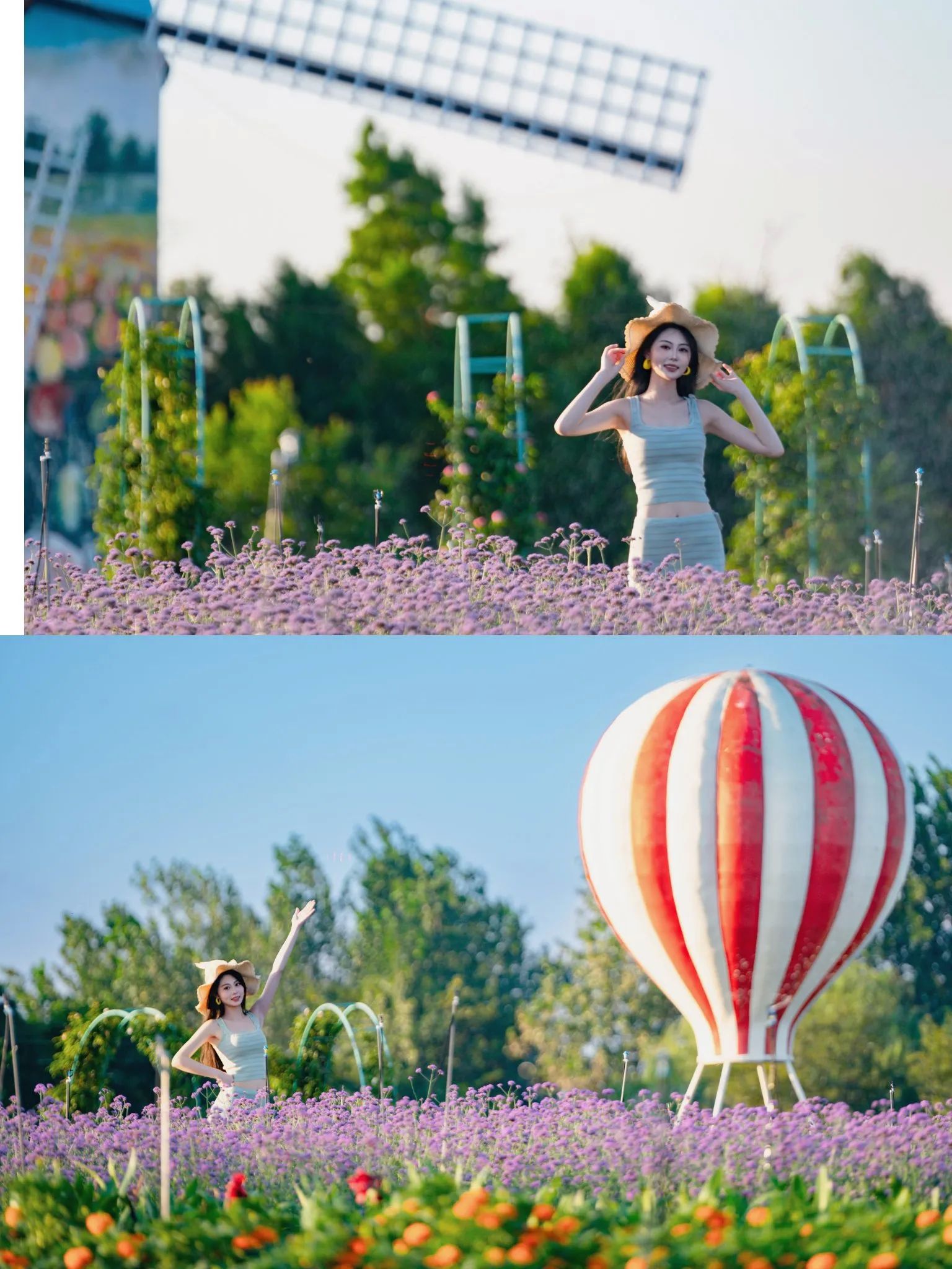 花海里的热气球、风车、欧式建筑作为背景拍照出片,谁拍谁知道。