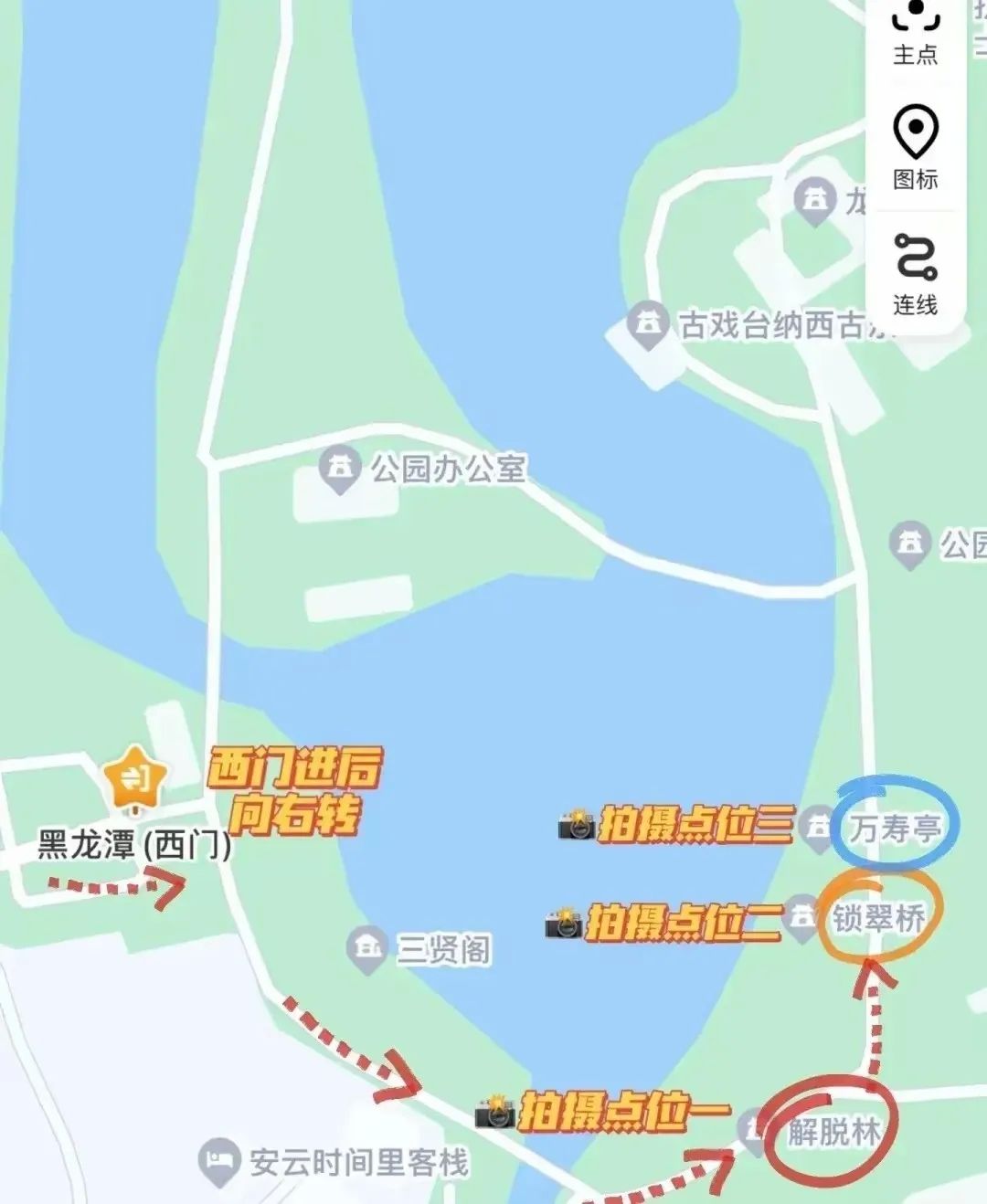 进门右转走到锁翠桥就是 最佳机位。可拍到雪山倒影、得月楼、五孔桥。拍完继续往前走到万寿亭,这里有家咖啡,坐着拍照氛围感很绝(位置图见下图2)