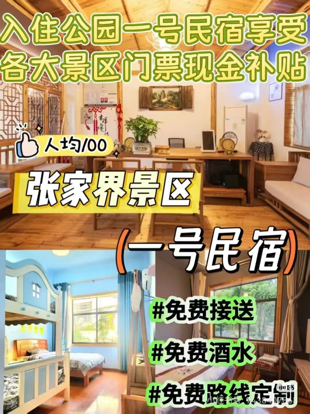 公园一号民宿让您花最少钱畅游张家界民宿推出:森林公园套票526元(门票、保险、景交车、三索一梯无限次;票4天有效)+公园一号民宿260元以上客房一间+30元景区接送+早餐37.6元(18.8元X2人)+9.9元免费酒水券=价值863.5元套餐公园一号民宿优惠价588元(节假日除外)。