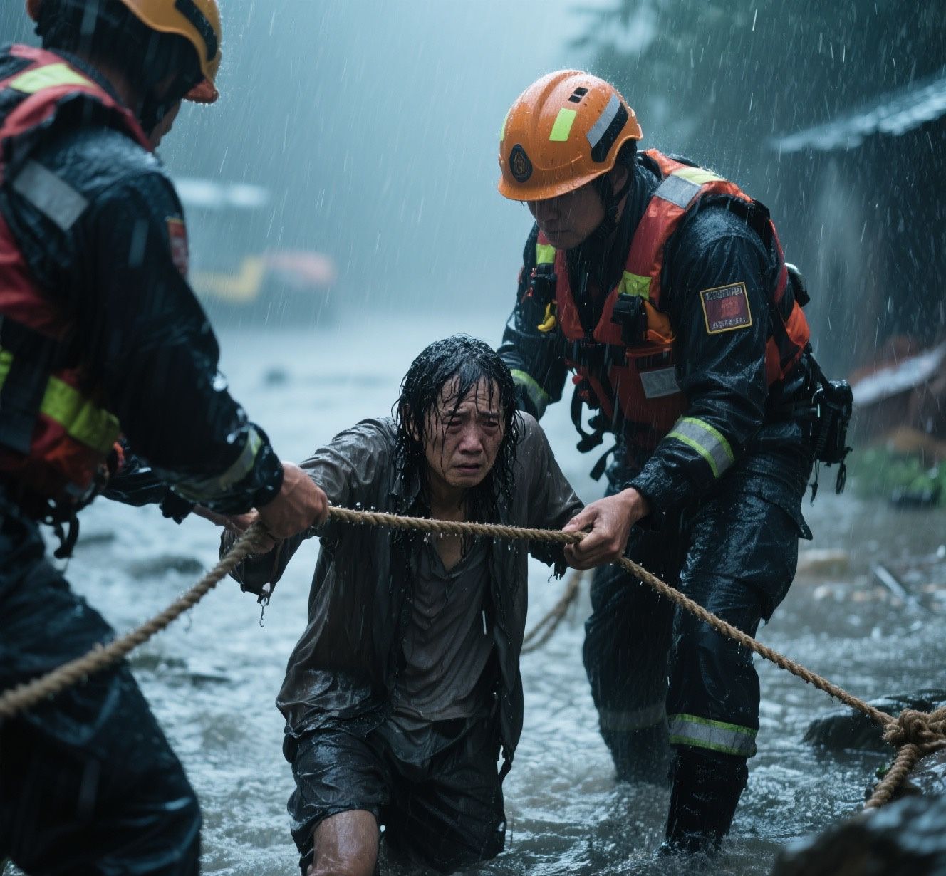 消防员半蹲在齐膝深的湍流中,用身体为七旬老人挡住树枝的抽打。浑浊的积水裹挟着断枝冲撞救援队员的救生衣,三人组成“三角人链”在树丛中劈开生命通道——这是8月4日惠州惠东县欧洲城后方赛场山的真实救援场景。
