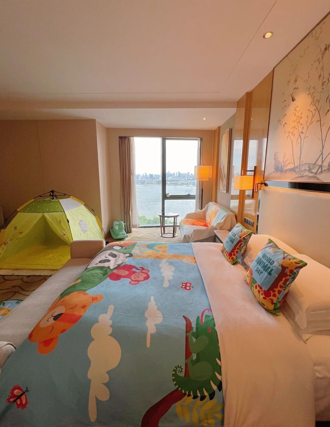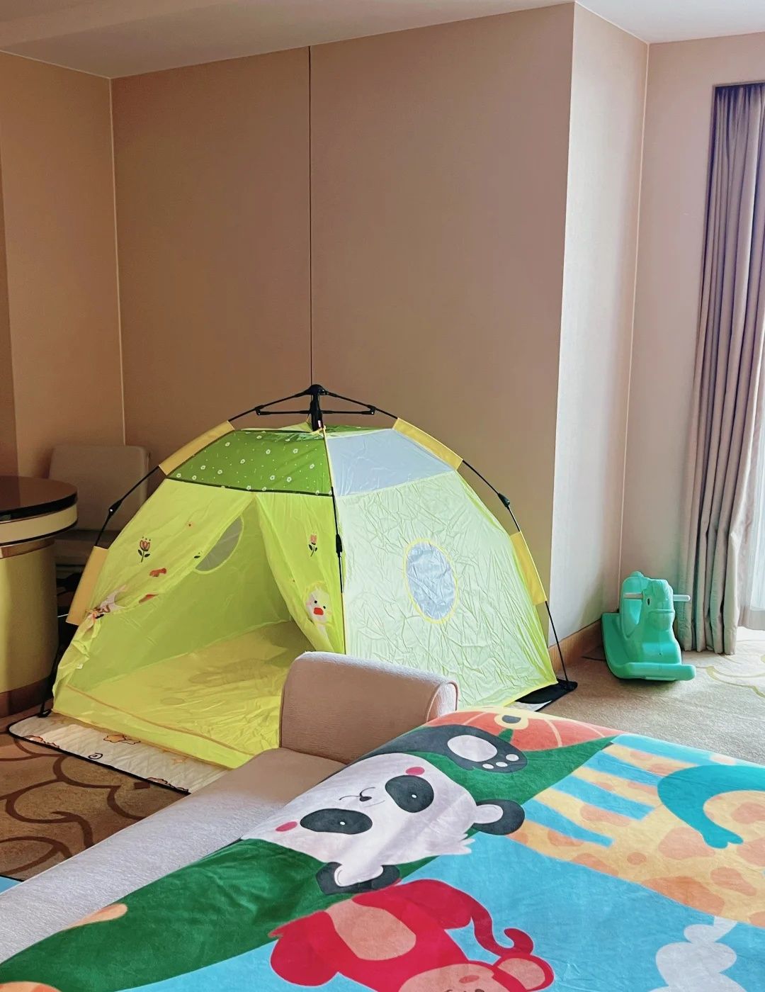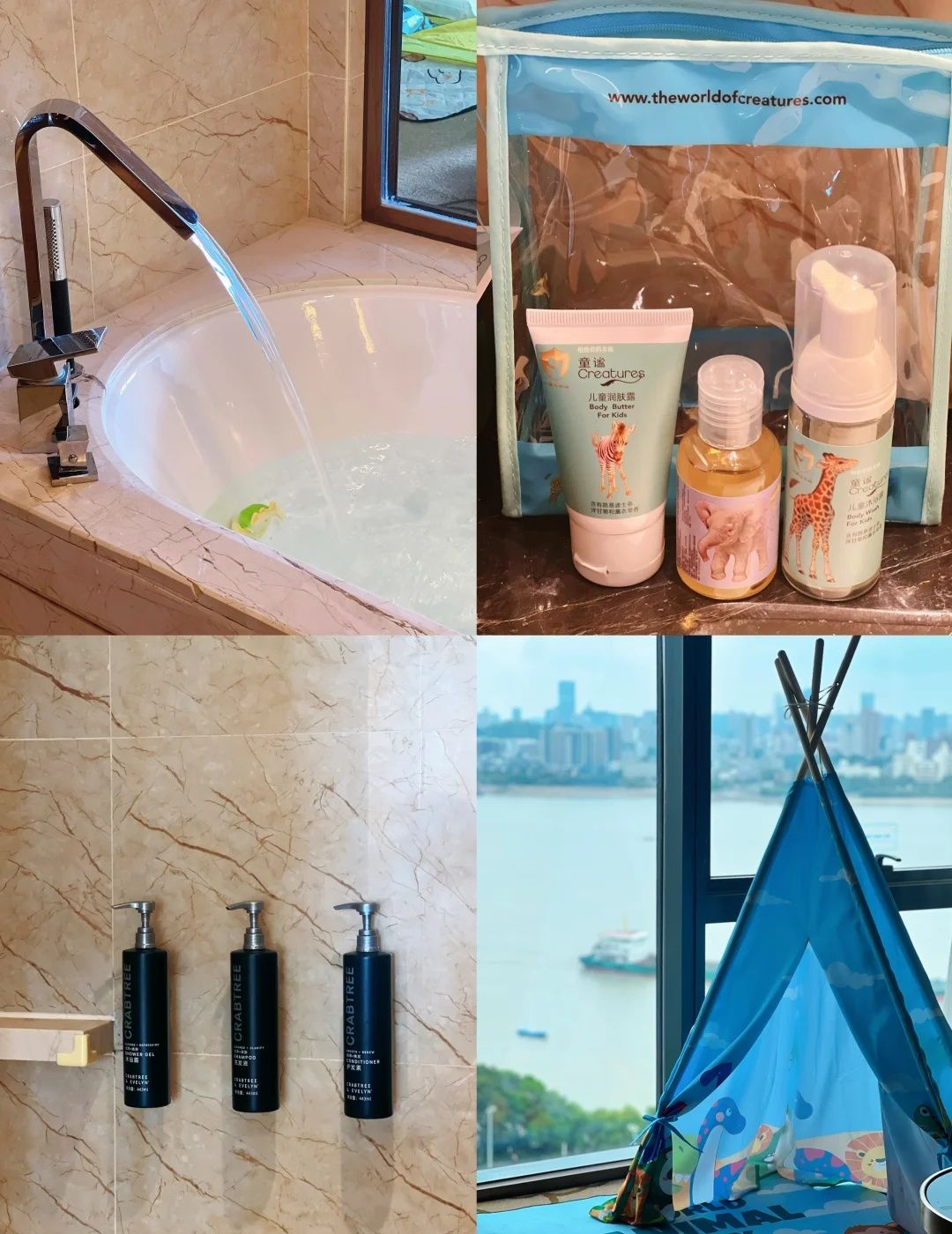 我们住的22楼的亲子房,房间装饰很童趣,准备了帐篷和玩具,小朋友进去了不愿意出来,窗前还发现了蒜鸟,还贴心准备了儿童马桶坐便椅和儿童洗手踩脚凳,玩累了晚上泡了澡欣赏夜景太city了