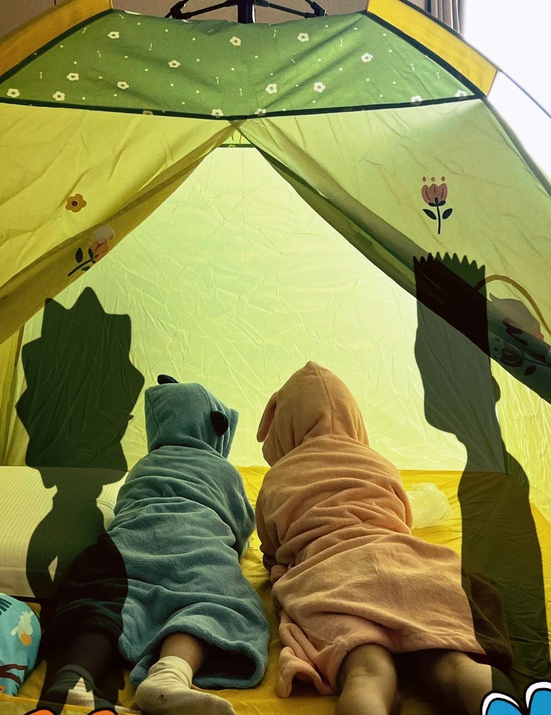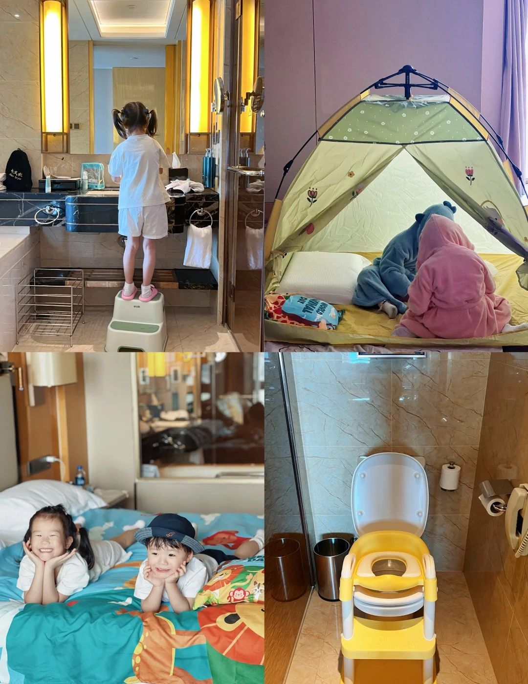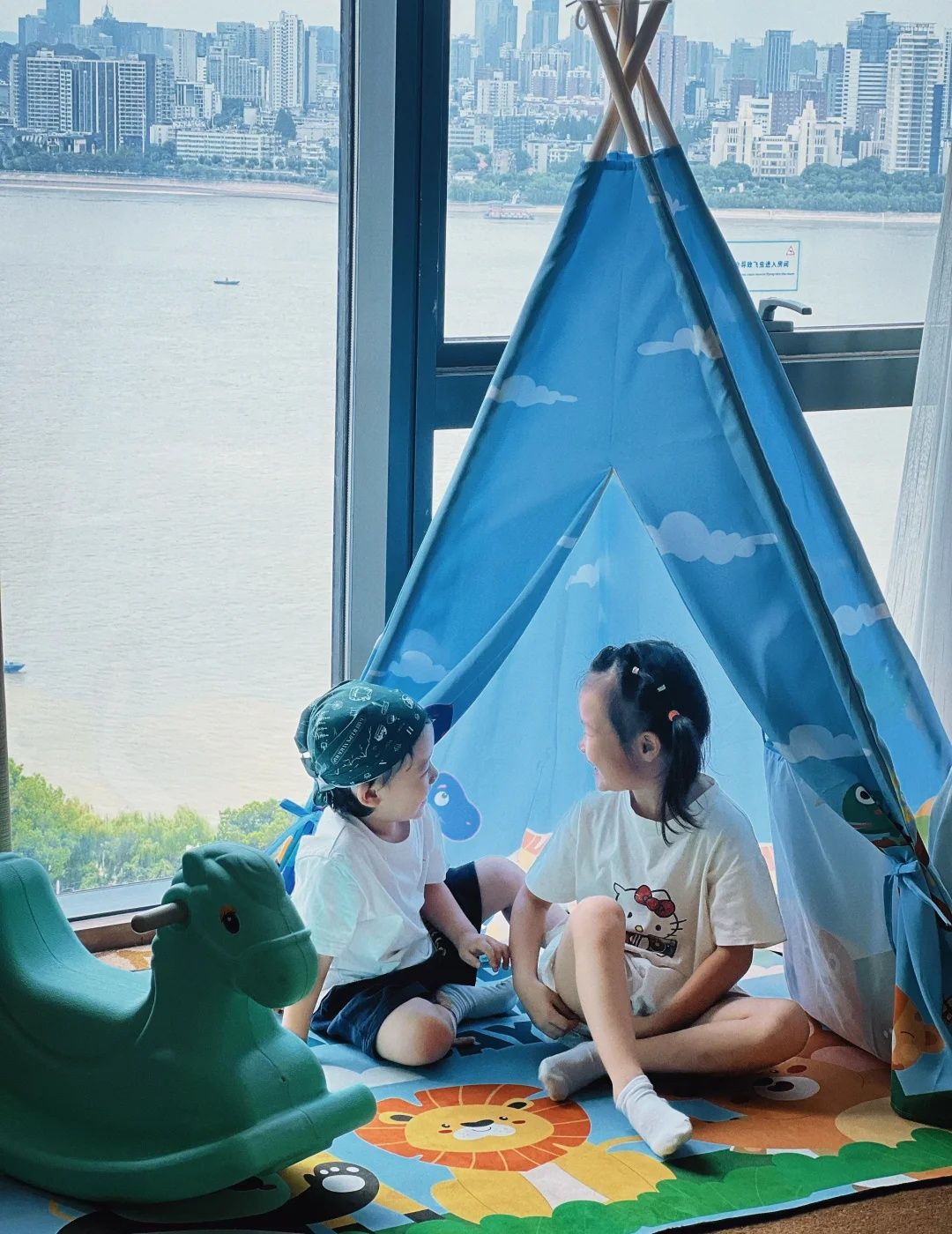 我们住的22楼的亲子房,房间装饰很童趣,准备了帐篷和玩具,小朋友进去了不愿意出来,窗前还发现了蒜鸟,还贴心准备了儿童马桶坐便椅和儿童洗手踩脚凳,玩累了晚上泡了澡欣赏夜景太city了