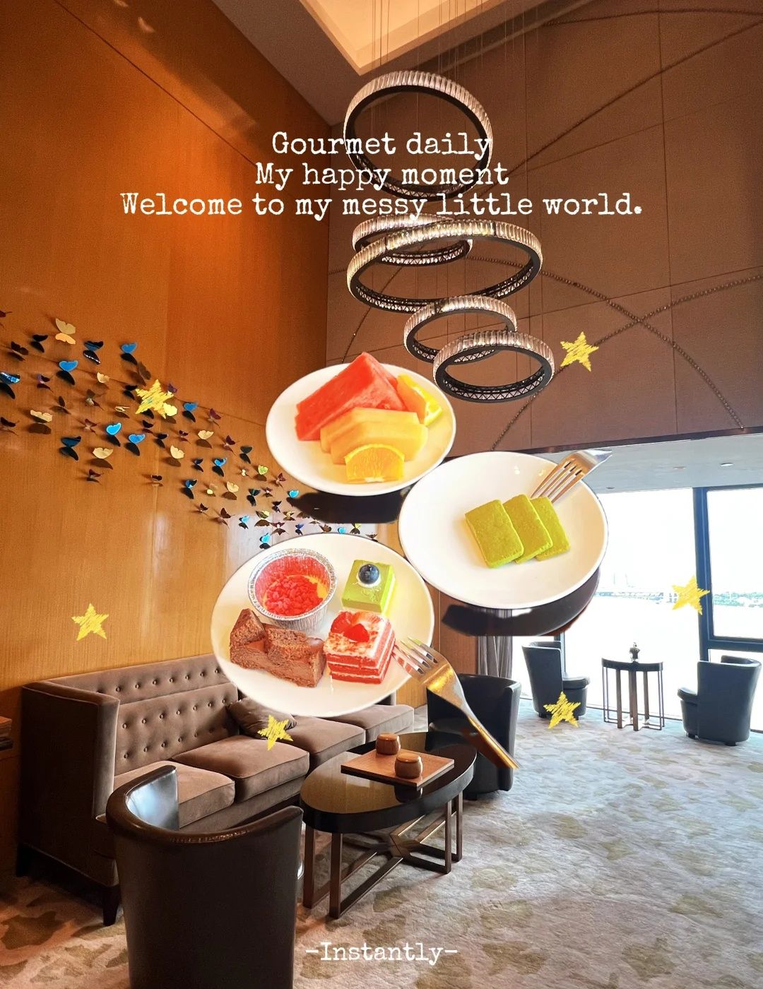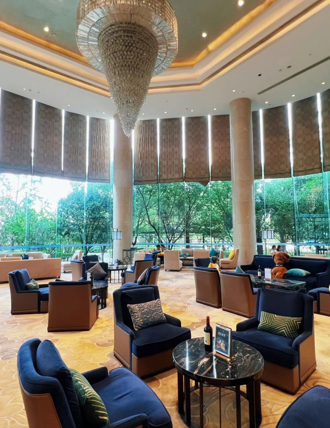 走进酒店大堂,金色装饰和吊灯大气又奢华,大堂的落地窗阳光洒下来,一片绿色真的好治愈,酒店还点缀了新中式元素家具,轻奢格调又透露着沉稳气质。