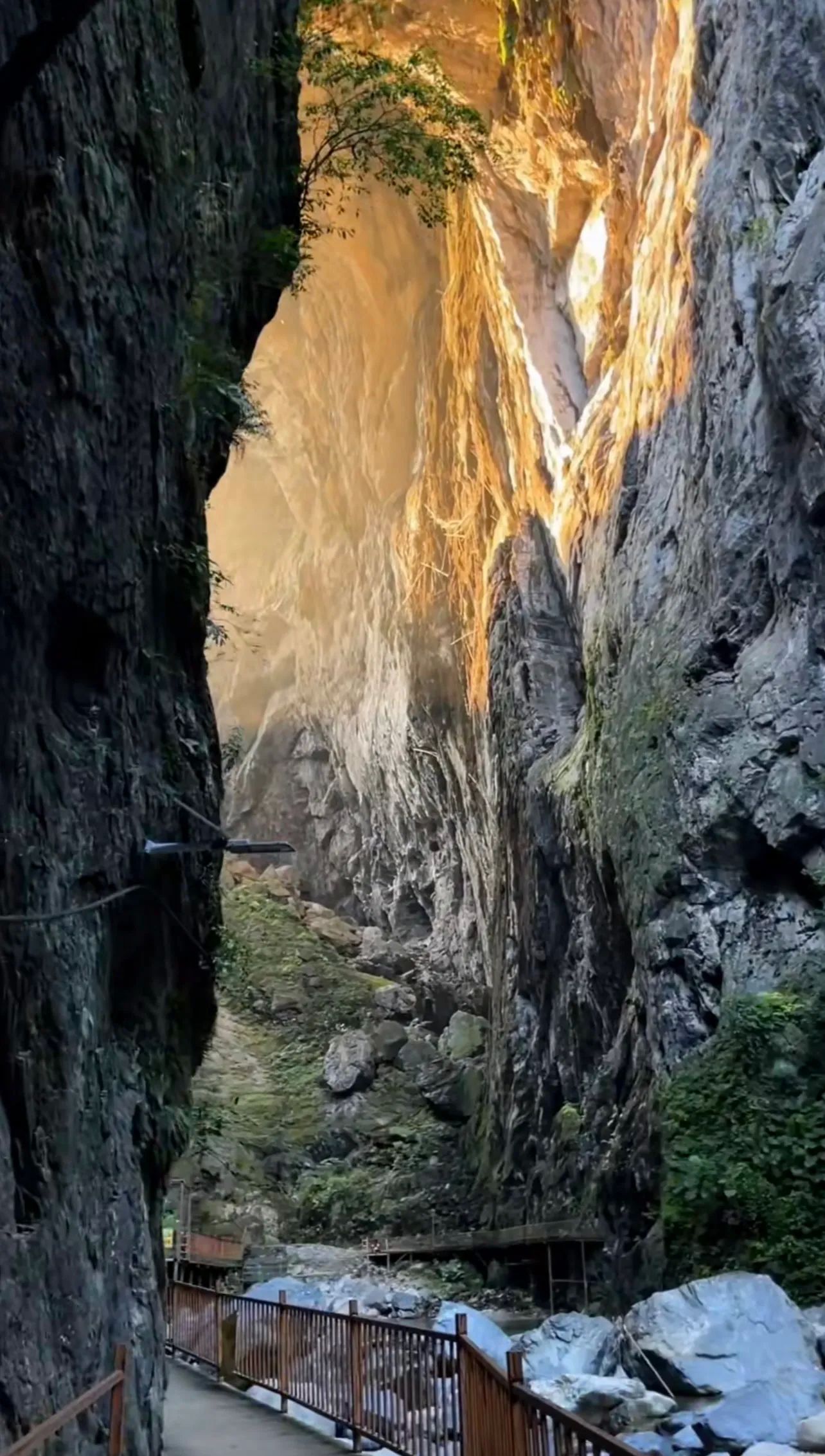· 第四站导航天井山燕窝洞。历经2000万年的风吹日晒,暗河冲刷,形成了高达百米的巨大溶洞,极其震撼。洞前暗河流出,形成蒂芙尼蓝的秀美小镜湖,碧水青山,流水潺潺,瀑布飞挂,野鸭嬉戏,多美的一幅山水画。胆子大的还可以上山挑战488米亚洲最高玻璃桥。