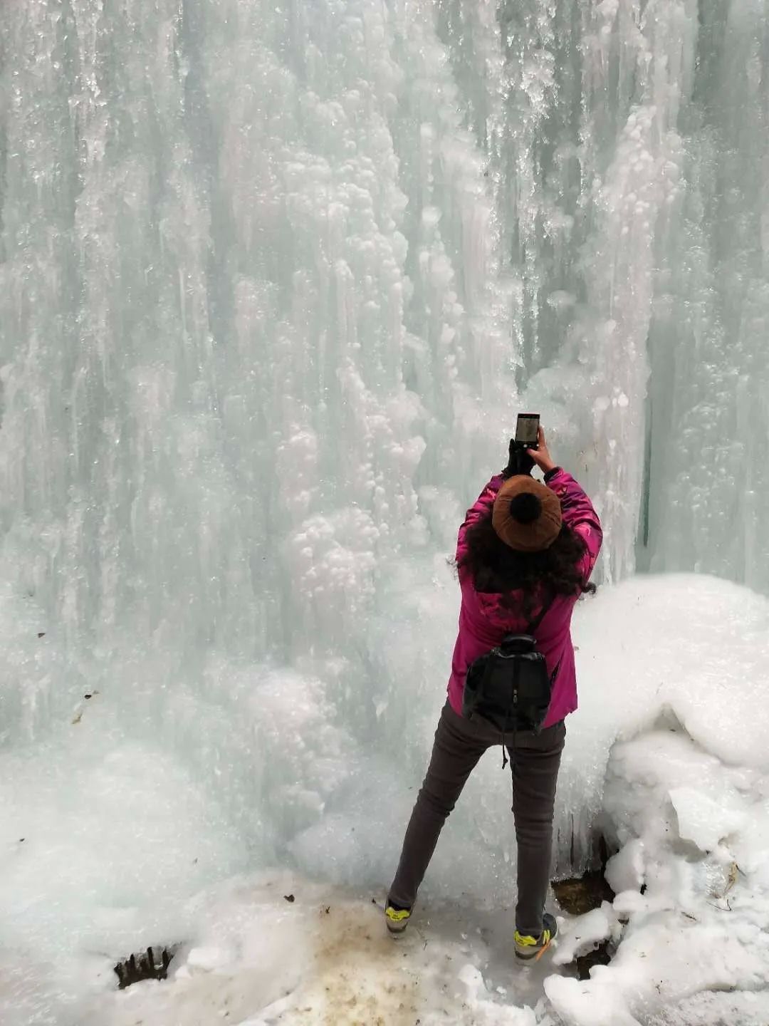 进入峡口,映入眼帘的白色冰瀑“飞流直下三千尺”,从山顶直泻下来,呈三角形状强力打造“冰冻三尺非一日之寒”的视角冲击。冰瀑侧,树枝和杂草结为冰枝,冰雾弥漫、冰花四溅、点染沟壑,一片一片晶莹剔透、葱茏发白。冰瀑下,绵延着一片百余米长的冰面,甚为壮观。冰面上,一簇人群玩的正酣,有的滑冰、有的推着冰车疾行;有的拍照、有的努力向上登攀几步;助威声、尖叫声和朗朗的笑声融合在一起,丝毫感觉不到凉意。