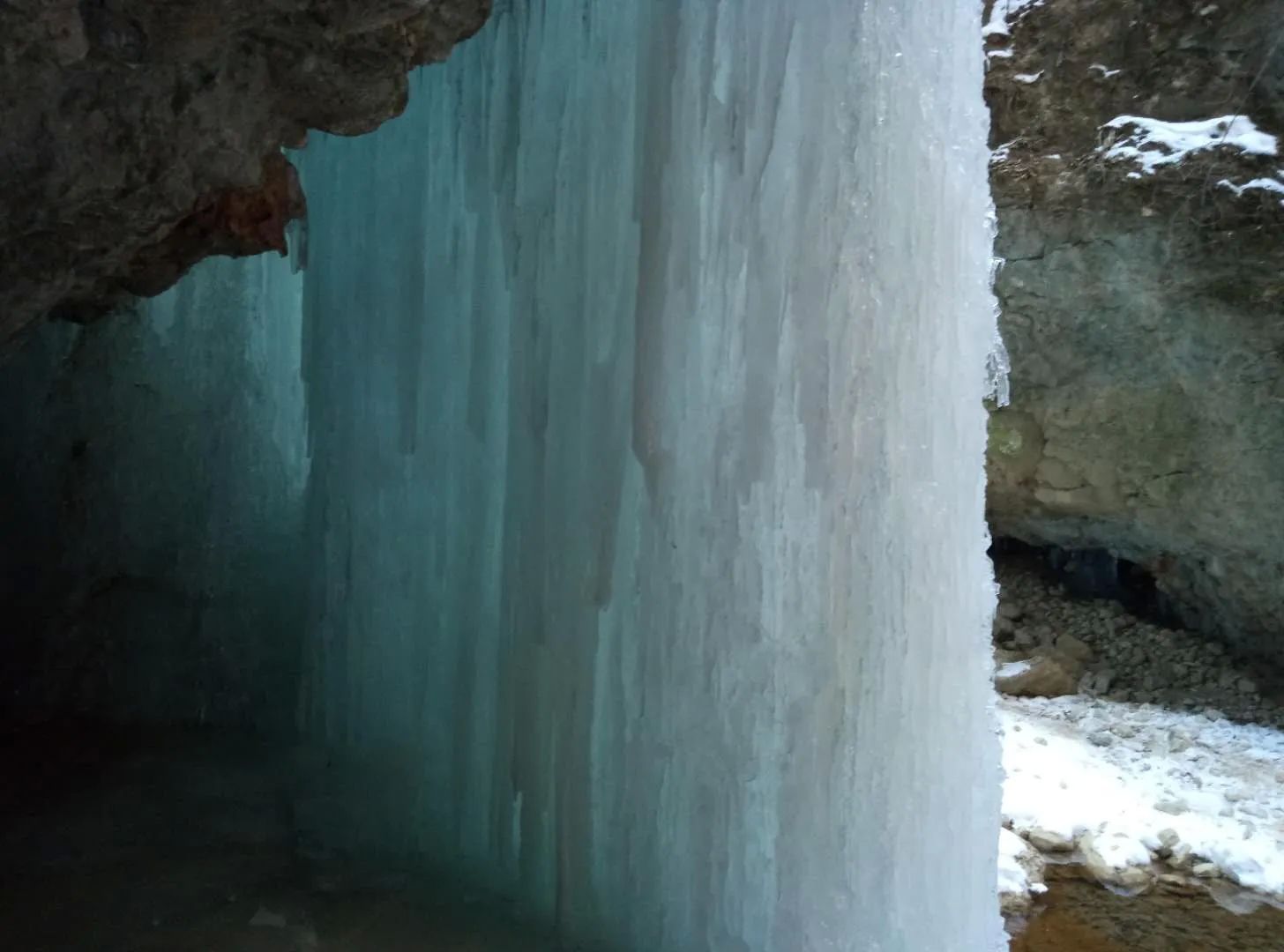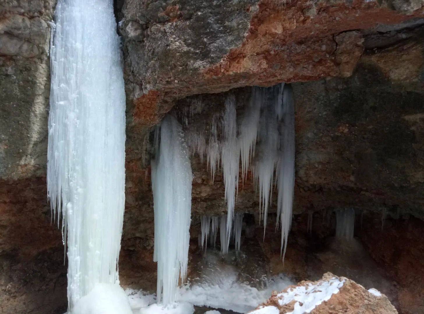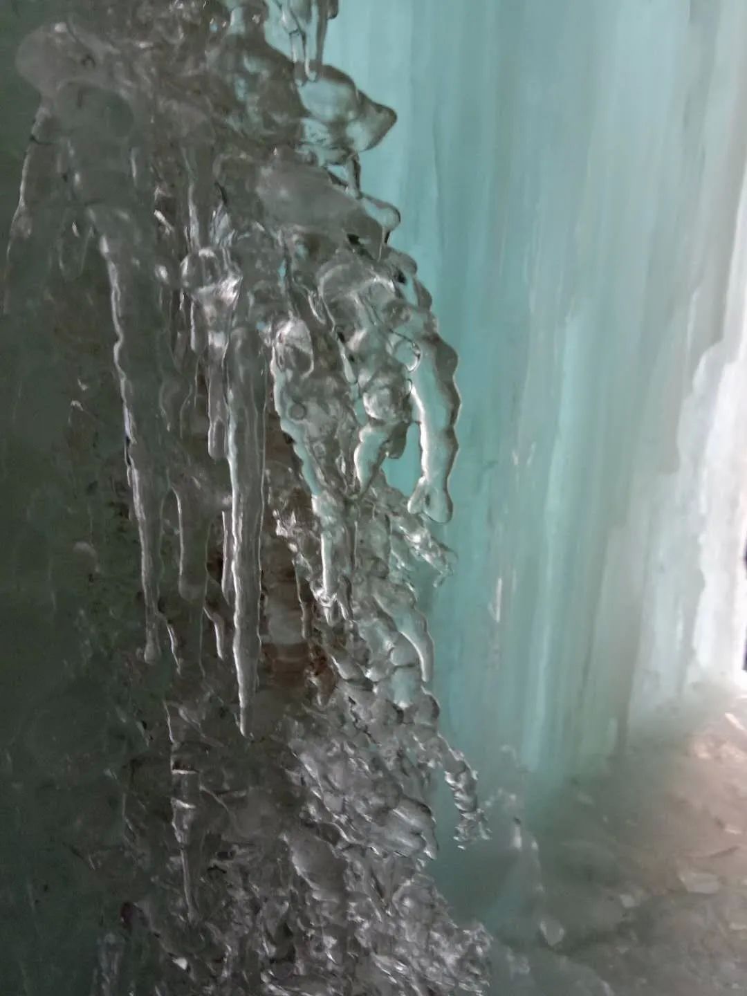 不知不觉走到一处冰天世界的奇观,冰墙、冰床、冰屋、冰挂等自然天成。看着足足有半尺厚的冰墙,好似微泛青色,如玉如肌、清隽秀润、晶莹透亮,又像一块巨大的白玉雕刻,刀法犀利,略露凿痕,美不胜收。那一点一滴从砂岩里渗透出的水痕,顺着冰珠,缓缓移动,还在逐渐加厚冰墙,加粗冰柱。侧着耳,可以听到冰墙里水渗的声音,细细的、淡淡的、轻轻的“滴答”着,深情体验一种“尽其灵而足其神的艺术效果”。用手一抓,刹那间刺骨寒凉穿入手掌,好像和冰柱粘贴一起,冰水相渗,韵致微妙,赶紧缩回了手掌。