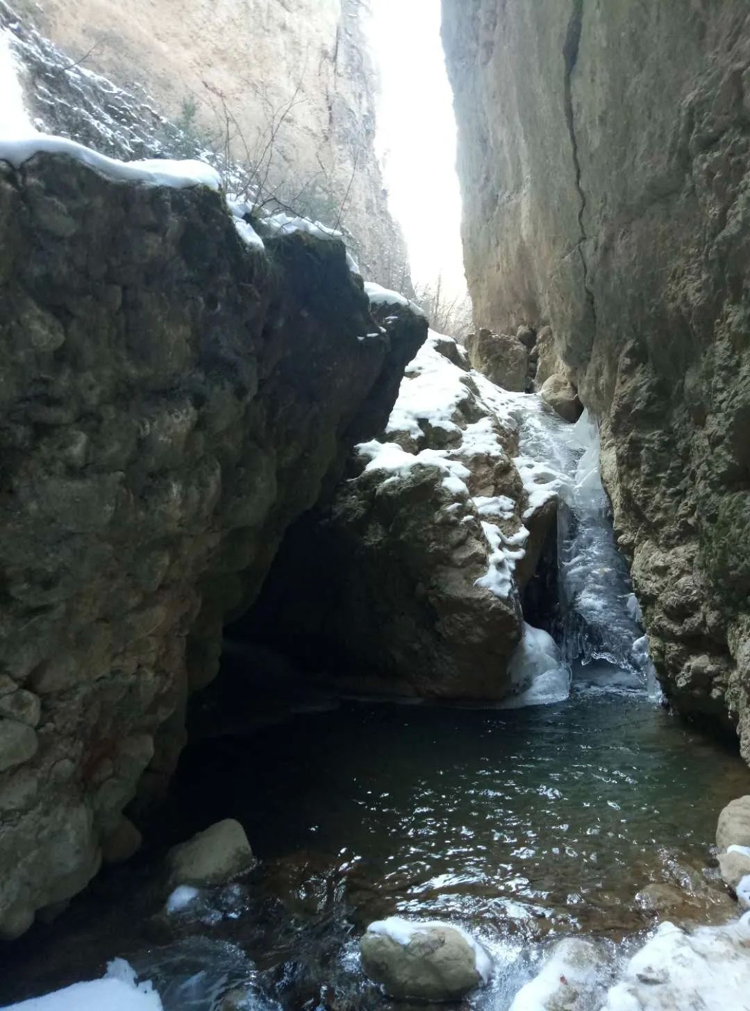 沿着峡谷侧壁,刻出了一个弧形,行进之路更加艰难,有时需要俯下身半爬行,有时因踩踏石块的滑动,将脚面直接涉到了水流,裤腿上一会儿结为冰削,尽管脚底寒凉也顾不过来。