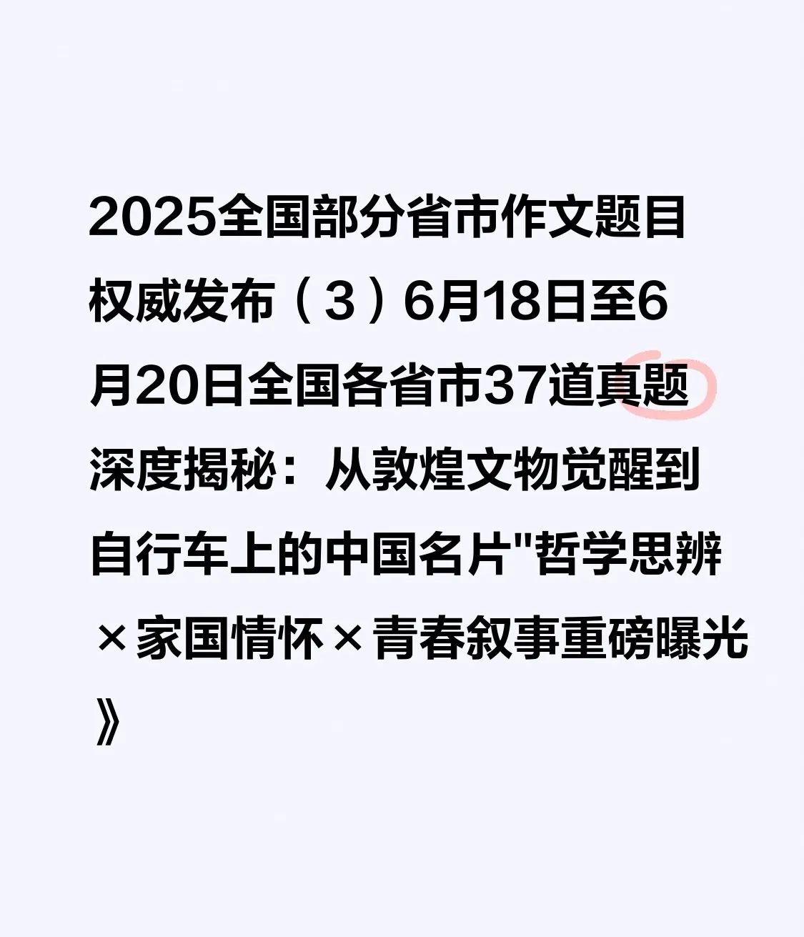【2025全国部分省市作文题目权威发布(3)6月18日至6月20日全国各省市37道真题深度揭秘:从敦煌文物觉醒到自行车上的中国名片"哲学思辨×家国情怀×青春叙事重磅曝光》】
