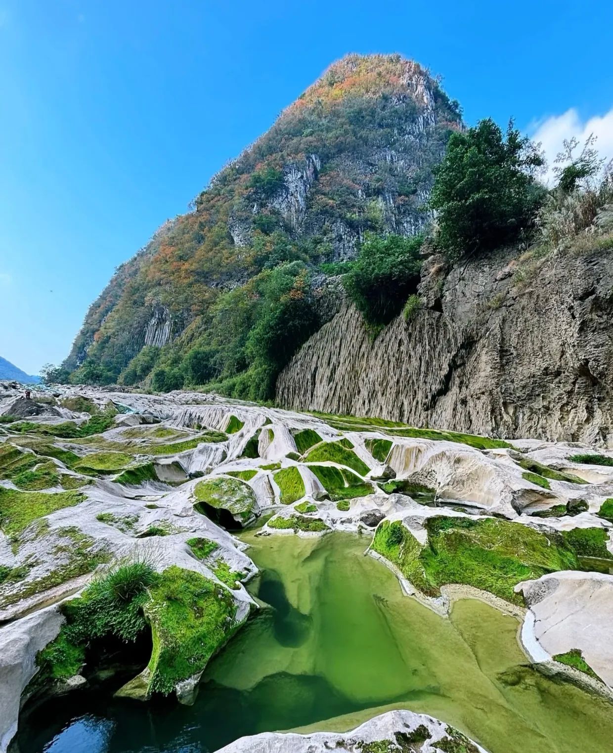 300万年前的冰川遗迹——关岭冰臼,被《中国国家地理》称为“地球的年轮”。我漫步河谷,看到无数心形、马蹄形的石臼镶嵌在河床中,碧绿潭水与灰白岩石交织,宛如时空错落的艺术展厅。