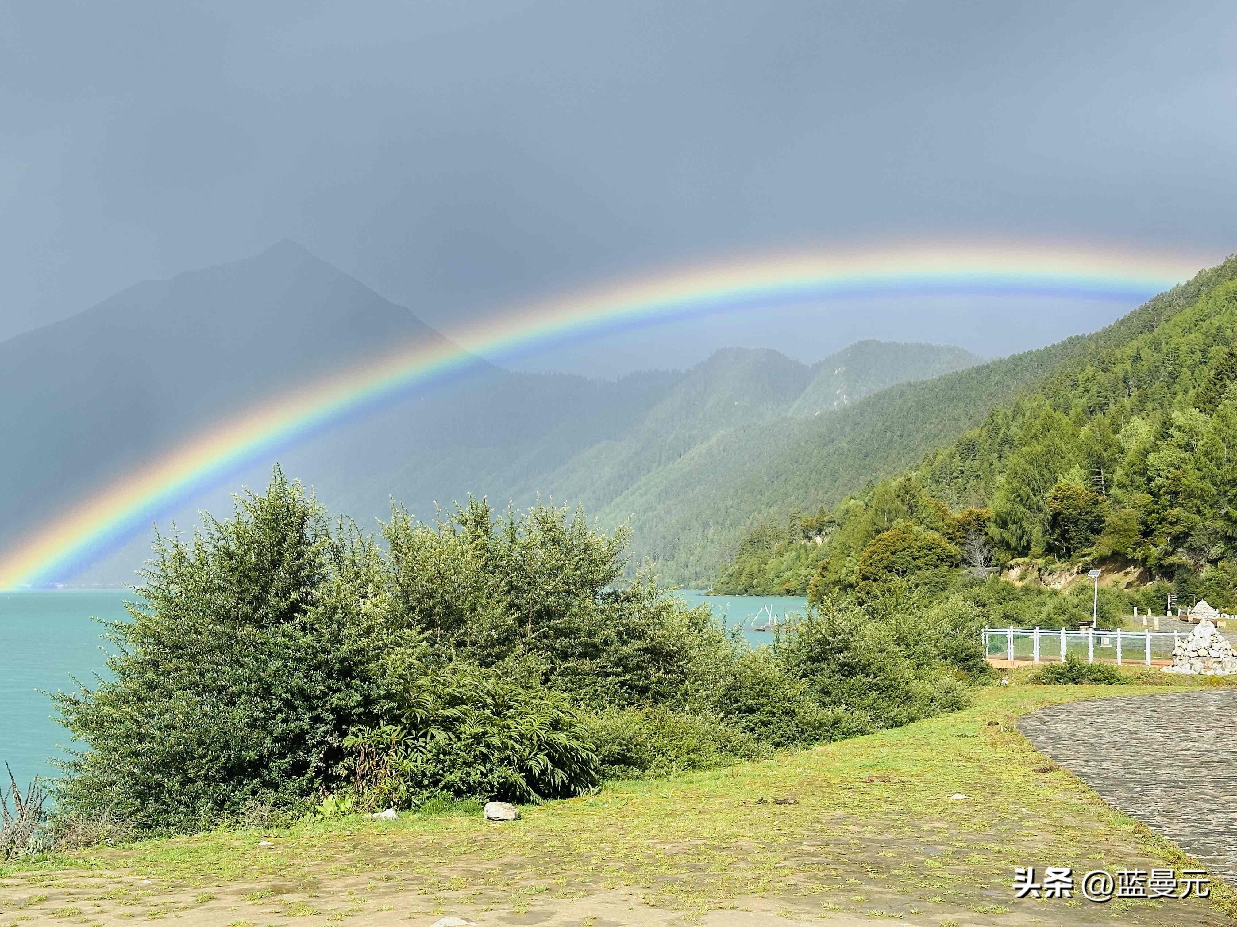 因为路上,我看到了最美最神奇的彩虹,好从湖里跨上山顶的彩色拱桥,如梦如幻,美得不真实。
