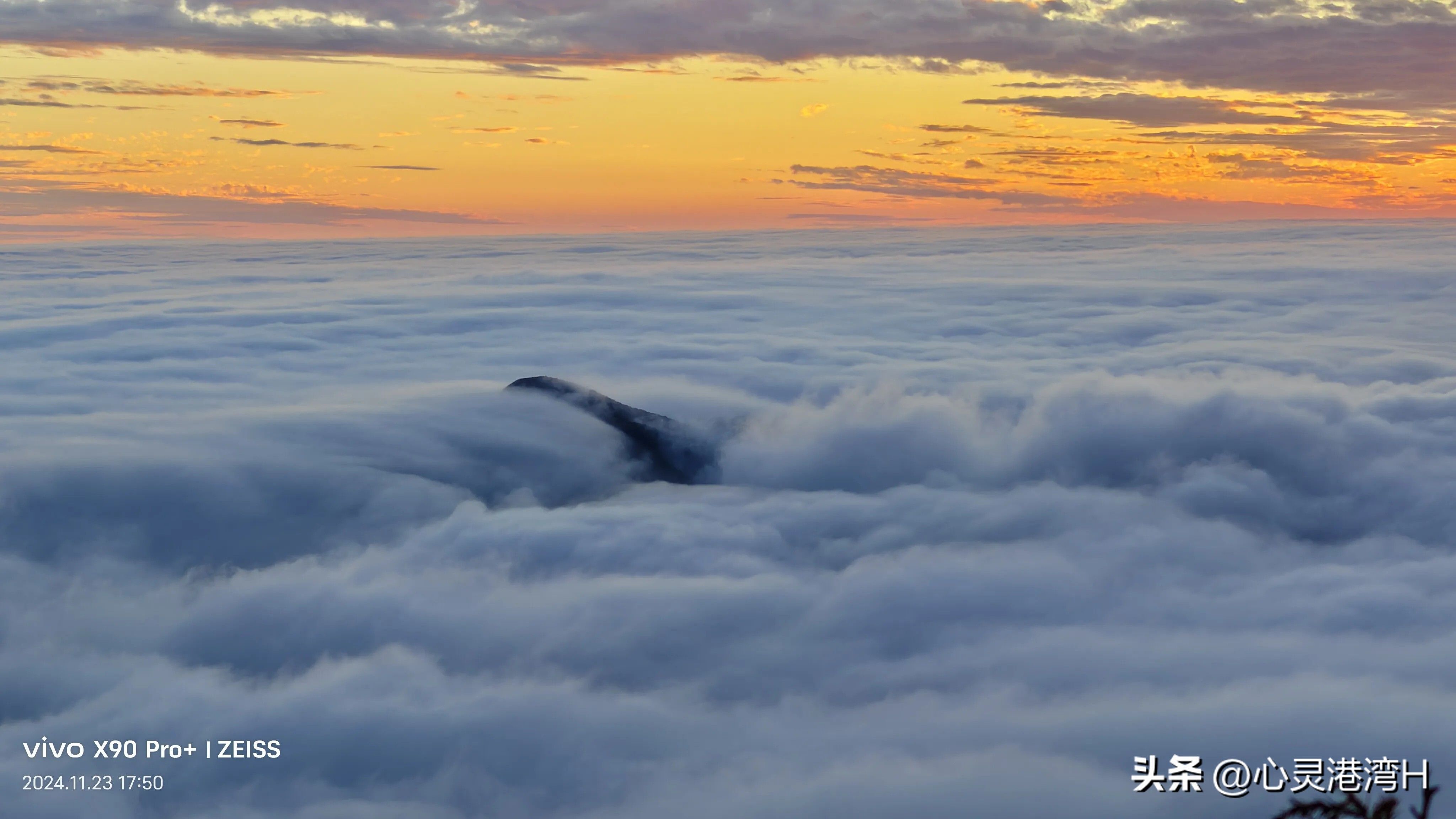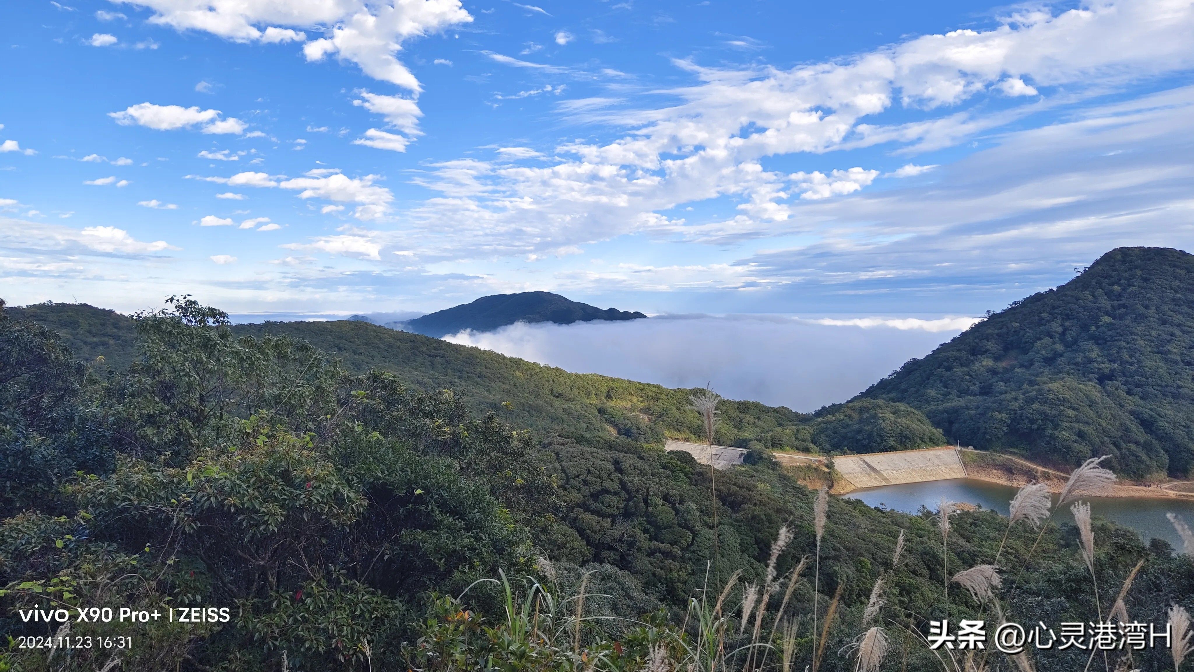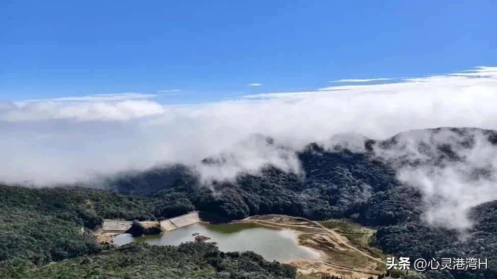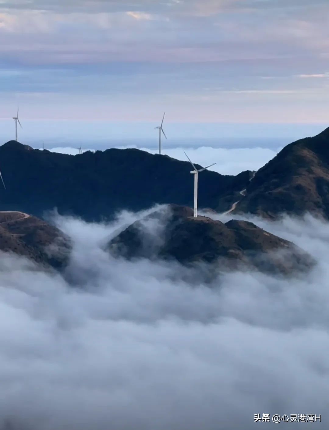 终于我们登上了粤西最高峰——大田顶,站在山巅观景台,眼前的景象让我心潮澎湃。云海翻腾,似棉絮堆积,又如波涛汹涌的白色海洋。那些平日里高耸入云的山峰,此刻只露出黑黑的,尖尖的角,仿若云海中的孤岛。我伫立其中,微风拂面,衣袂飘飘,我仿佛已化身为孙悟空,不停地在几块云朵之间跳来跳去,脚下是无尽的云浪翻涌,美极了,真是不枉此行,潇洒地走一回!我从未见过的奇幻景象,云与水在此刻模糊了界限,只觉天地一色,自己渺小如沧海一粟。