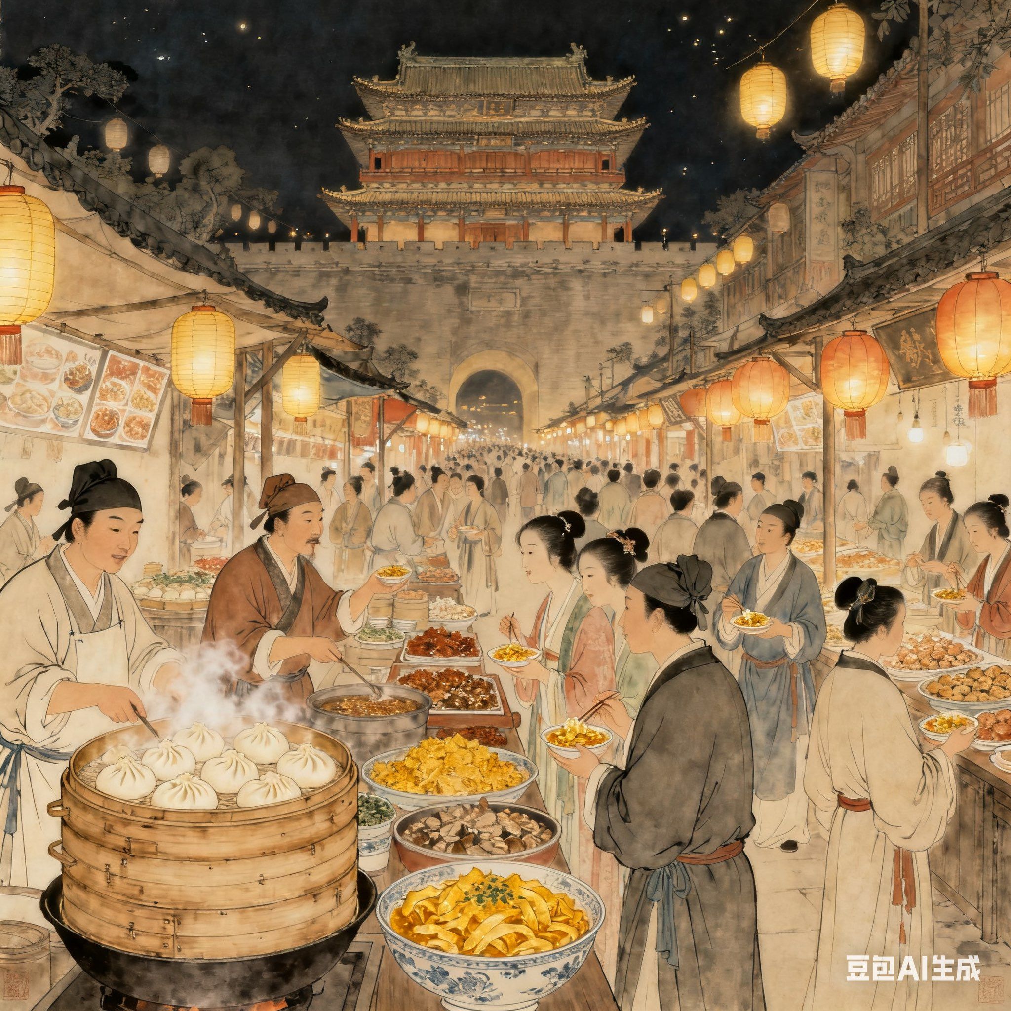 傍晚时分,直奔鼓楼夜市,这里是开封最具烟火气的地方。当夜幕降临,华灯初上,数百个摊位瞬间点亮,各种美食香气扑鼻而来。