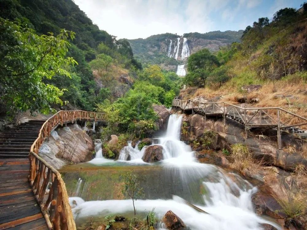 白水寨:有“北回归线上的瑰丽翡翠”之称,拥有原始森林、悬崖瀑布、高山湖泊等自然景观,9999级石阶的“天南第一梯”和海船木建造的亲水栈道十分独特,适合徒步吸氧。