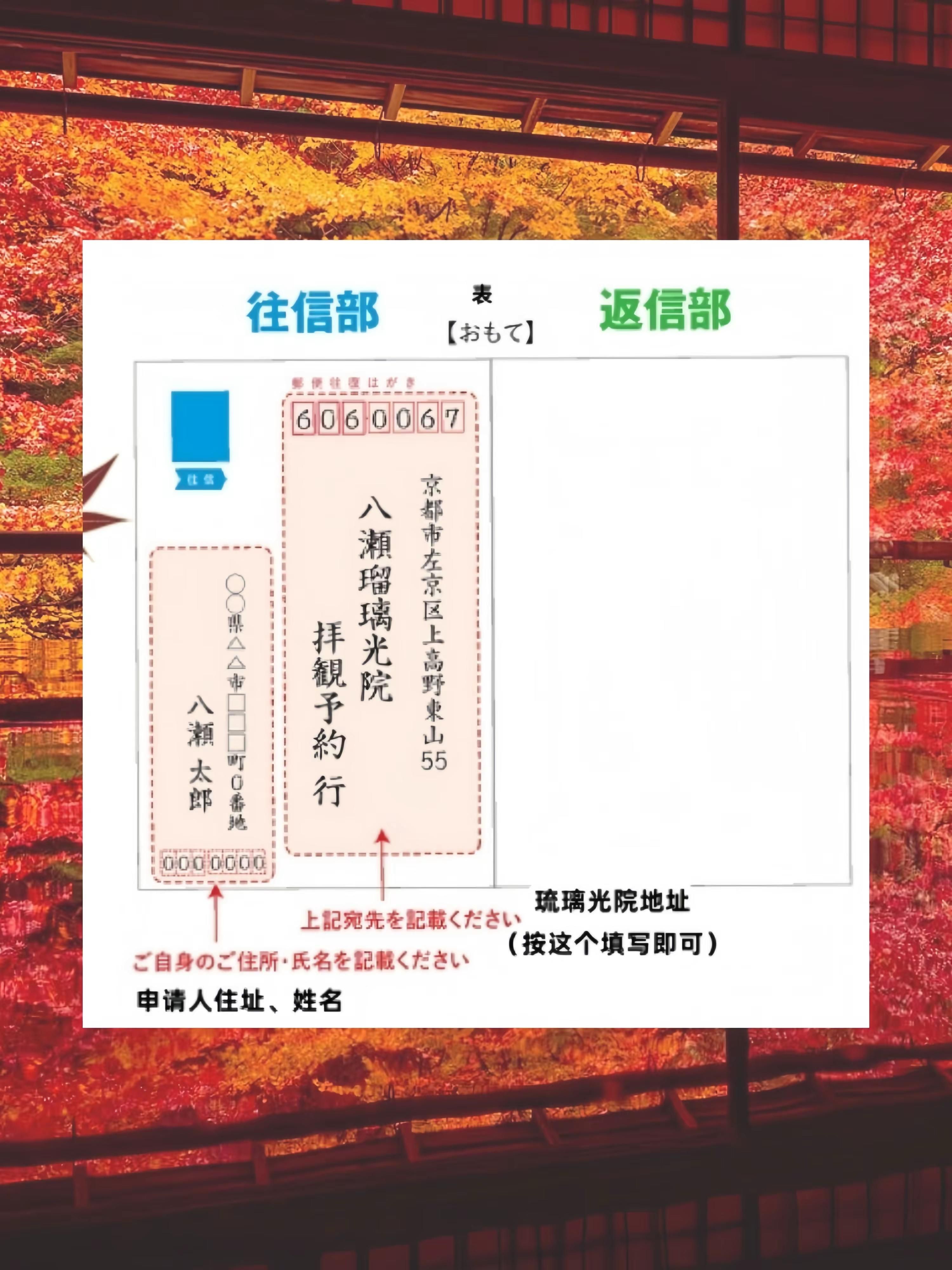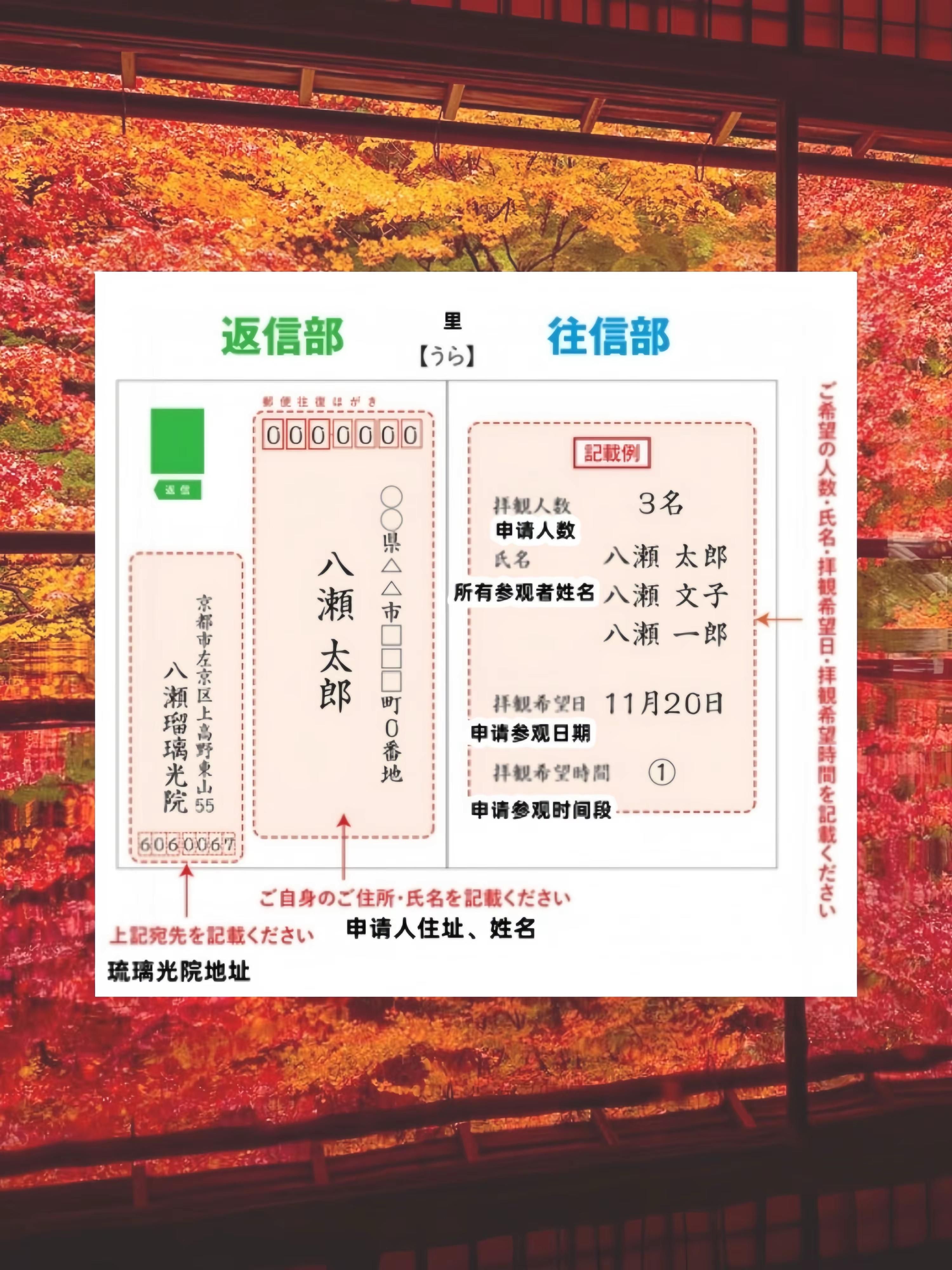 25年京都赏枫琉璃光院秋季预约全攻略。京都・琉璃光院-瑠璃光院|Rurikoin京都赏枫胜地,一座景色如画、幽深清净的古寺,位于京都高野川沿岸的八濑地区,东临比叡山,西望若丹山地,精致风雅的庭院备受好评,尤其当漫天红枫倒映在明镜般的桌面,整个画面澄澈梦幻,如同梦境.每年仅在春、夏、秋三季限定期间开放,秋季最为热门枫叶全红时仅限提前预约的游客才能入内参观2025琉璃光院・秋季特别参观期间 10月1日~12月14日参观时间 10:00-17:00(16:30前入园)※【11月8日~12月7日】为预约制,需要凭预约明信片入内参观时间 09:00-18:00(17:30前入园).预约方式 明信片申请后抽选*不住日本的宝子可能需要找在当地生活的朋友帮帮忙啦申请期限:9月16日前寄出(抓紧时间啦)明信片填写方式-日本邮局或便利店,购买【往復はがき】(往返明信片)-按要求填入寄出寄到地址,以及参观人数、姓名、日期、时间段信息(如图8、9)*参观时间段(填写时可填写番号即可)9:00-11:0011:00-13:0013:00-15:0015:00-17:00 抽选结果发表:9月25日起,向中选者寄回明信片 参观当天:需携带寄回的明信片+所有参观人的身份证件入场※寄回的明信片中,会指定20分钟的接待入内的时间,请按时前往 其他常见问题中选后未前往参观,会收取参观费用作为取消手续费若未携带身份证件、或出示证件与申请信息不同,将无法入场参观一张明信片可申请1-4人,小学生及以下儿童不用申请,但一位大人至多携一位儿童入内申请后,日期、人数等信息无法变更----------具体信息---------大人 2000日元|学生(初中生以上)1000日元京都市左京区上高野東山55番地京都叡山电铁本线-八濑比叡山口,出站后步行约12分钟可达※琉璃光院没有停车场,特别参观期间附近不开放私家车通过,建议公共交通前往-※素材源网络#CocoRun #京都 #日本枫叶季 #日本旅行攻略 #京都旅行