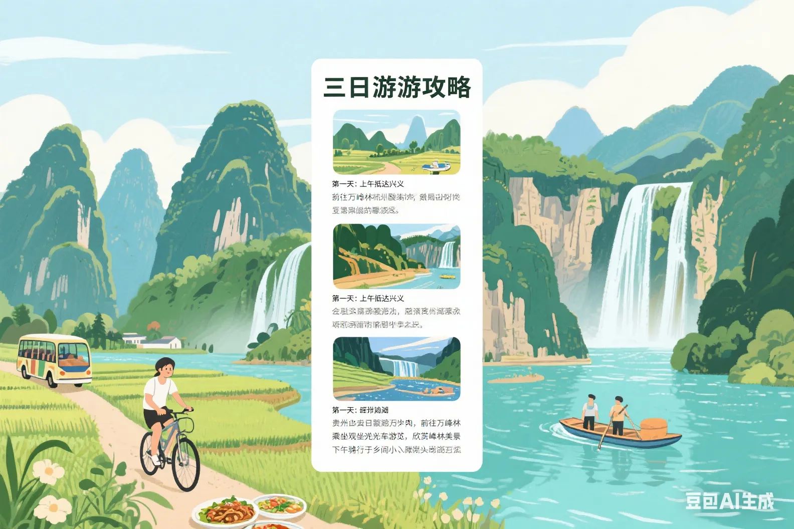 - 上午:抵达兴义后,前往万峰林景区,乘坐观光车欣赏峰林美景,在观景点拍照打卡,之后到纳灰村,可自驾、骑车游览田园风光,体验少数民族活动。