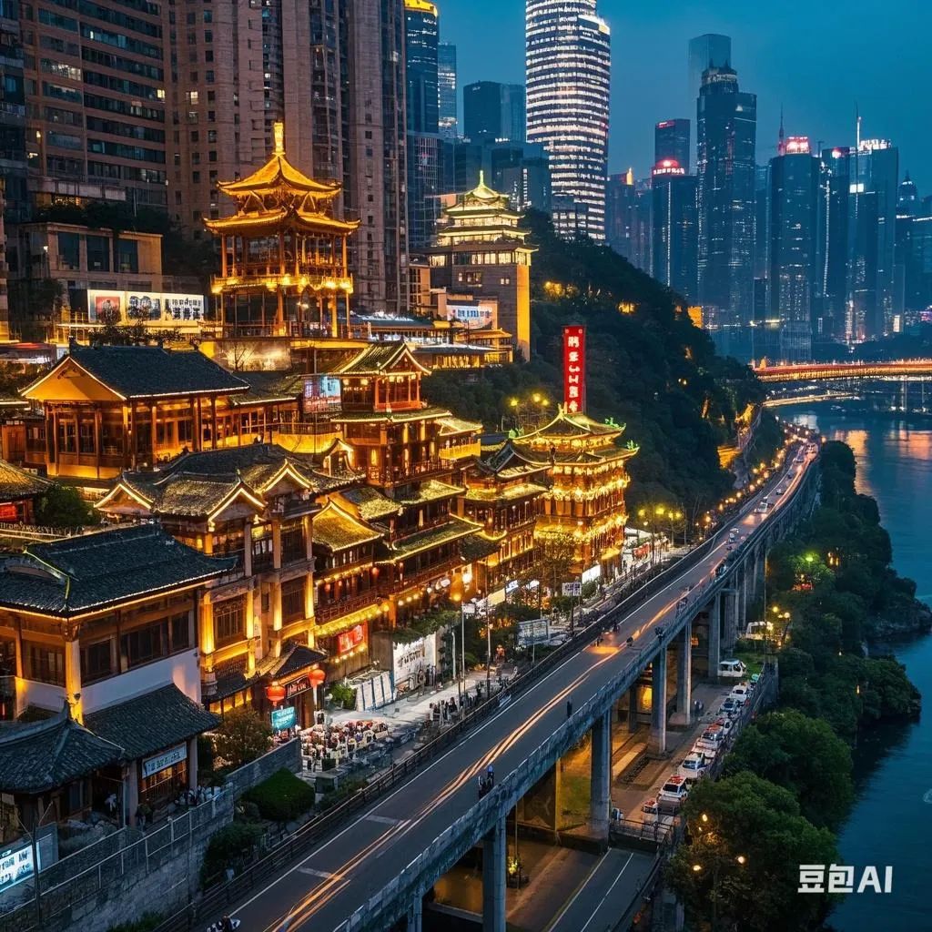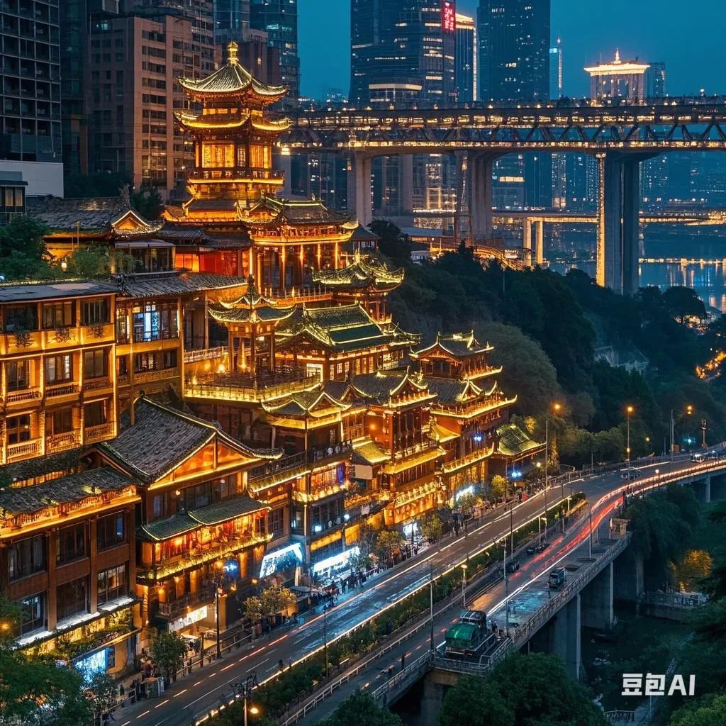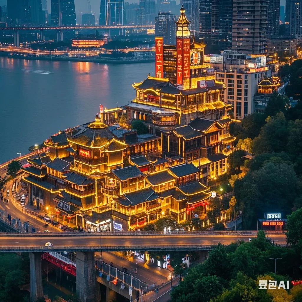 2. **洪崖洞夜景**:现实版《千与千寻》,灯火璀璨的吊脚楼倒映江面,随手一拍就是大片,文案直接抄:“庆幸在洪崖洞,与童话重逢”。