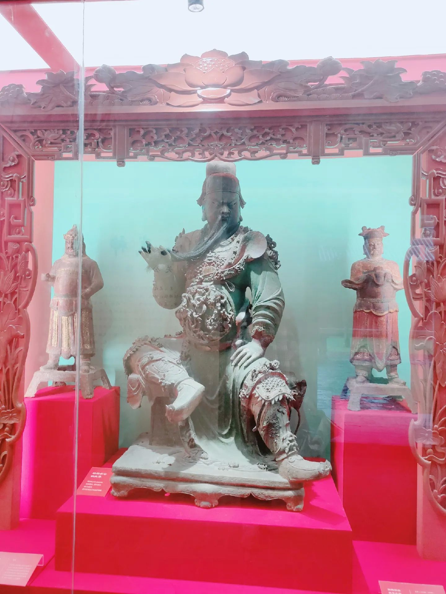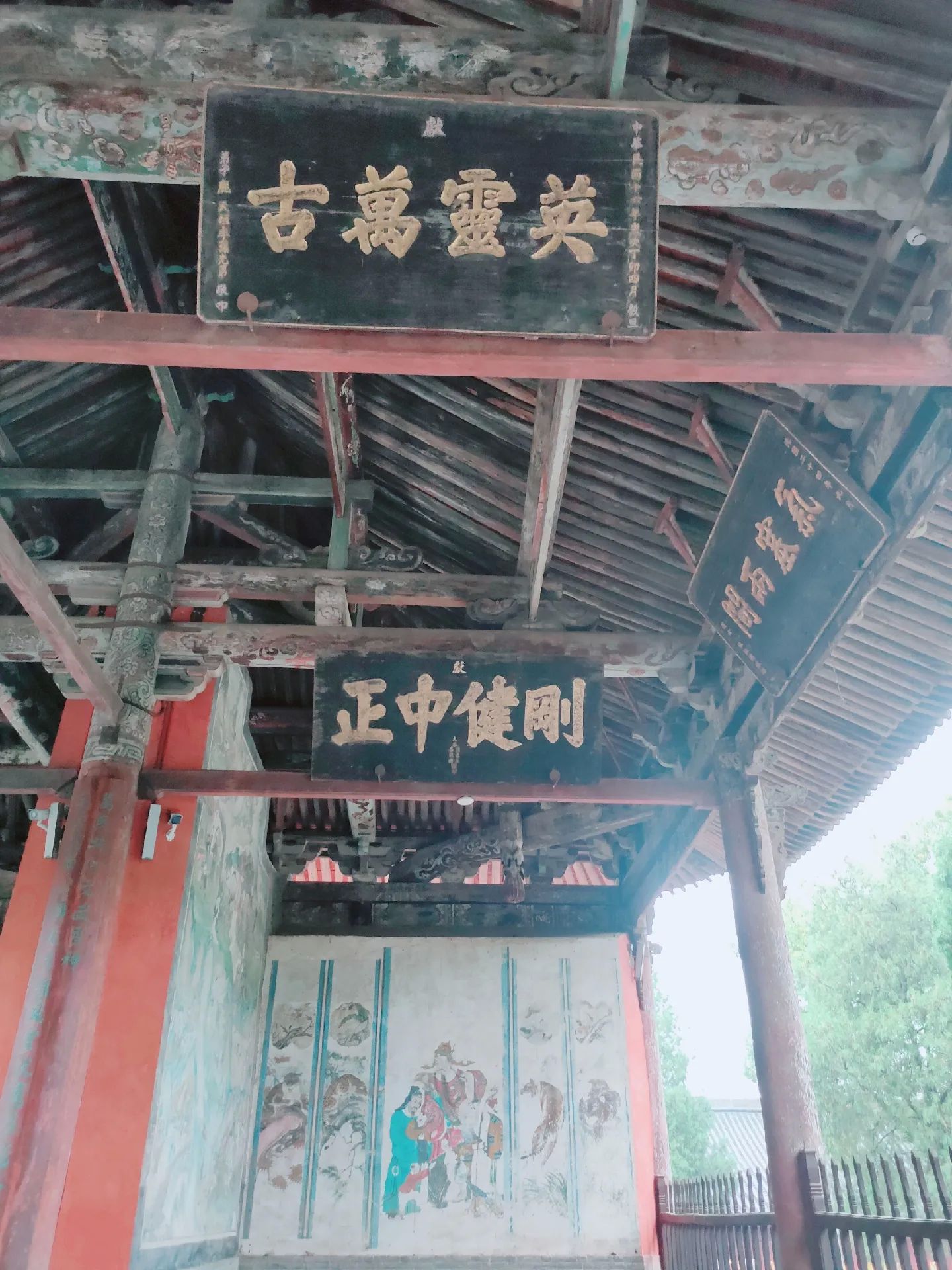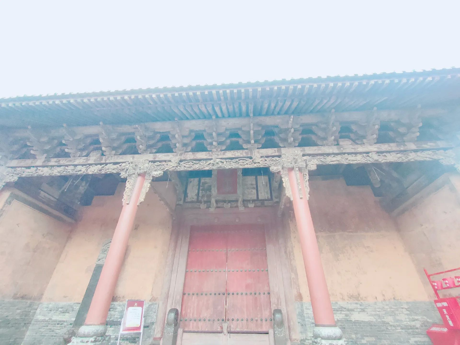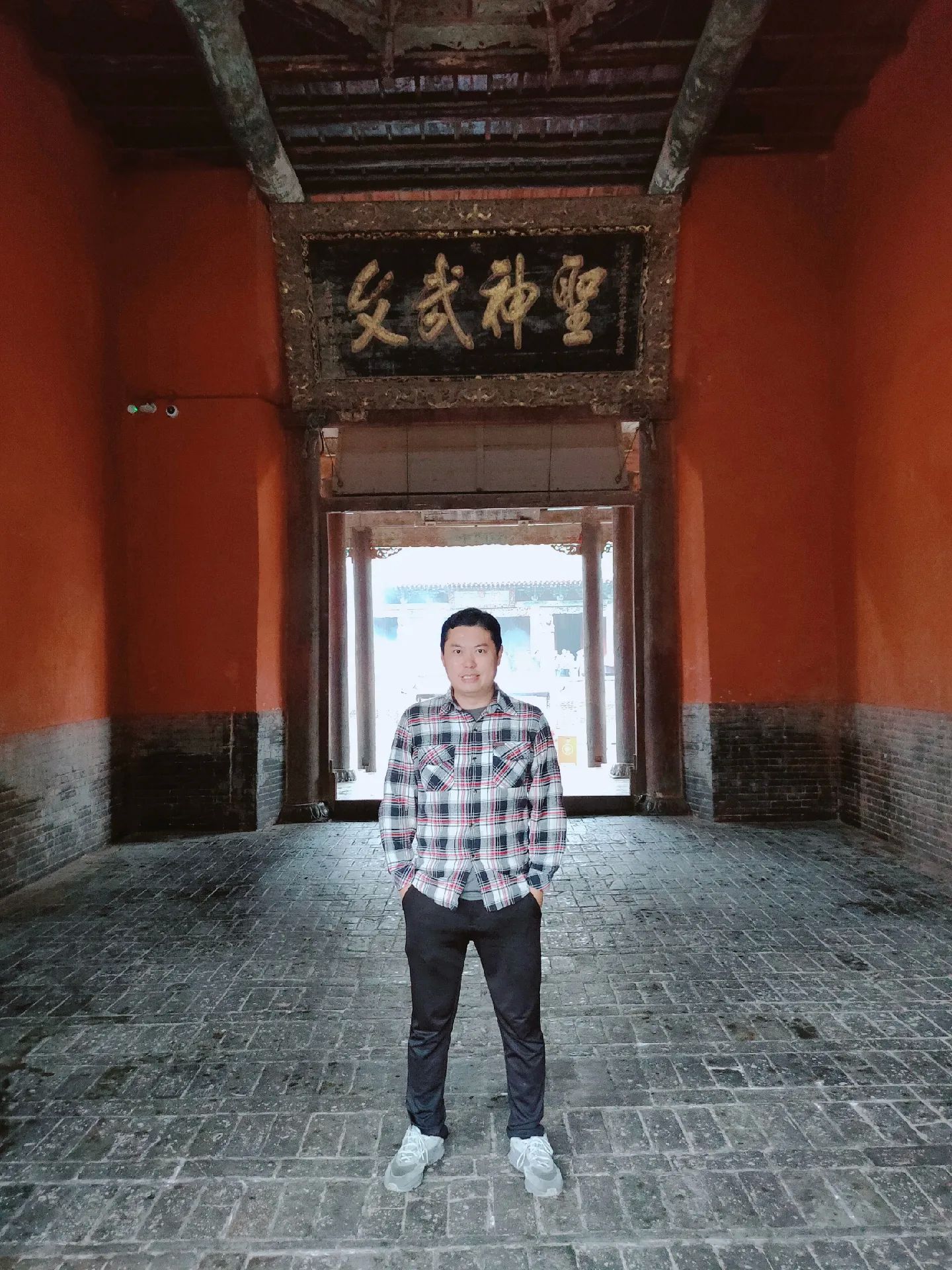 3 端门位于关帝祖庙最南端,为主庙正南门。重建于明嘉靖年间,是一座古朴恢宏的砖结构宫门。外观砖雕为仿木建筑,门楣正中镌刻关帝庙三大字。门洞背面上方有扶汉人物匾额,两次间门洞上层东面横额为精忠贯日,西为大义参天。