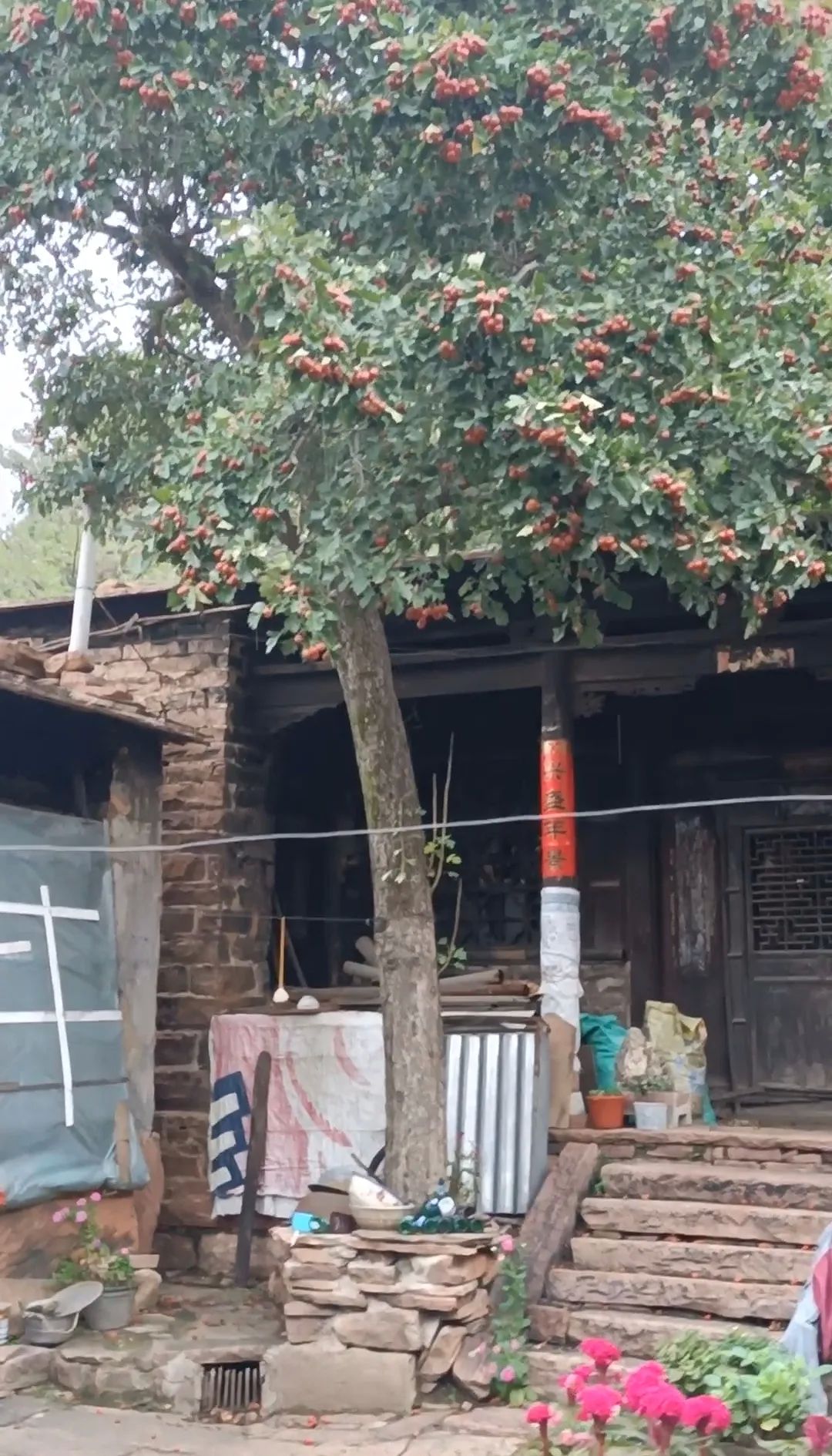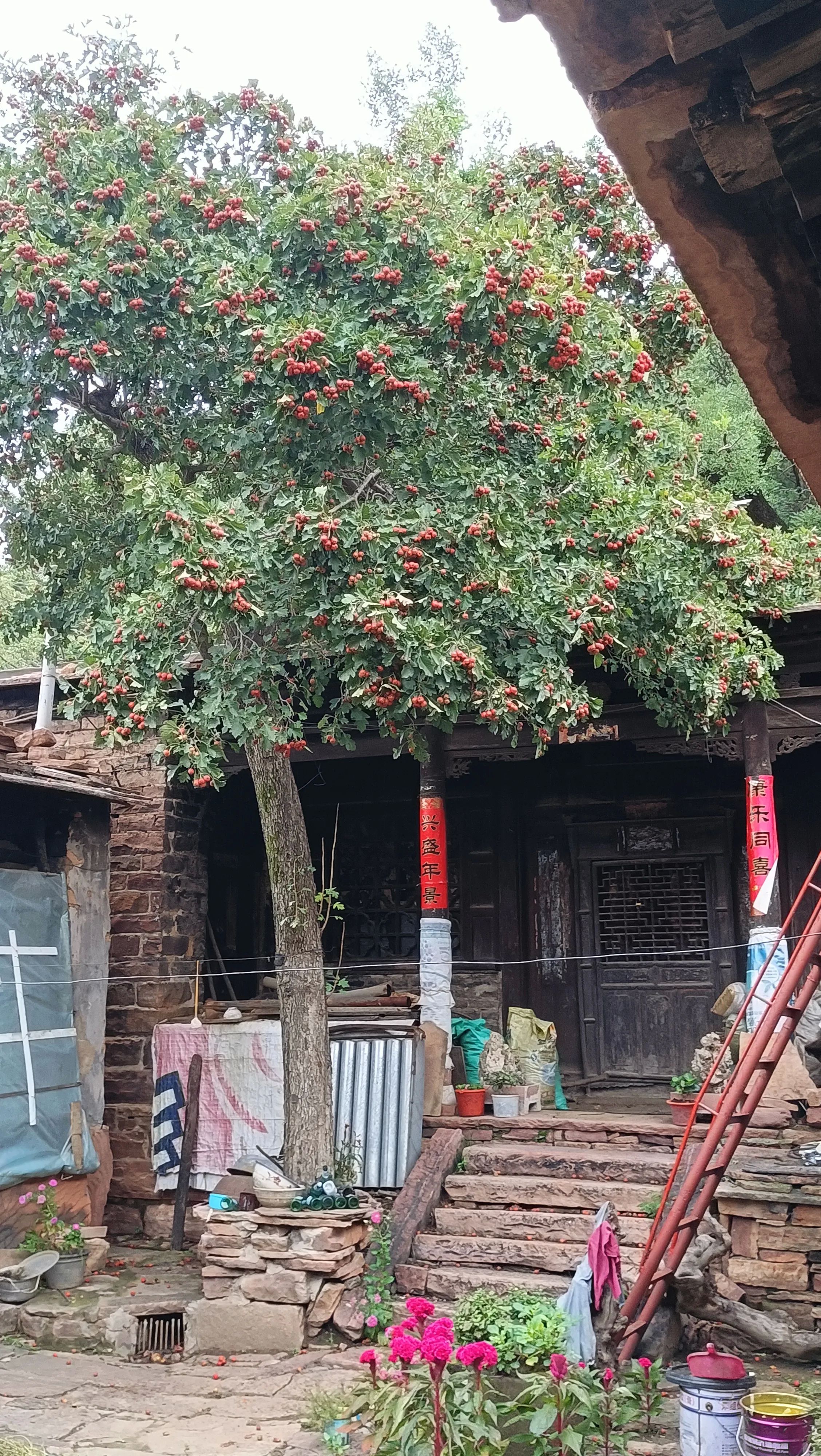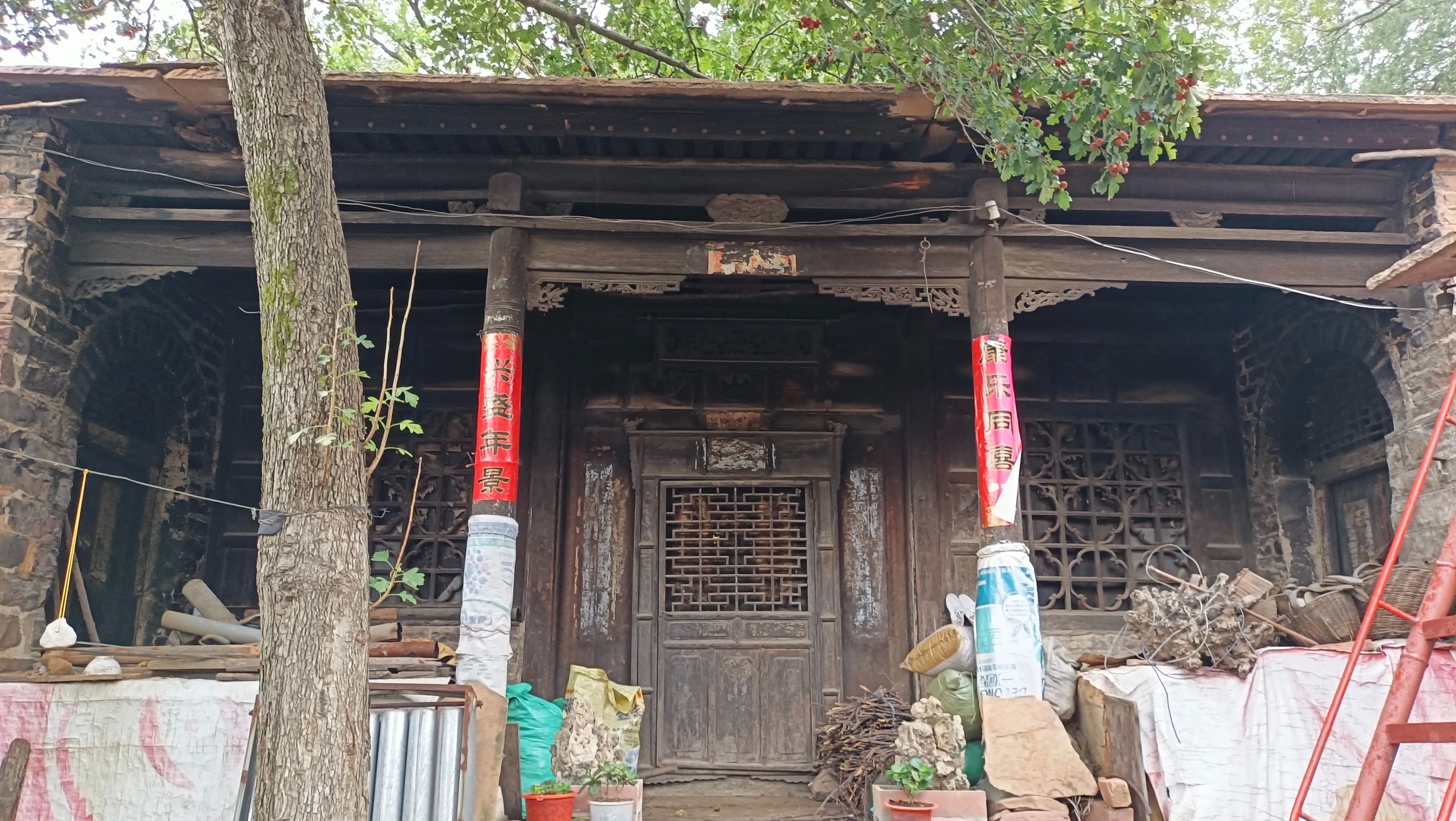 这个院落坐北朝南,院中有一颗近百年的山楂树,粗壮高耸,枝繁叶茂,正直金秋时节,硕果累累,满树的山楂红彤彤似团团火焰,预示着生活红红火火,主房是一座三明两暗的建筑,上得七级台阶,主房门外有单删风门,上方有木雕横匾,镂空木雕桂花缠枝,围绕中间一个寿字,寓意富贵绵长,健康长寿。横匾后面刻有秀山川三个字,横匾两侧又有云影二字,合起来就是“云影秀山川”,这句如诗如画的描绘,在秋日的山水间,云影与山色共同演绎着一场绝美的诗意盛宴。云影在山间穿梭,轻盈如纱,为山色增添了一份难以言喻的神秘韵味。我们站在屋门前,透过山楂树远眺青山,眼前这一幕幕,仿佛将人们带入了宋代诗人所描绘的“山色空蒙雨亦奇“的山水画卷之中,让人沉醉其中,尽情感受那份流转的诗意与美好,尤其是满树的山楂,氤氲着清幽的果香,让人如醉如痴,流连忘返,顿生留恋之意。这也正是北口村最著名的“山楂树大院“。
