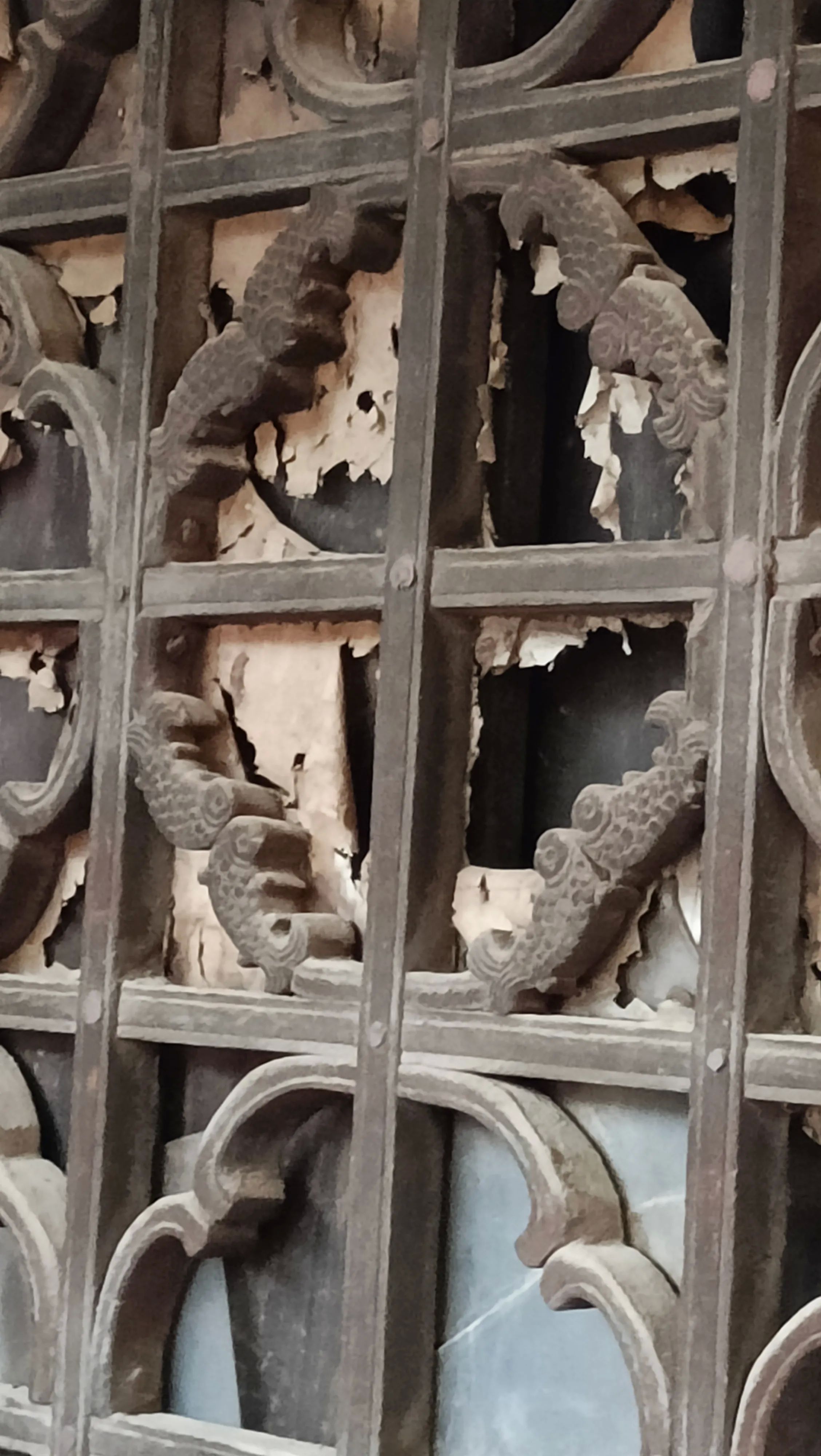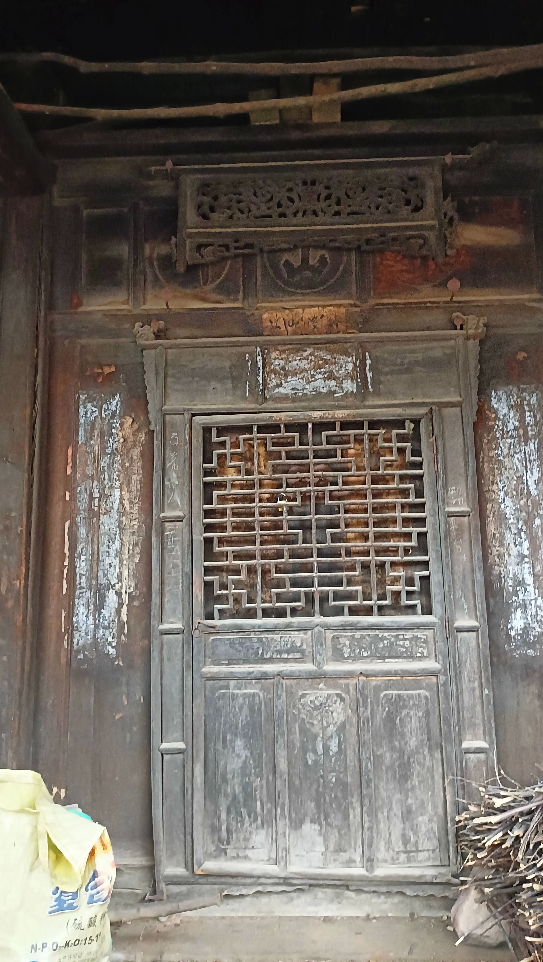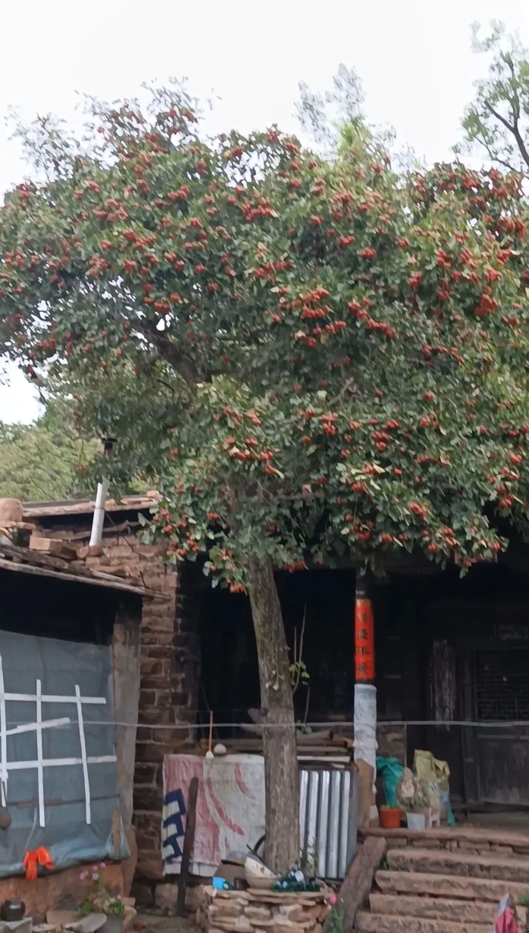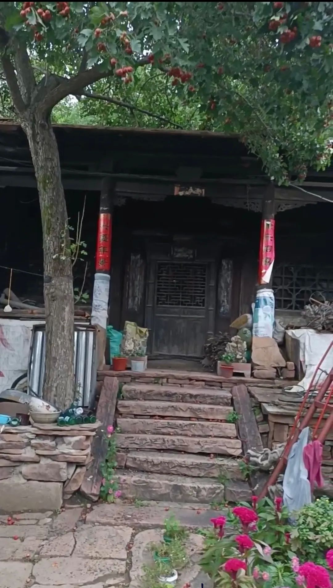 这个院落坐北朝南,院中有一颗近百年的山楂树,粗壮高耸,枝繁叶茂,正直金秋时节,硕果累累,满树的山楂红彤彤似团团火焰,预示着生活红红火火,主房是一座三明两暗的建筑,上得七级台阶,主房门外有单删风门,上方有木雕横匾,镂空木雕桂花缠枝,围绕中间一个寿字,寓意富贵绵长,健康长寿。横匾后面刻有秀山川三个字,横匾两侧又有云影二字,合起来就是“云影秀山川”,这句如诗如画的描绘,在秋日的山水间,云影与山色共同演绎着一场绝美的诗意盛宴。云影在山间穿梭,轻盈如纱,为山色增添了一份难以言喻的神秘韵味。我们站在屋门前,透过山楂树远眺青山,眼前这一幕幕,仿佛将人们带入了宋代诗人所描绘的“山色空蒙雨亦奇“的山水画卷之中,让人沉醉其中,尽情感受那份流转的诗意与美好,尤其是满树的山楂,氤氲着清幽的果香,让人如醉如痴,流连忘返,顿生留恋之意。这也正是北口村最著名的“山楂树大院“。