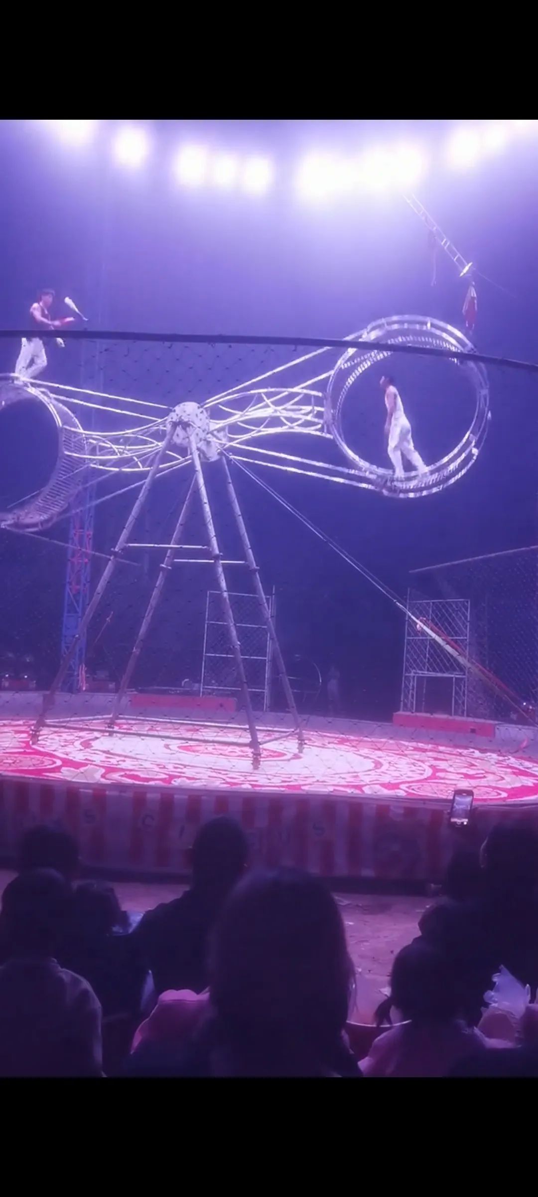 两个帅哥表演高空铁圈行走,开始是一个人在铁圈里旋转整个装置,当然他自己在铁圈里面行走,后来另一个人也跳上去了,不过这个是在铁圈外面,铁圈从最高处下落时他身子后仰,腿高抬,看着要掉下来的样子,观众一阵尖叫,生怕他掉下来了,他总能化险为夷,后来他又用黑布蒙着眼睛在铁圈外面行走,特别吓人,接着又表演在铁圈外面跳绳和扔三个道具。