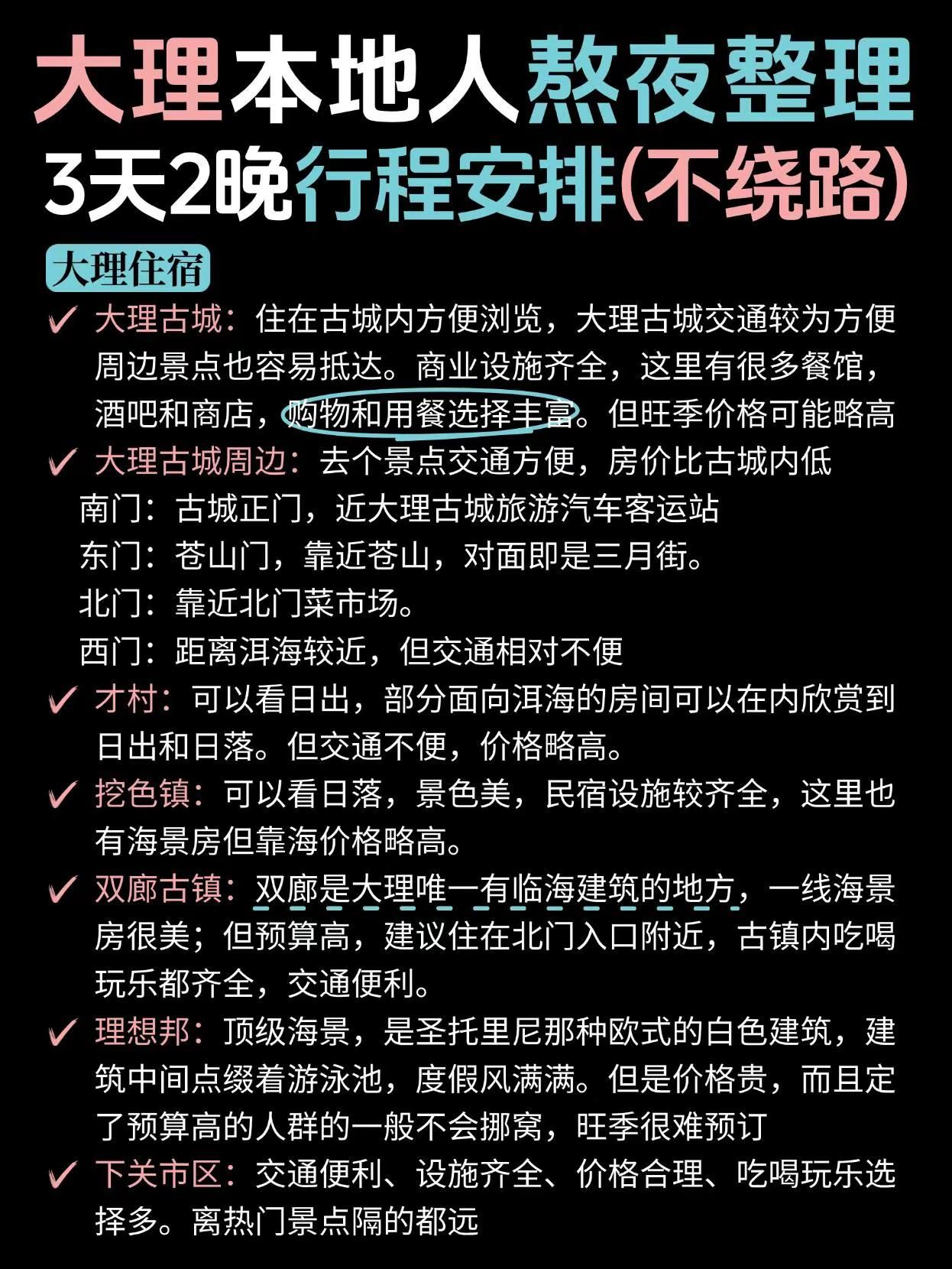 国庆大理3天2晚不绕路行程保姆级旅游攻略。9-10月假期不知去哪儿玩,不妨来躺大理,大理是一座壮丽自然风光和浓郁民族风情于一体的旅游胜地,跟着这篇大理三日游不绕路游玩攻略,助你轻松游玩大理~~~大理路3日游速通指南DAY1:凤阳邑苍洱大道寂照庵崇圣寺三塔大理古城DAY2:龙龛码头才村磻溪S湾廊桥喜洲古镇DAY3:双廊古镇鹿卧山文笔村理想邦兴盛大桥 抵达大理的交通飞机:大理凤仪机场出站口就可看到机场大巴【票价 25r】,可在“安心游大理”提前预定。终点站为大理古城风花雪月大酒店高铁:大理站出站口乘坐黄色大巴【5 r】,大巴直达古城,可在“安心游大理”预定。昆明大理:约 2.5 小时,单程票价 145 r起丽江大理:约2小时,单程票价 72 r起 大理住宿攻略大理古城:住在古城内方便浏览,,但旺季价格可能略高大理古城周边:去个景点交通方便,房价比古城内低南门:古城正门,近大理古城旅游汽车客运站东门:苍山门,靠近苍山,对面即是三月街。北门:靠近北门菜市场。西门:距离洱海较近,但交通相对不便才村:可以看日出,但交通不便,价格略高。挖色镇:可以看日落,这里也有海景房但靠海价格略高。双廊古镇:一线海景房很美;但预算高理想邦:顶级海景,但是价格贵,旺季很难预订下关市区:交通便利、吃喝玩乐选择多。离热门景点隔的都远#大理旅游 #大理旅游攻略 #大理旅游打卡地 #大理旅游景点推荐