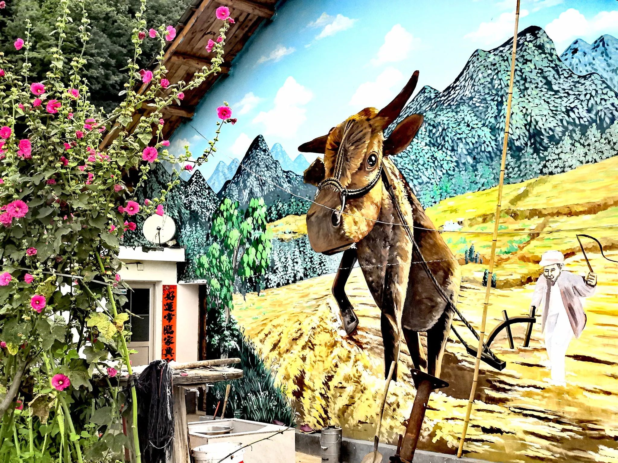 东宝塔有着独特的韵味。古老的塔身矗立在那儿,被围了起来,好似在诉说着岁月的沧桑。塔旁的“吉祥羊山,康养福地”几个大字格外醒目。