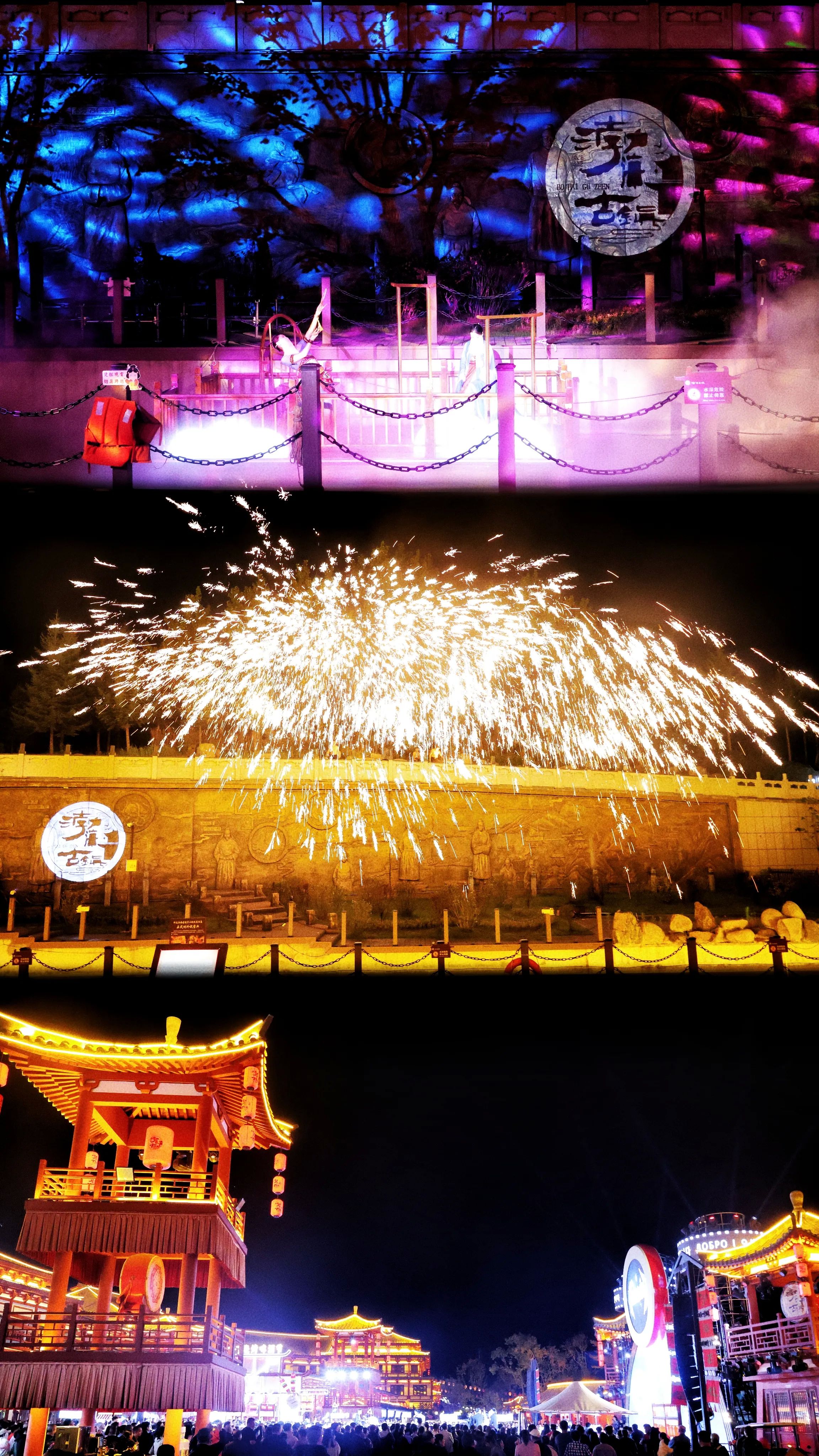 渤海古镇,一秒穿越到大唐盛世,坐花船夜游赏宫灯。宝藏玩法就是乘坐乌篷船夜航,穿越河道两岸灯笼高挂,霓虹烟雨中唯美浪漫,看非遗打铁花表演,飞出来的铁水化作漫天流星璀璨夺目,还有唐风乐舞表演,视觉体验美到失语。