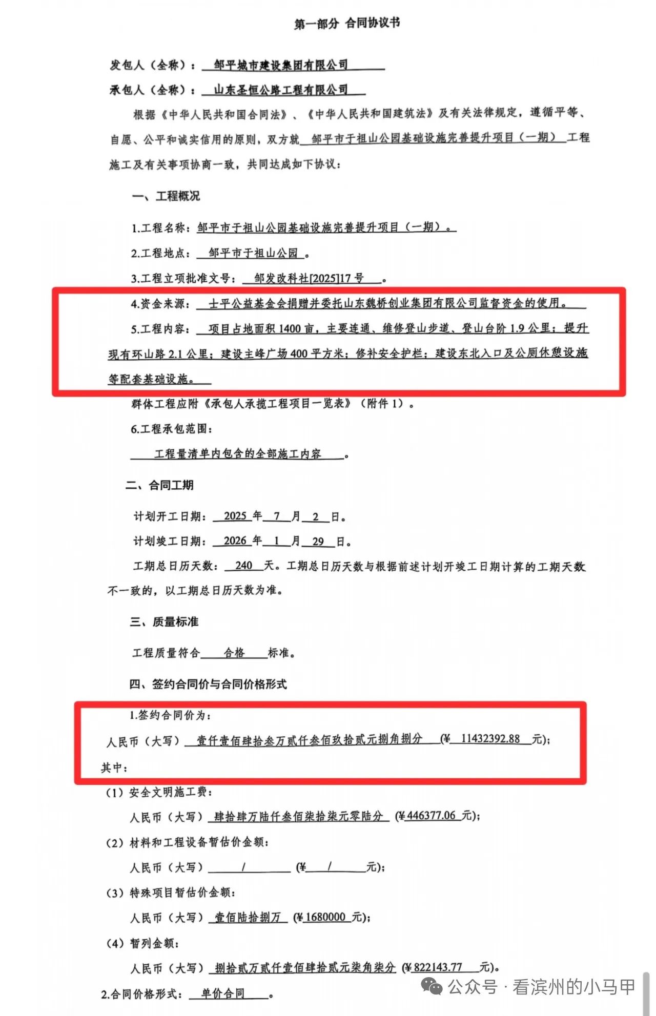 事实上,这只是于祖山公园建设的一部分,根据今年7月份《邹平市于祖山公园基础设施完善提升项目(一期)合同公示》内容显示,该项目占地面积1400亩,主要连通、维修登山步道、登山台阶1.9公里;提升现有环山路2.1公里;建设主峰广场400平方米;修补安全护栏:建设东北入口及公厕休憩设施等配套基础设施等。项目资金来源显示为士平公益基金会捐赠并委托山东魏桥创业集团有限公司监督资金的使用,签约合同价为11432392.88元,计划2026年1月底完工。据了解,该项目列入2025年邹平市12项民生实事,今年4月份,邹平市委常委会强调提速于祖山公园建设,将其与鹤伴山景区提升等工程并列,作为生态保护与城市更新的重点任务。