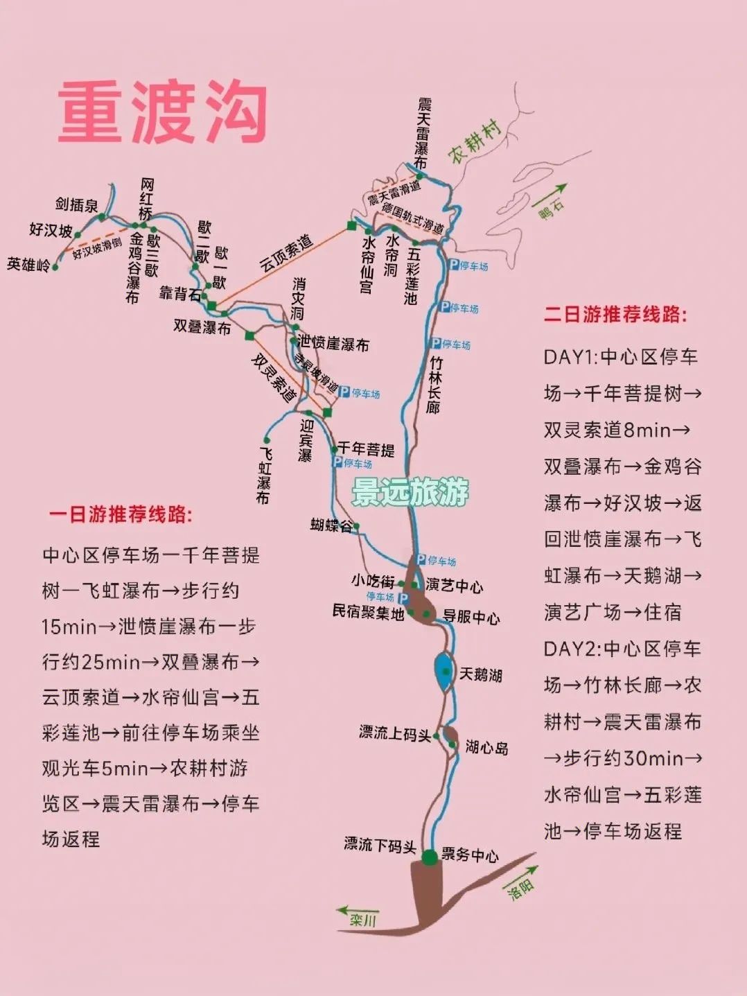 重渡沟景区较大,为大家分别整理了两种线路建议宝宝们根据自身自行选择
