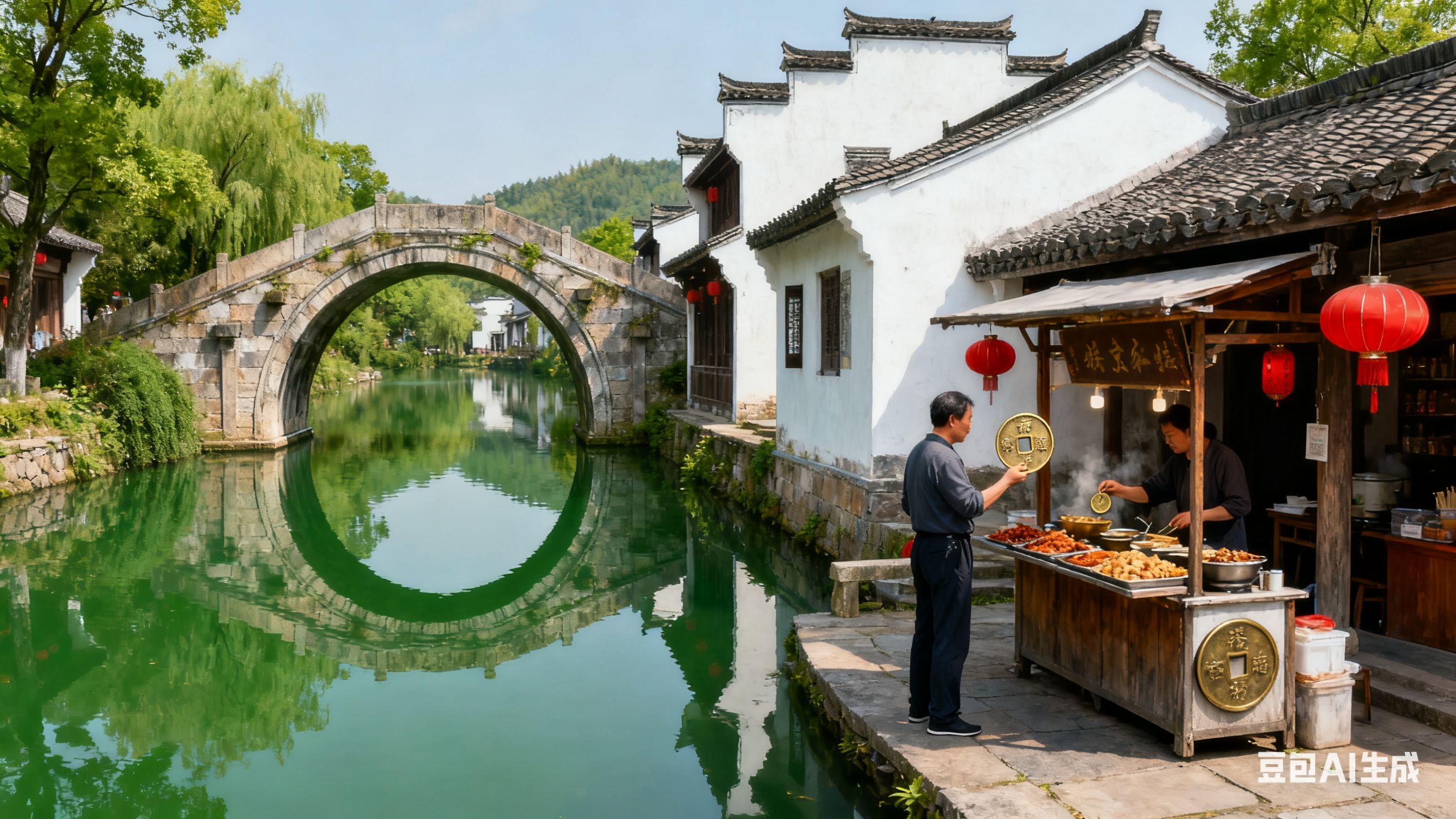 这个占地9000亩的小镇藏着太多惊喜,先去钱庄换袋铜钱,一碗馄饨3个铜板、羊肉汤6枚铜板,全是村民现做的家常味。忆江南十二景是必打卡的园林秘境,明清建筑抱崖而建,拱桥长廊藏在绿荫里,据说为农民耗时20年打造,堪比现实版绿野仙踪。