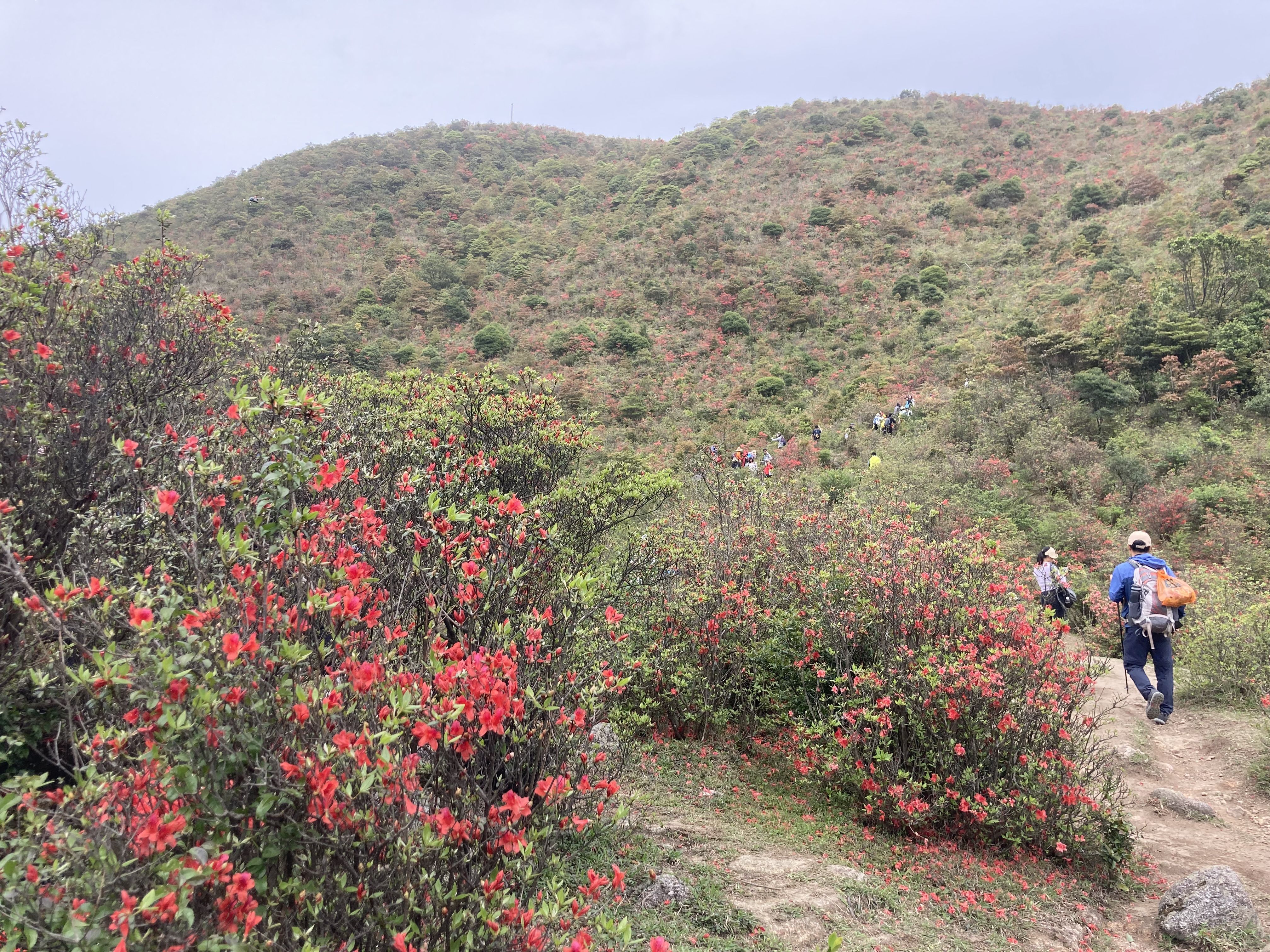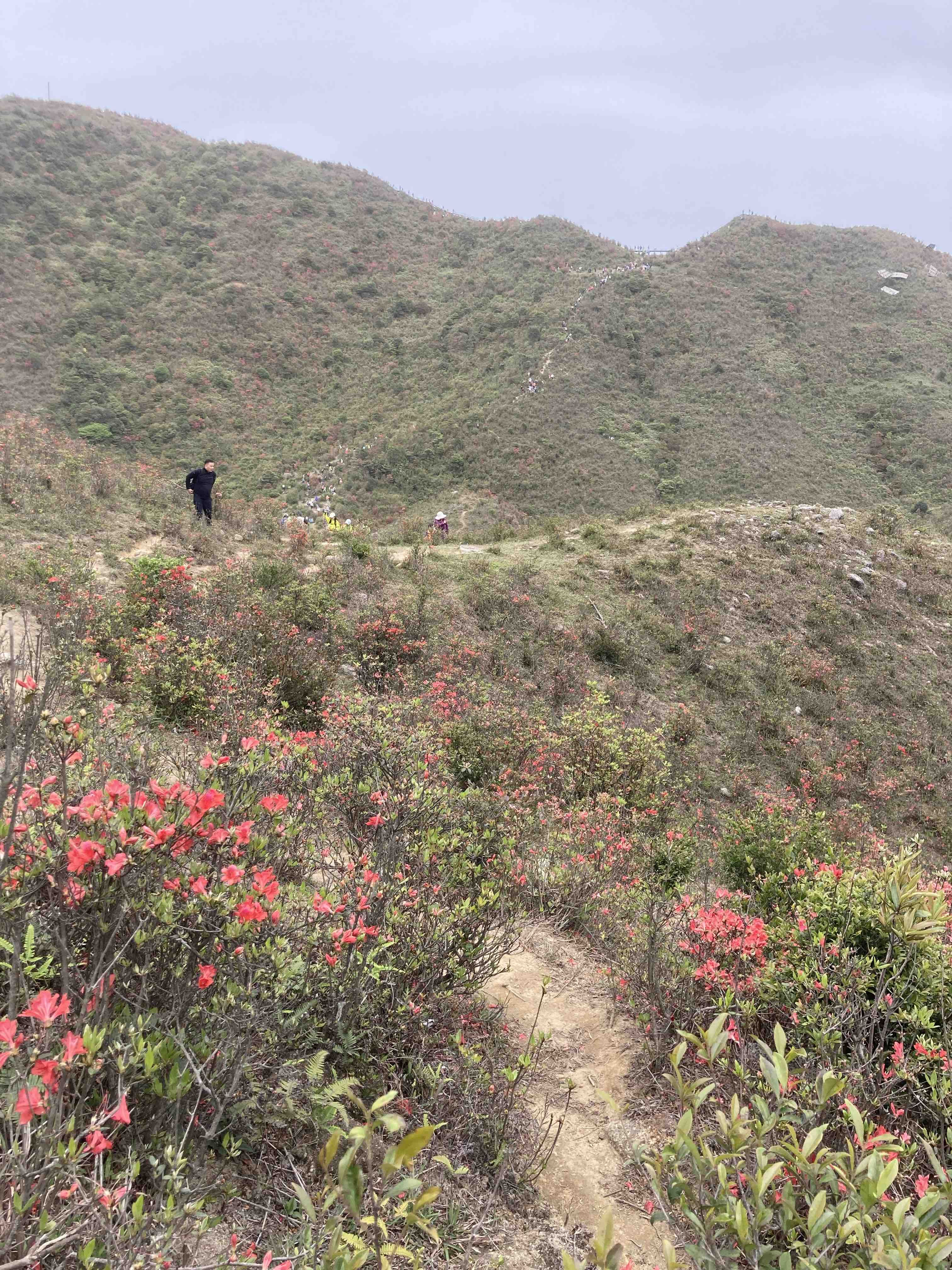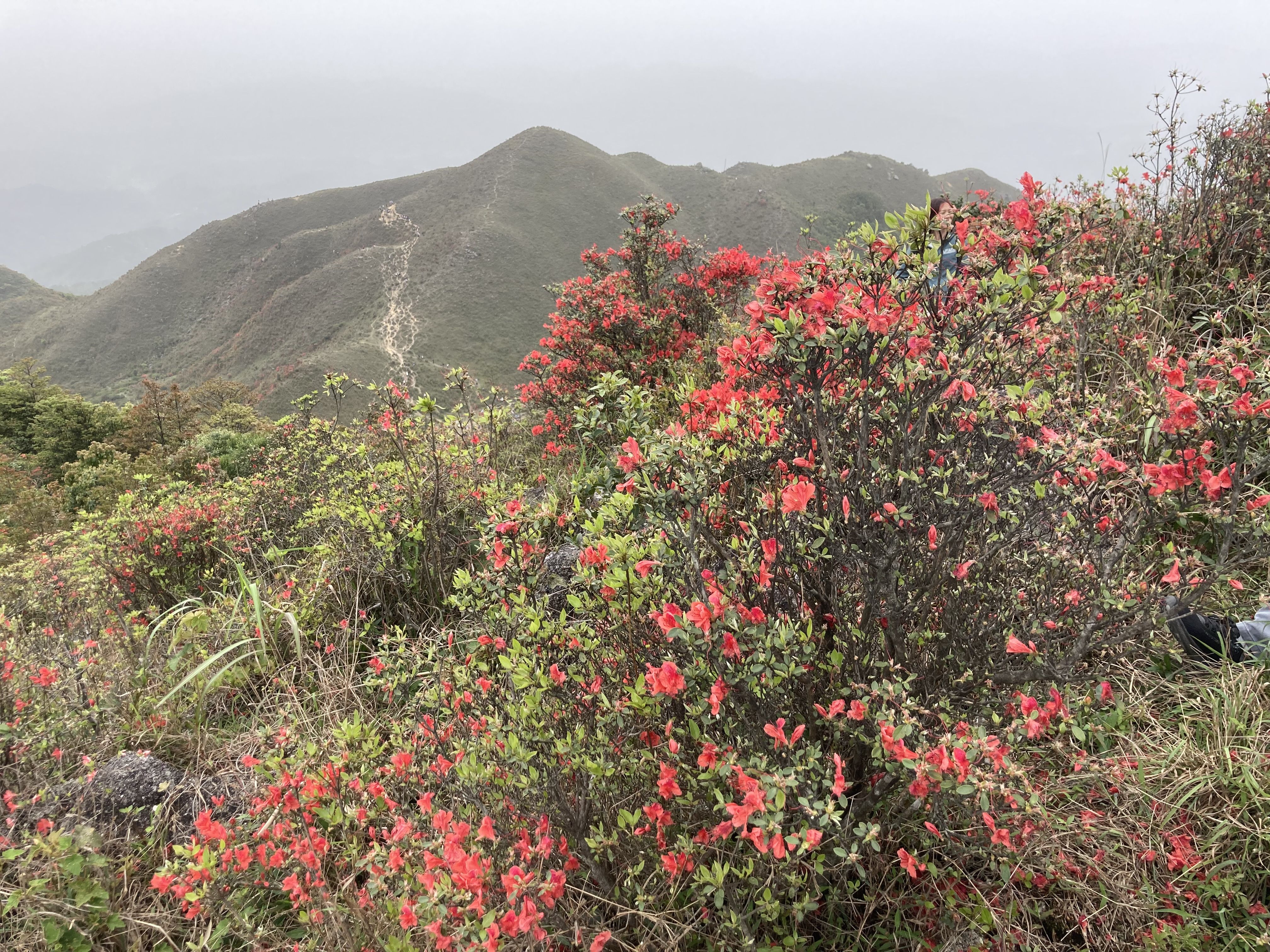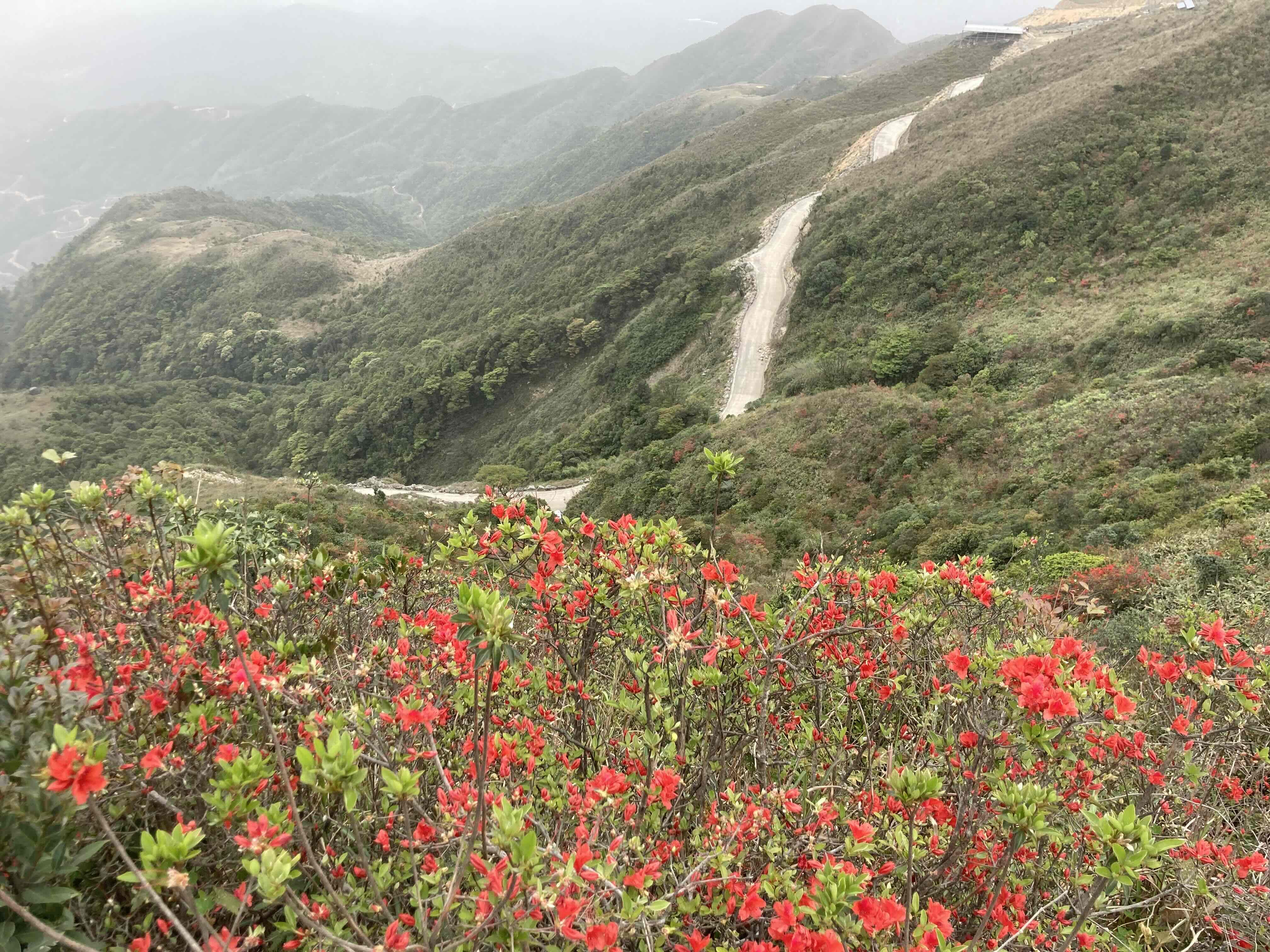 面对山脊线,右手边侧栈道有一段已损坏侧翻,但也能过去,最后和度假区盘山土路连接,风景一般,杜鹃少。只需从垭口走上这边栈道第一个坡顶即可,可见对侧满山杜鹃