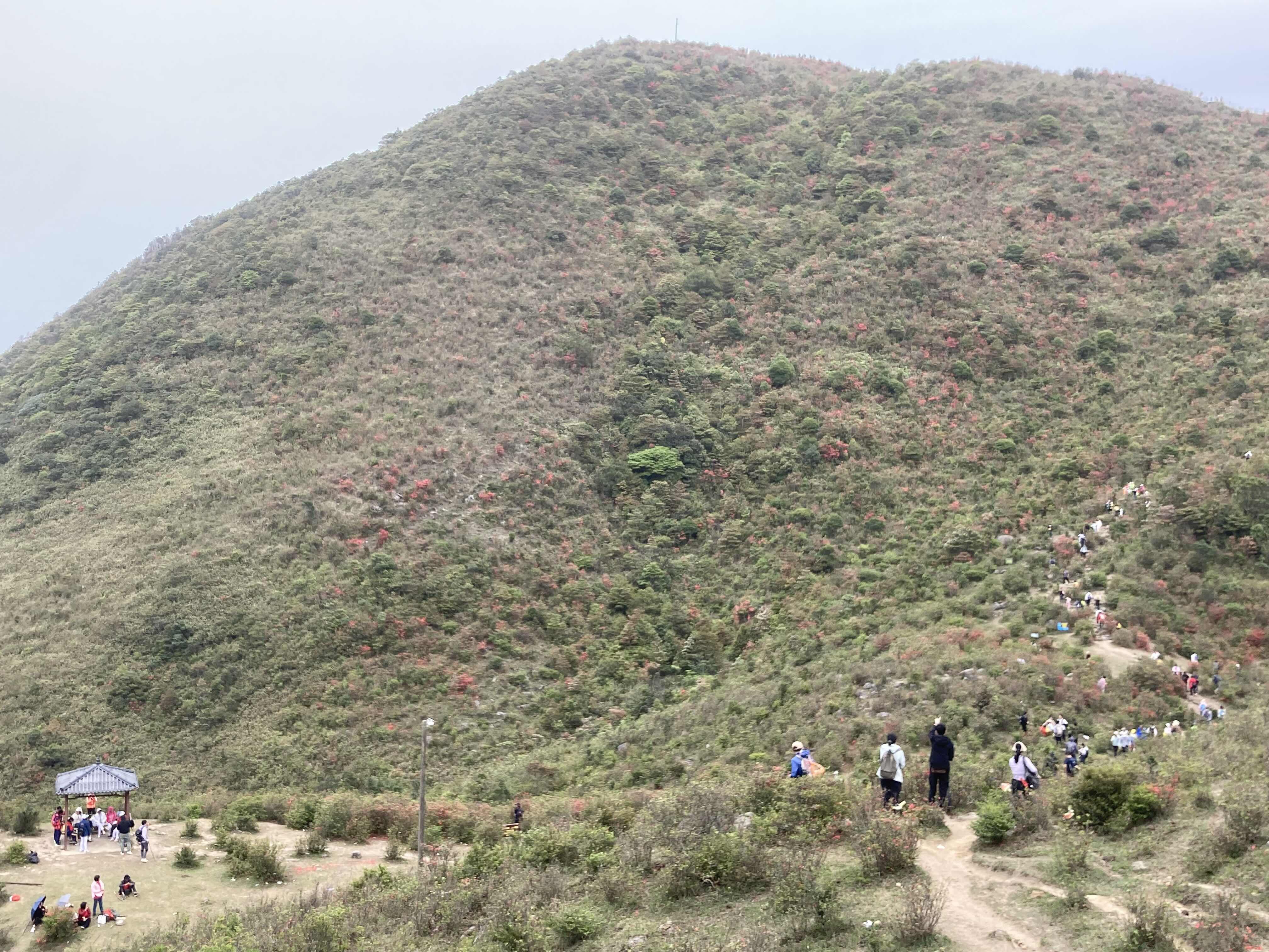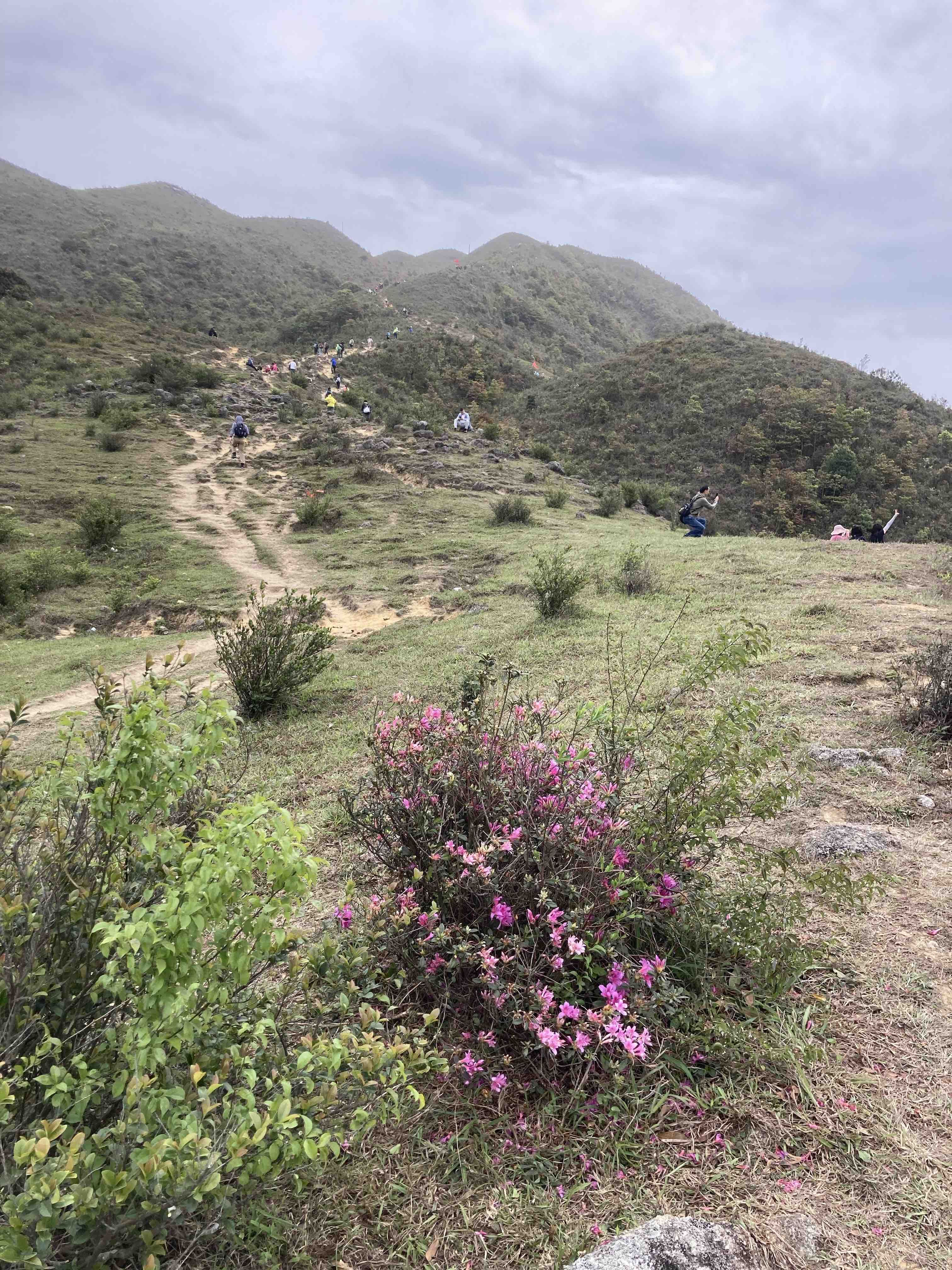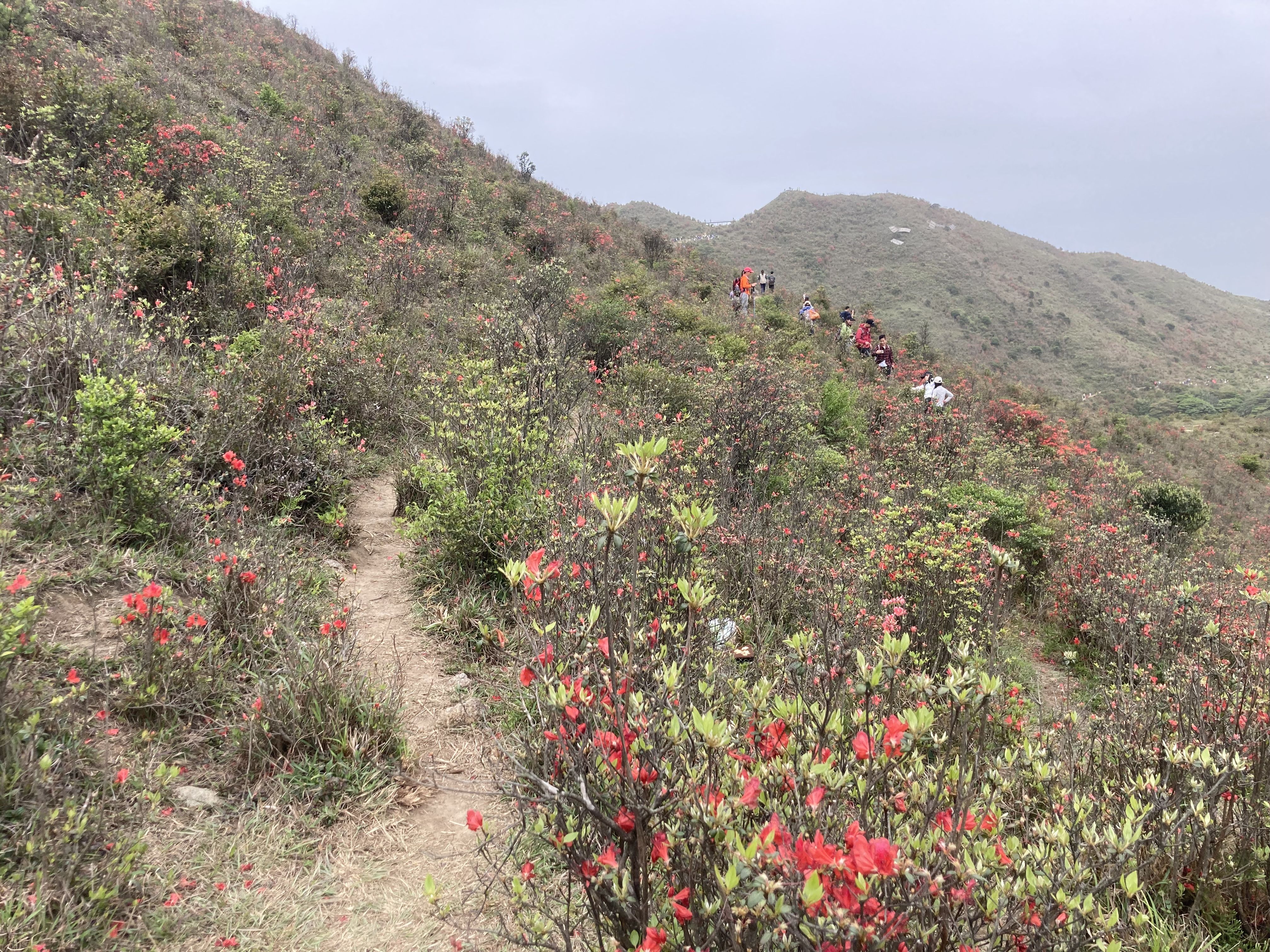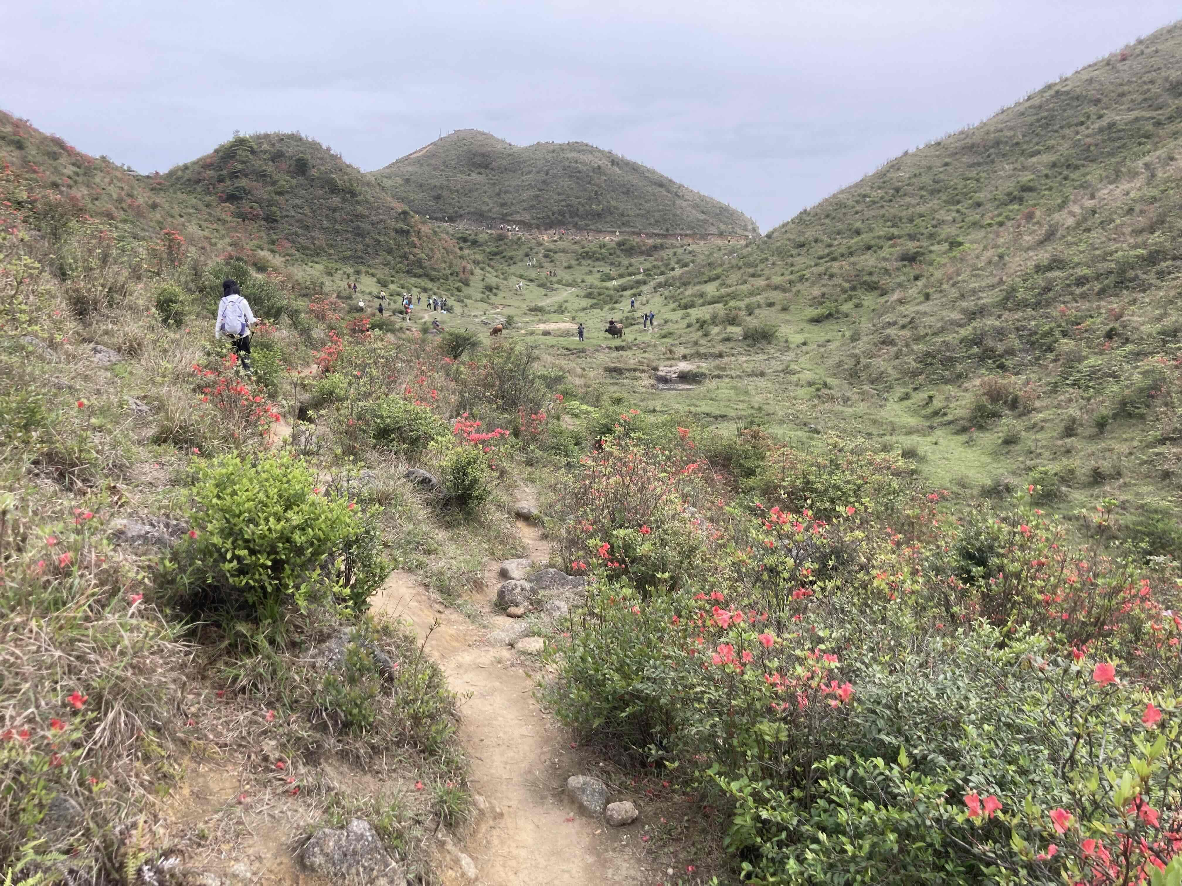 面对山脊线,右手边侧栈道有一段已损坏侧翻,但也能过去,最后和度假区盘山土路连接,风景一般,杜鹃少。只需从垭口走上这边栈道第一个坡顶即可,可见对侧满山杜鹃
