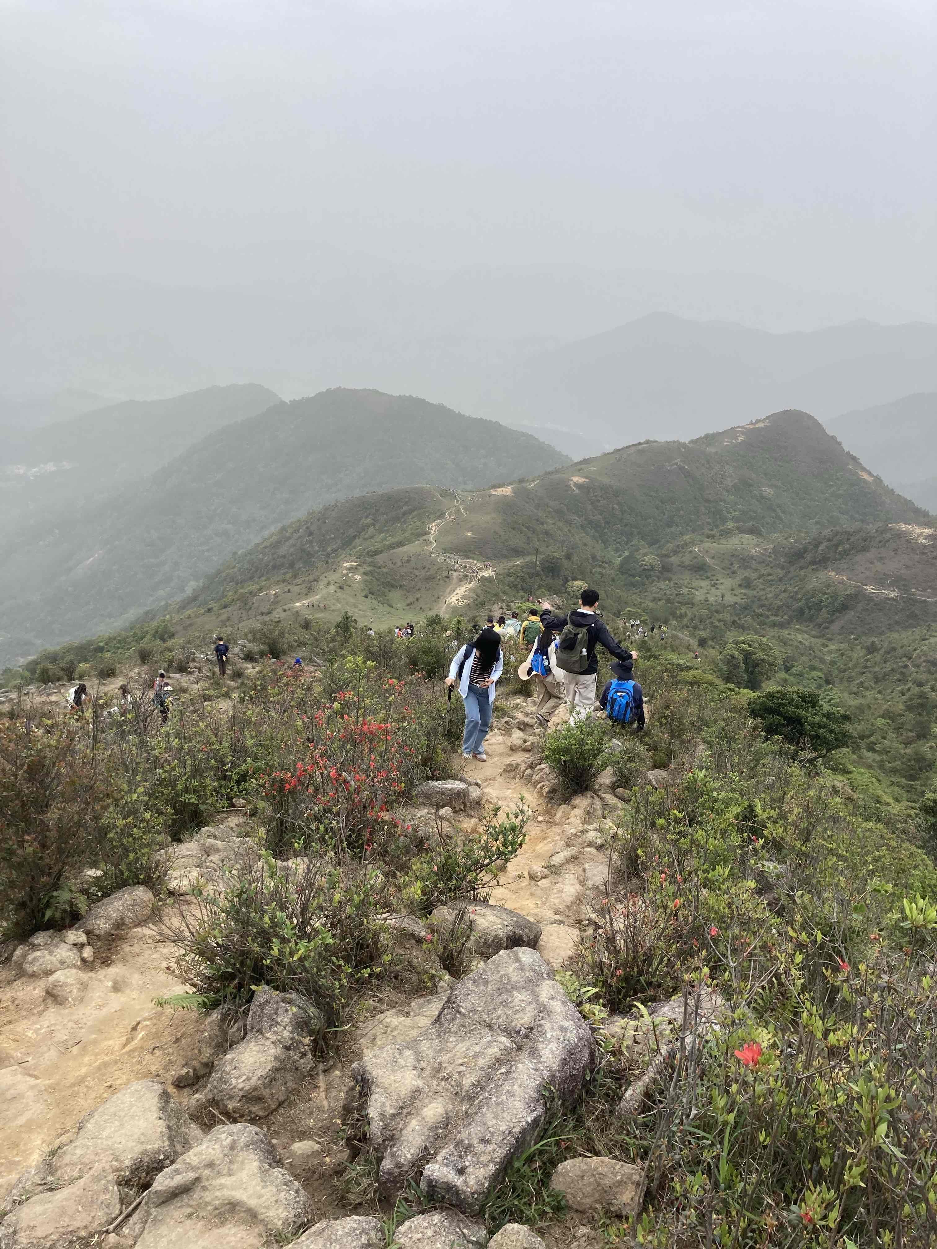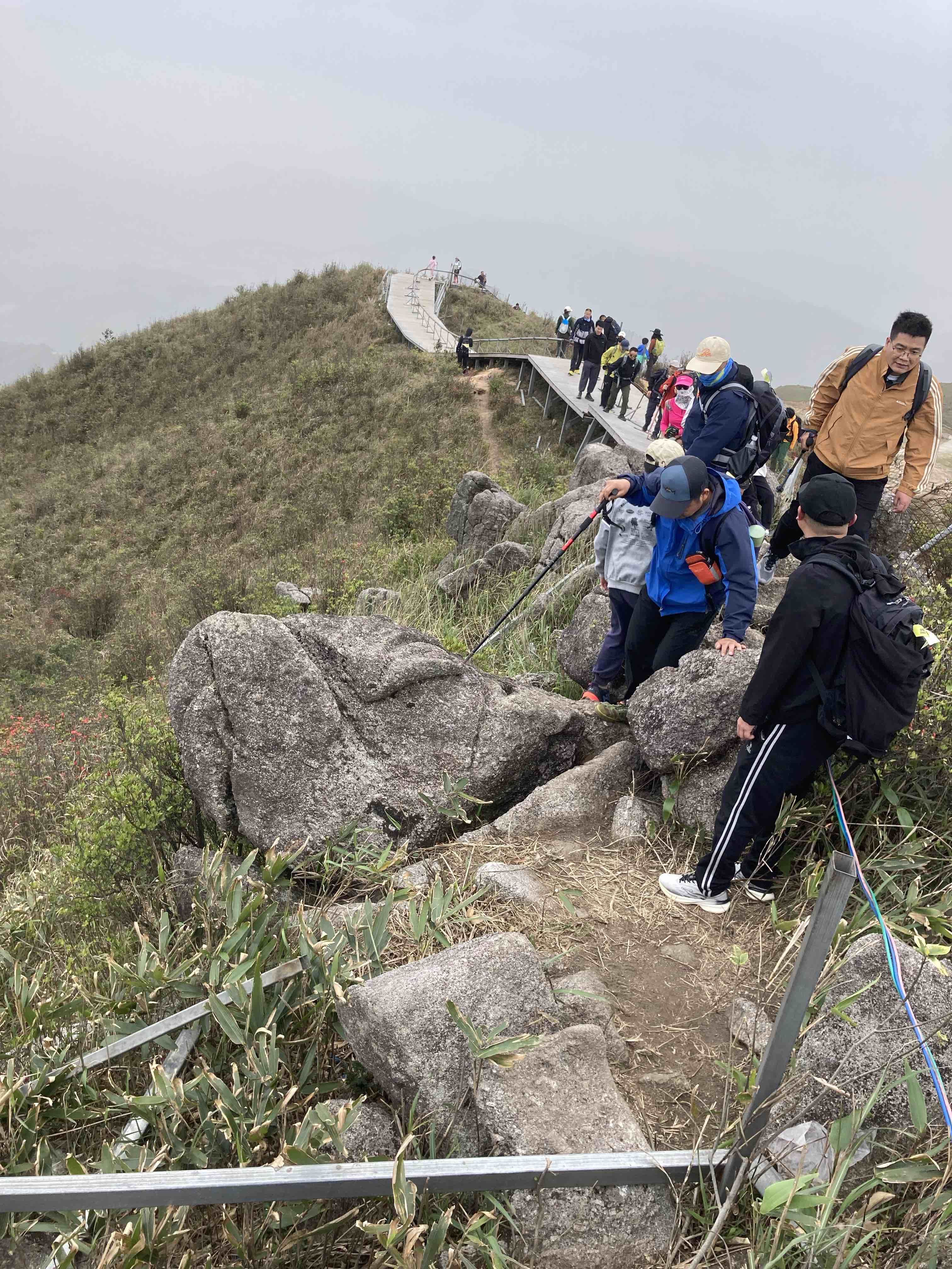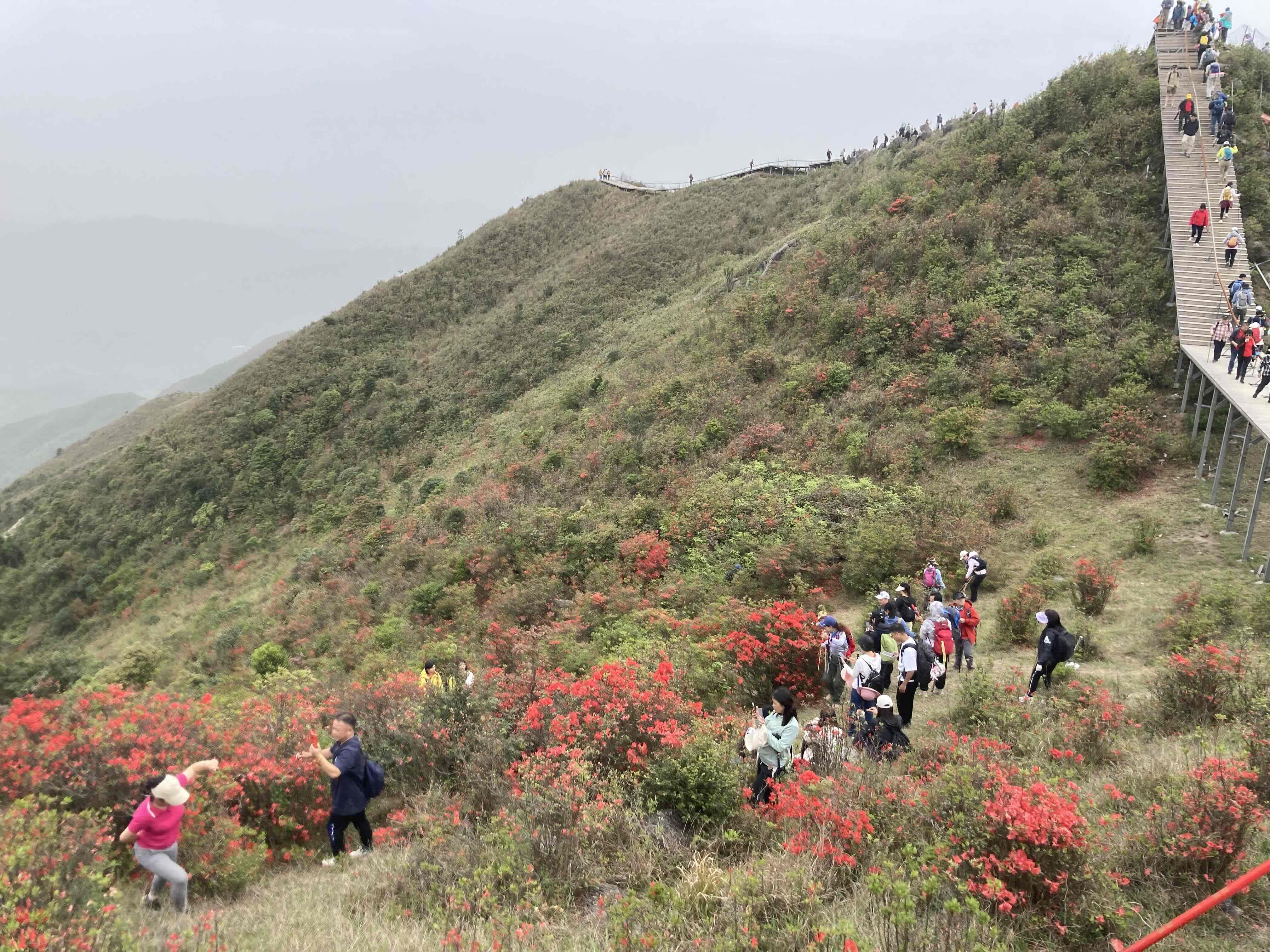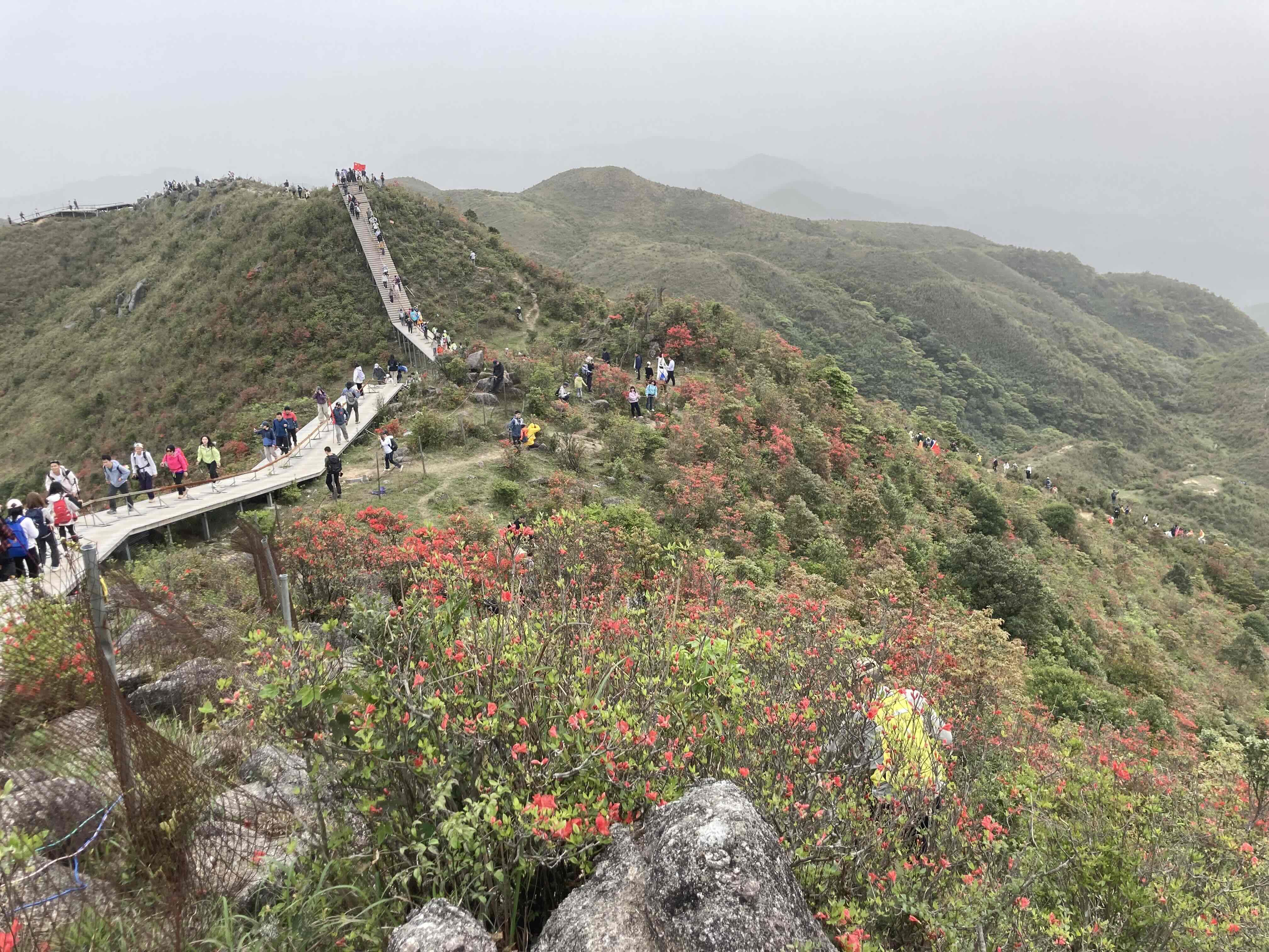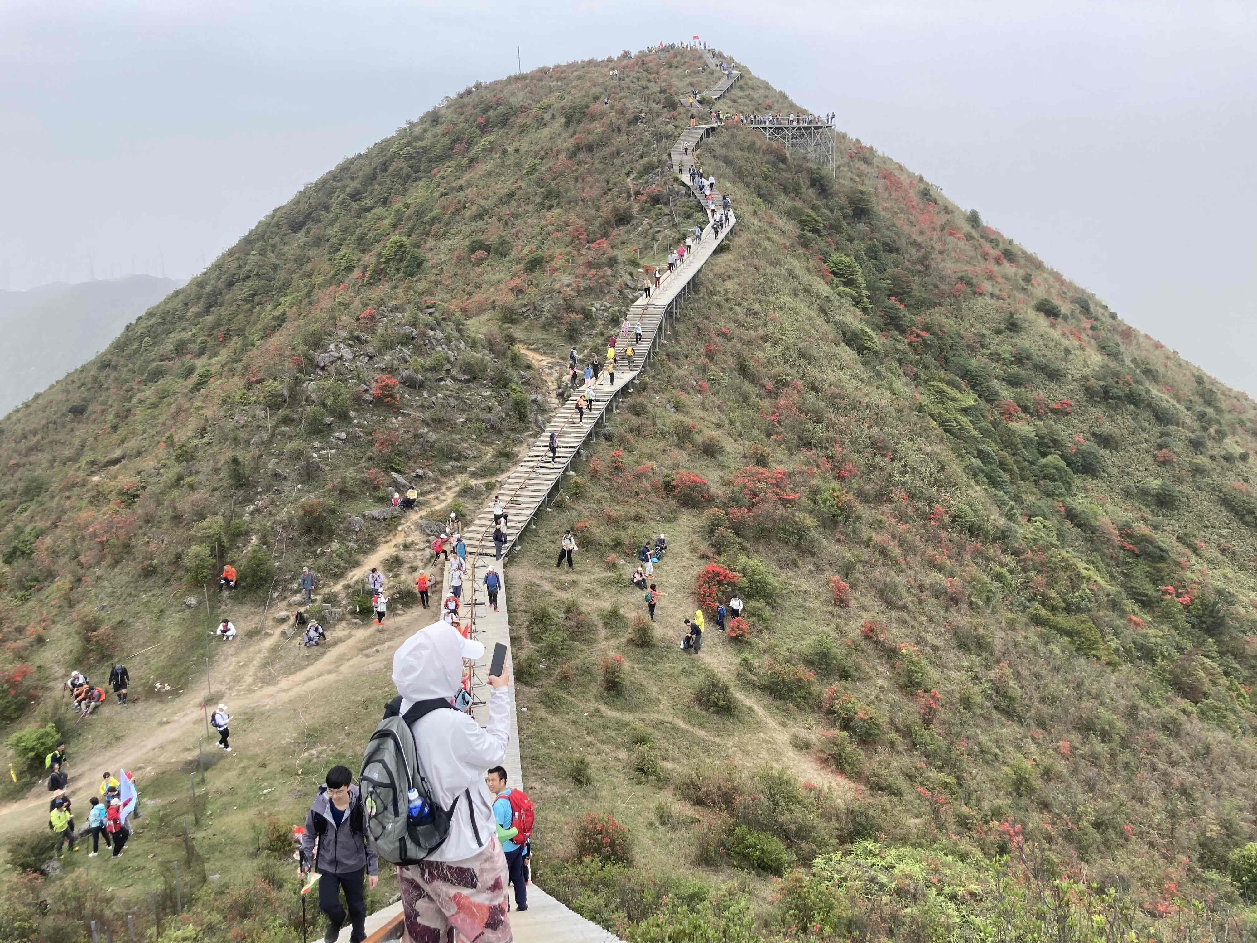 沿着45度陡坡一坡到顶,到达山顶垭口。路上全是杜鹃花。平整的山顶木质栈道在垭口两侧山脊线展开