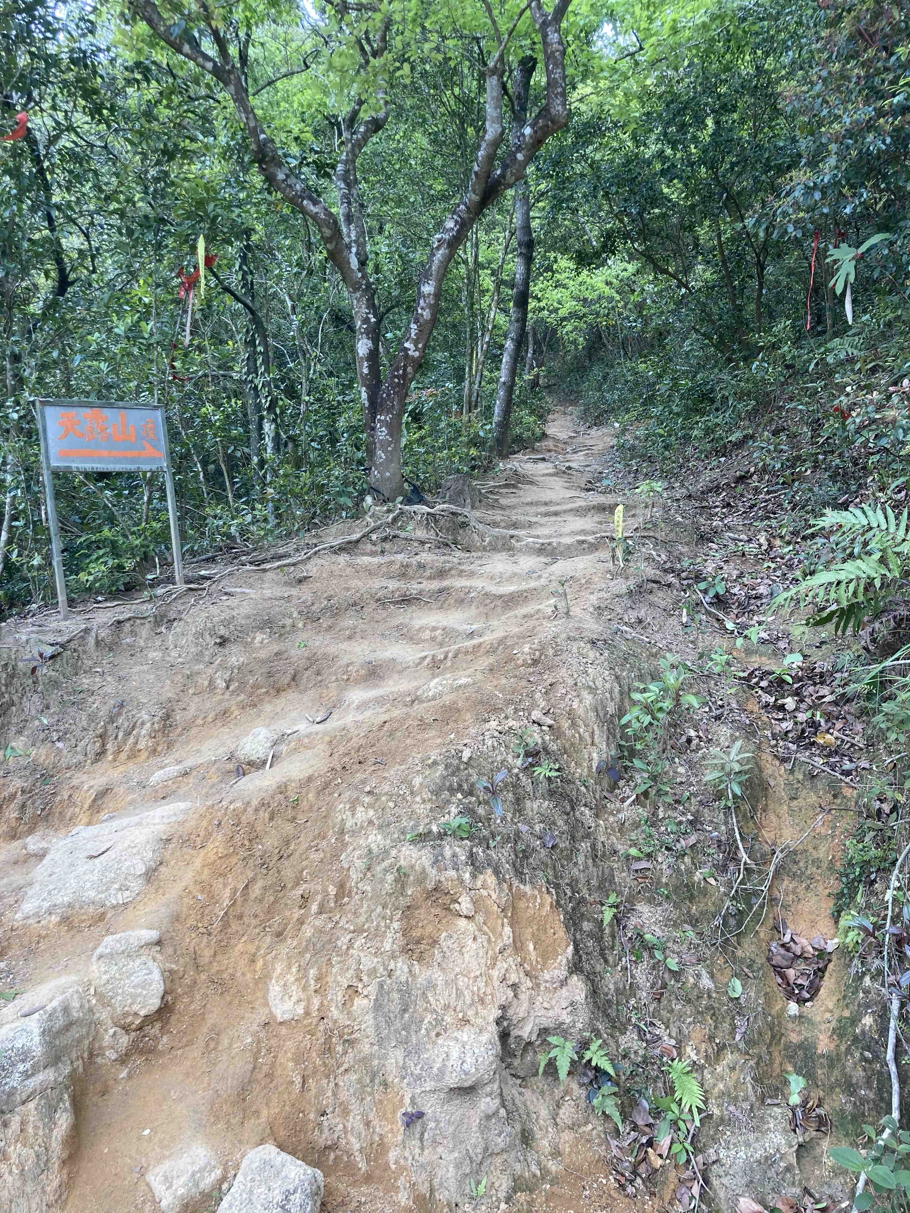 按13.8千米小环线走法到黄窝村后,沿村道上山,走很久以后才到小车自驾游的下车点--天露山林场。后沿变窄的土路盘山而上,到有“天露山”指示牌的真正登山口
